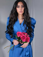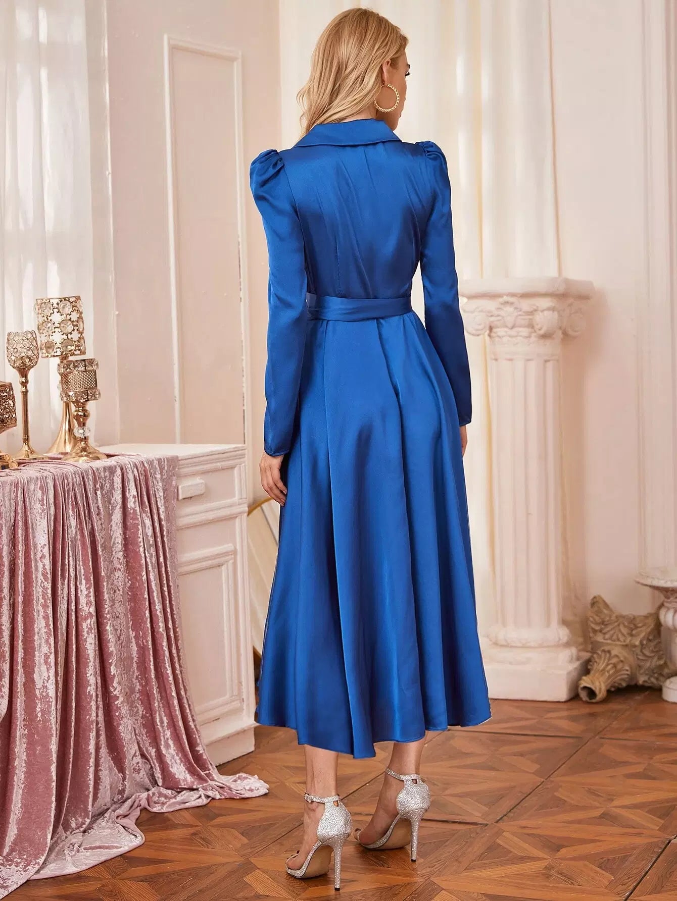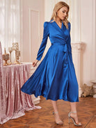 للنساء - فستان من الساتان بياقة شال وأكمام كبيرة وحزام