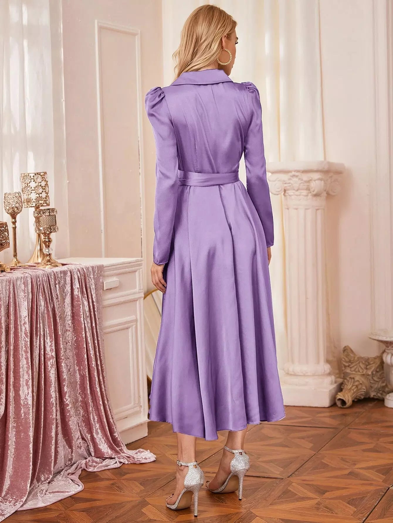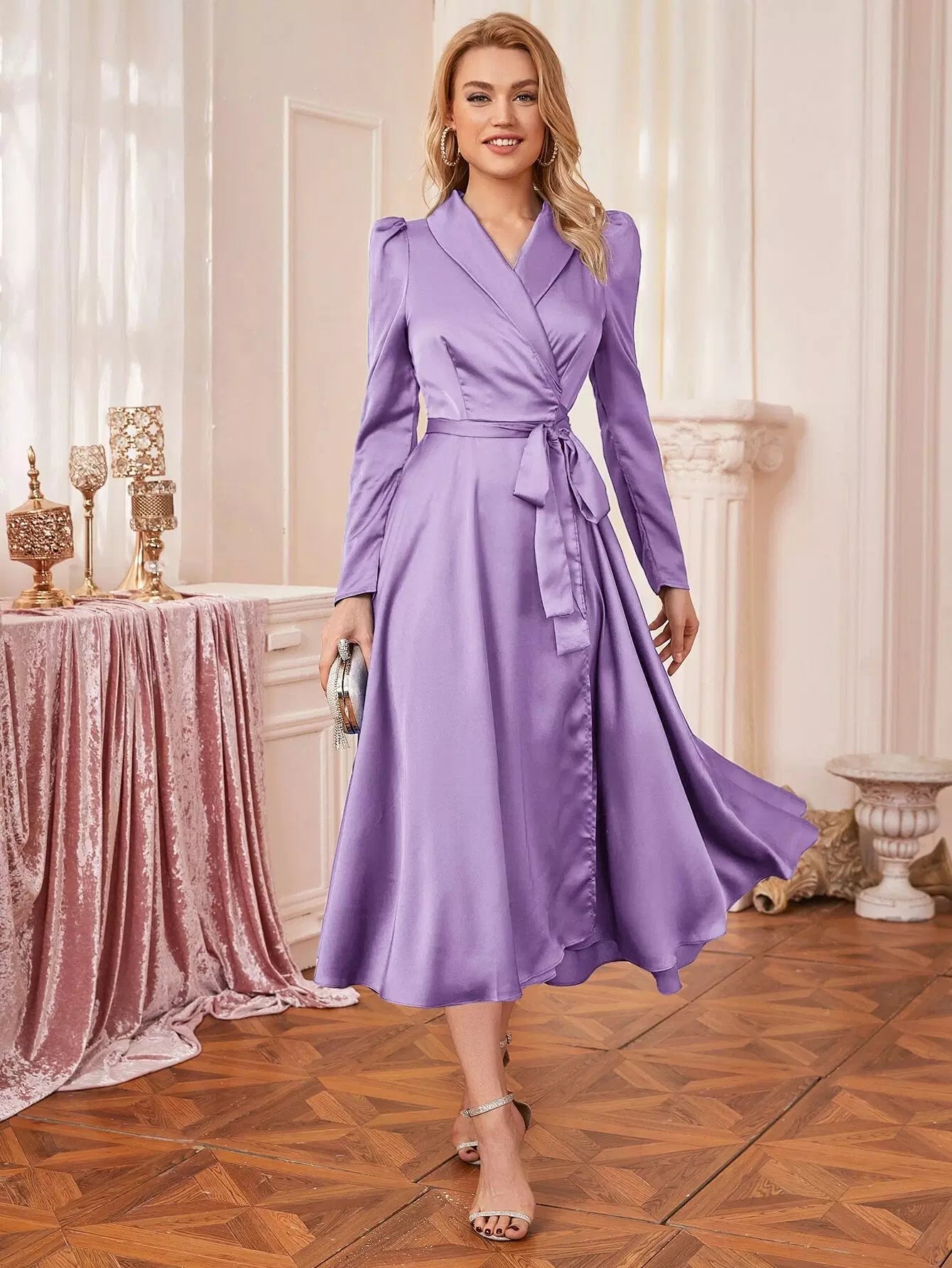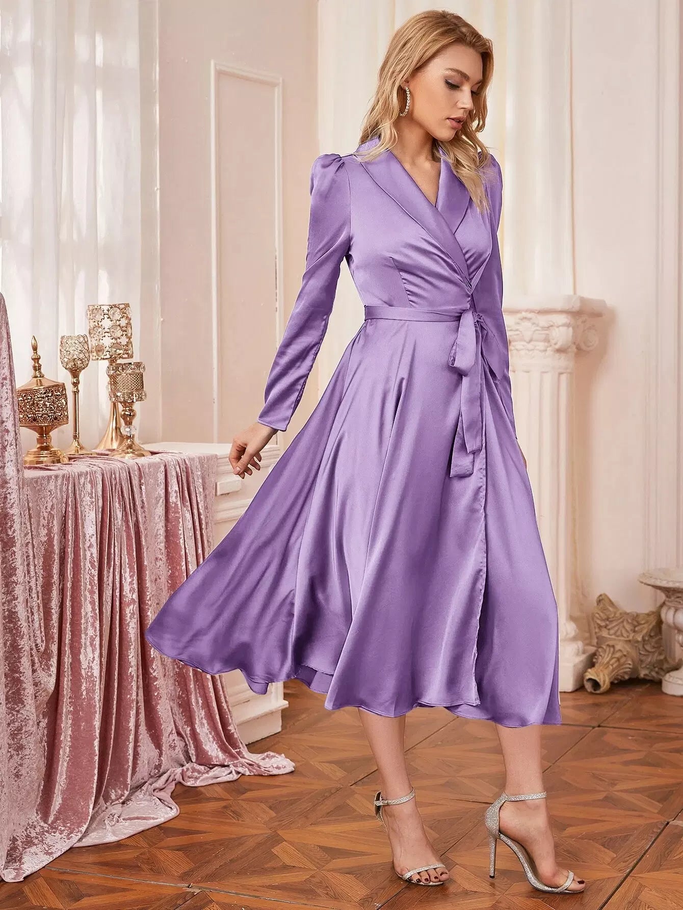 للنساء - فستان من الساتان بياقة شال وأكمام كبيرة وحزام