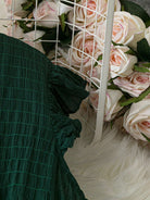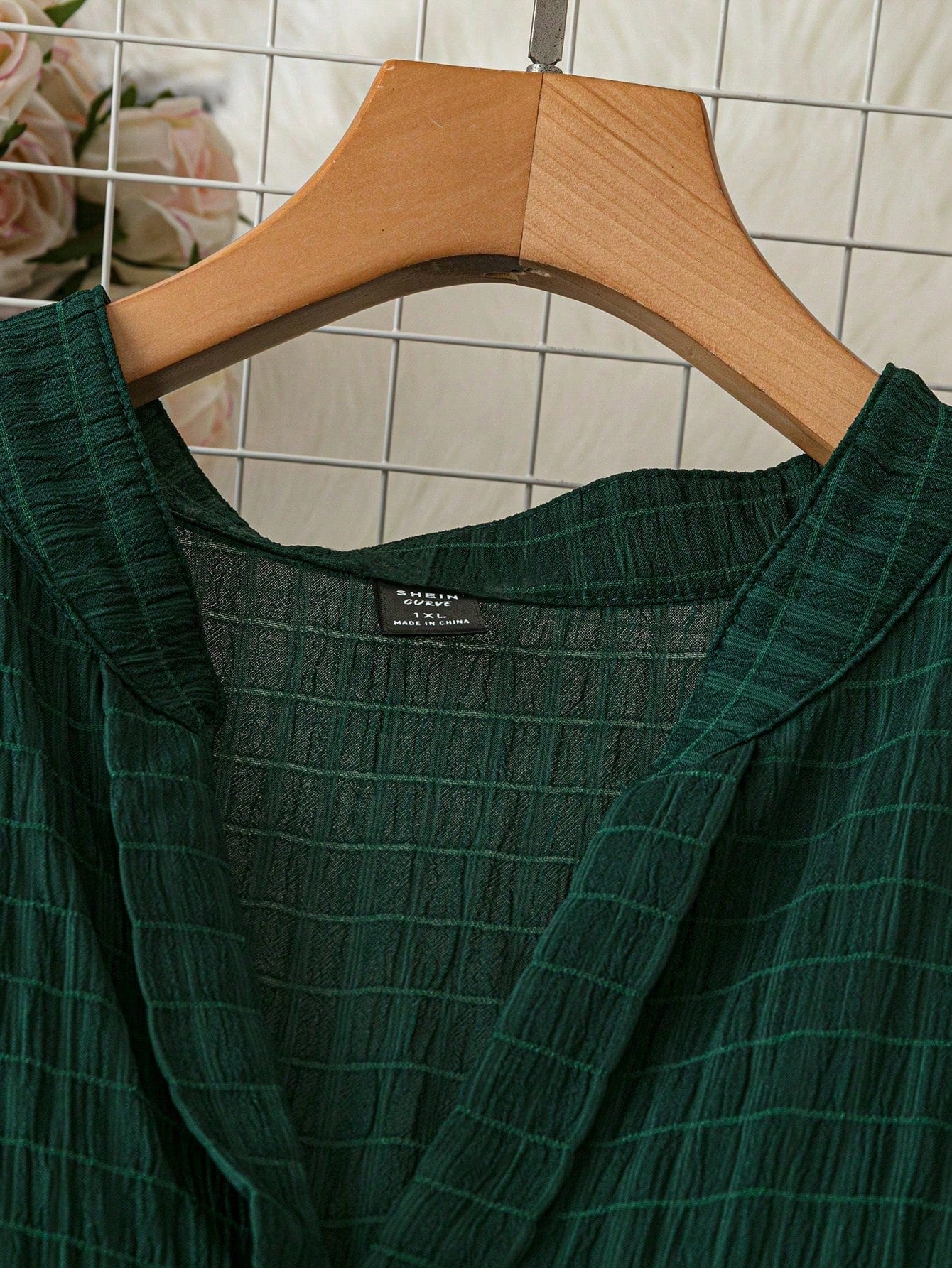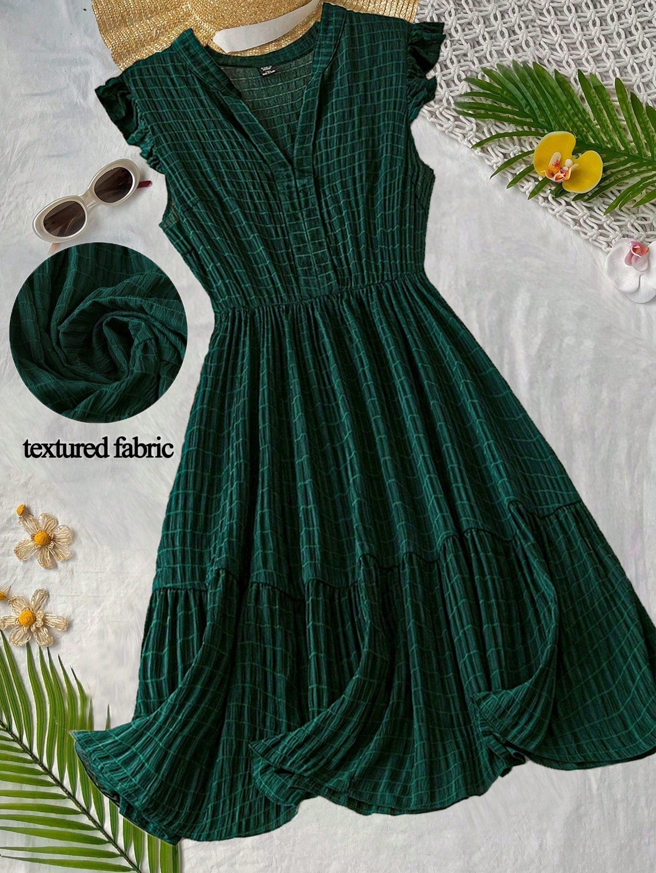 فستان SHEIN Clasi Plus Size نسائي أخضر داكن مطوي من القماش، رقبة دائرية، رقبة على شكل حرف V، أكمام قصيرة مكشكشة، أنيق للعطلات