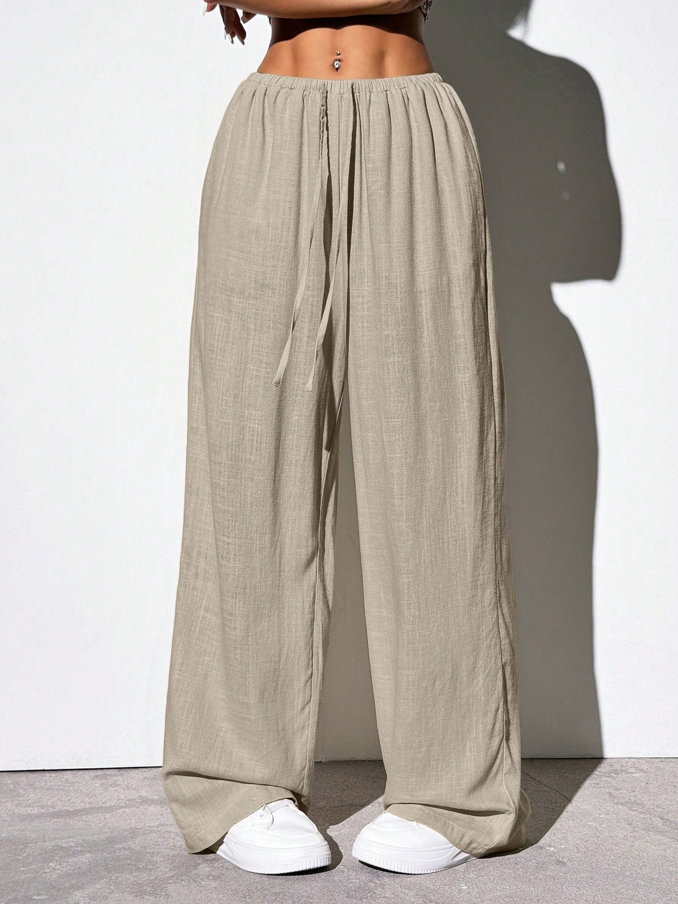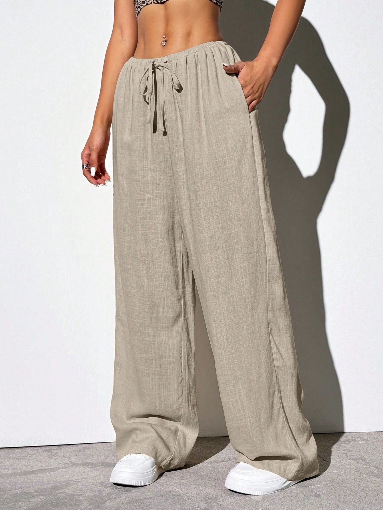 SHEIN EZwear Khaki Women's Loose Drawstring Waist Woven Wide Leg Casual Pants