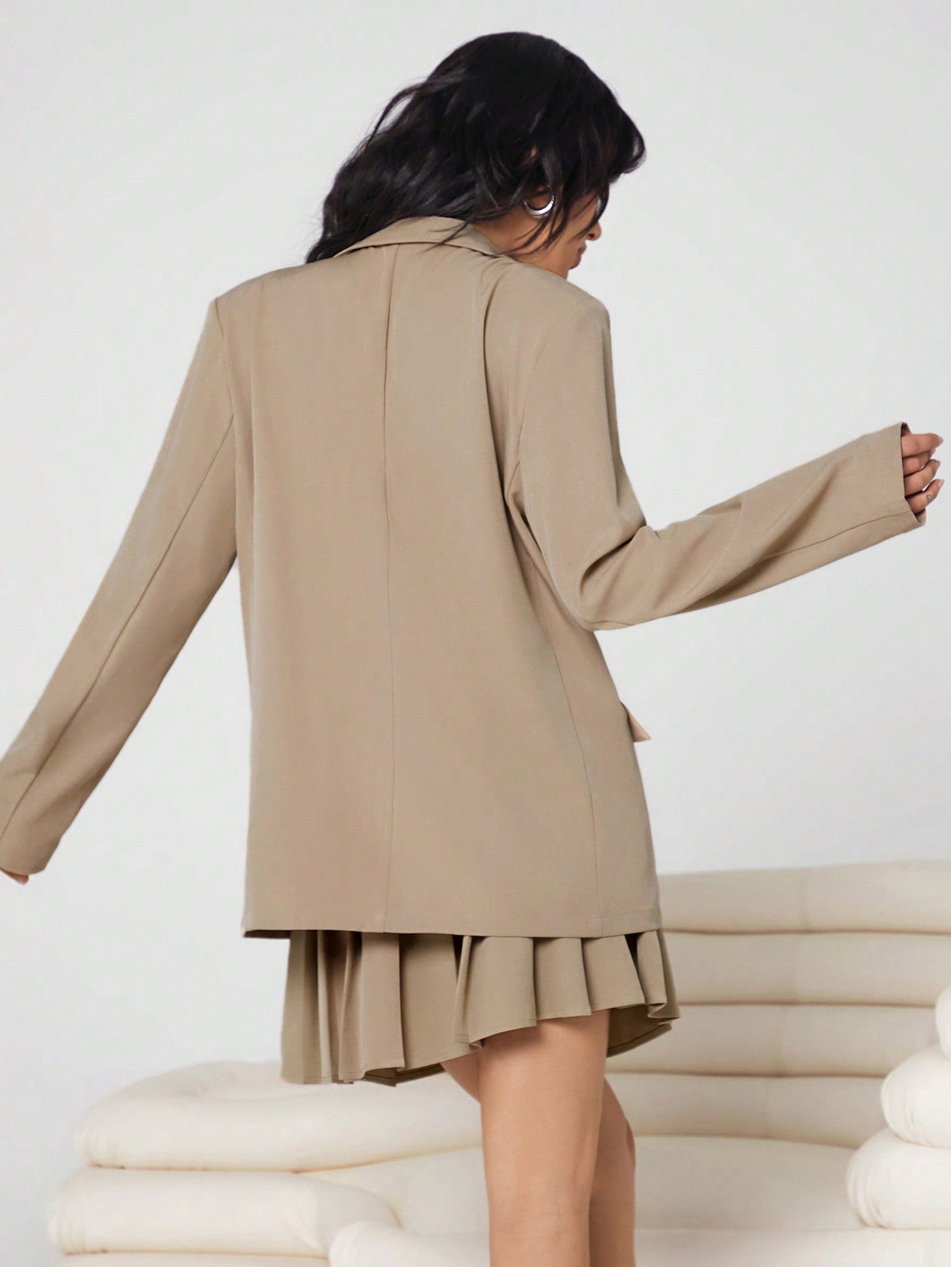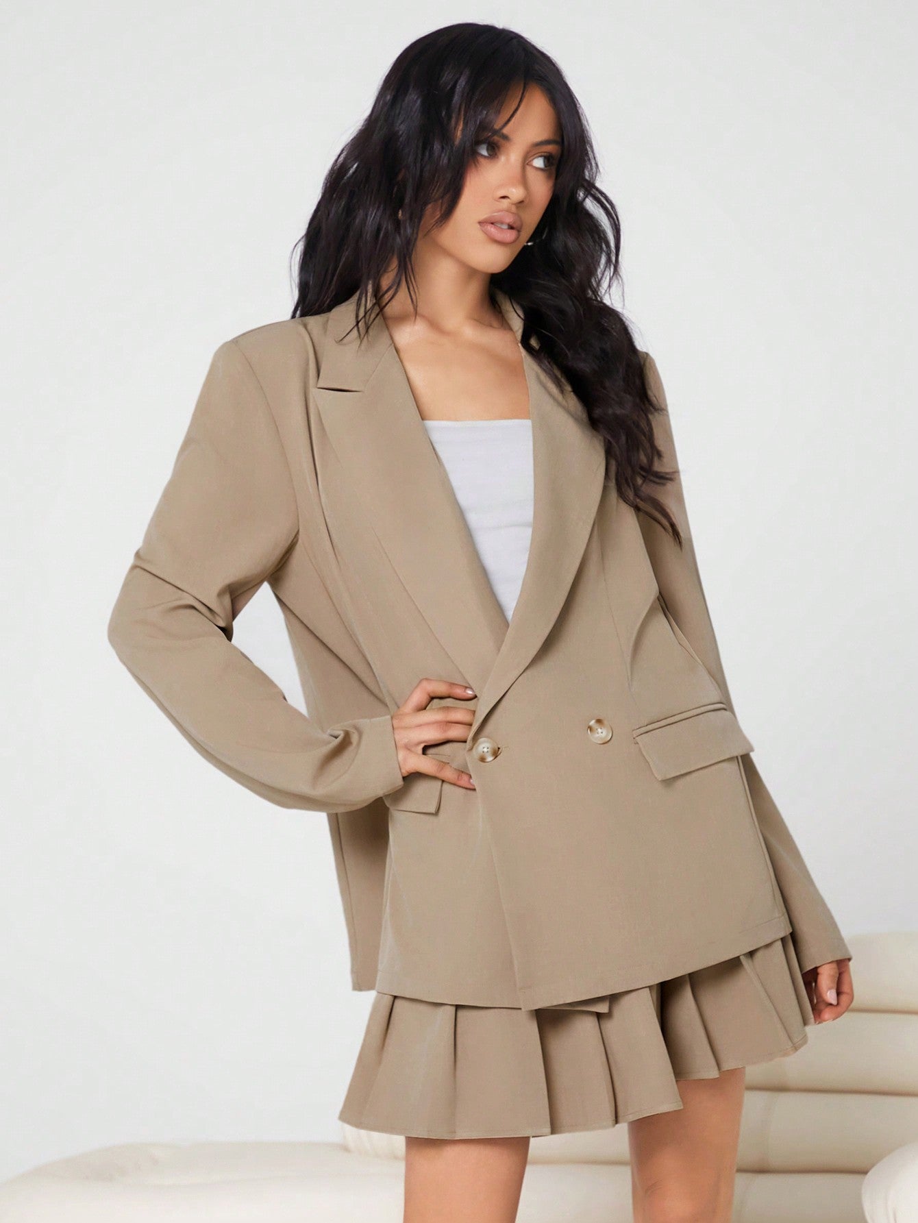 طقم بدلة كاجوال من SHEIN EZwear للنساء، مكون من بليزر كبير الحجم وتنورة مطوية، بدون حزام