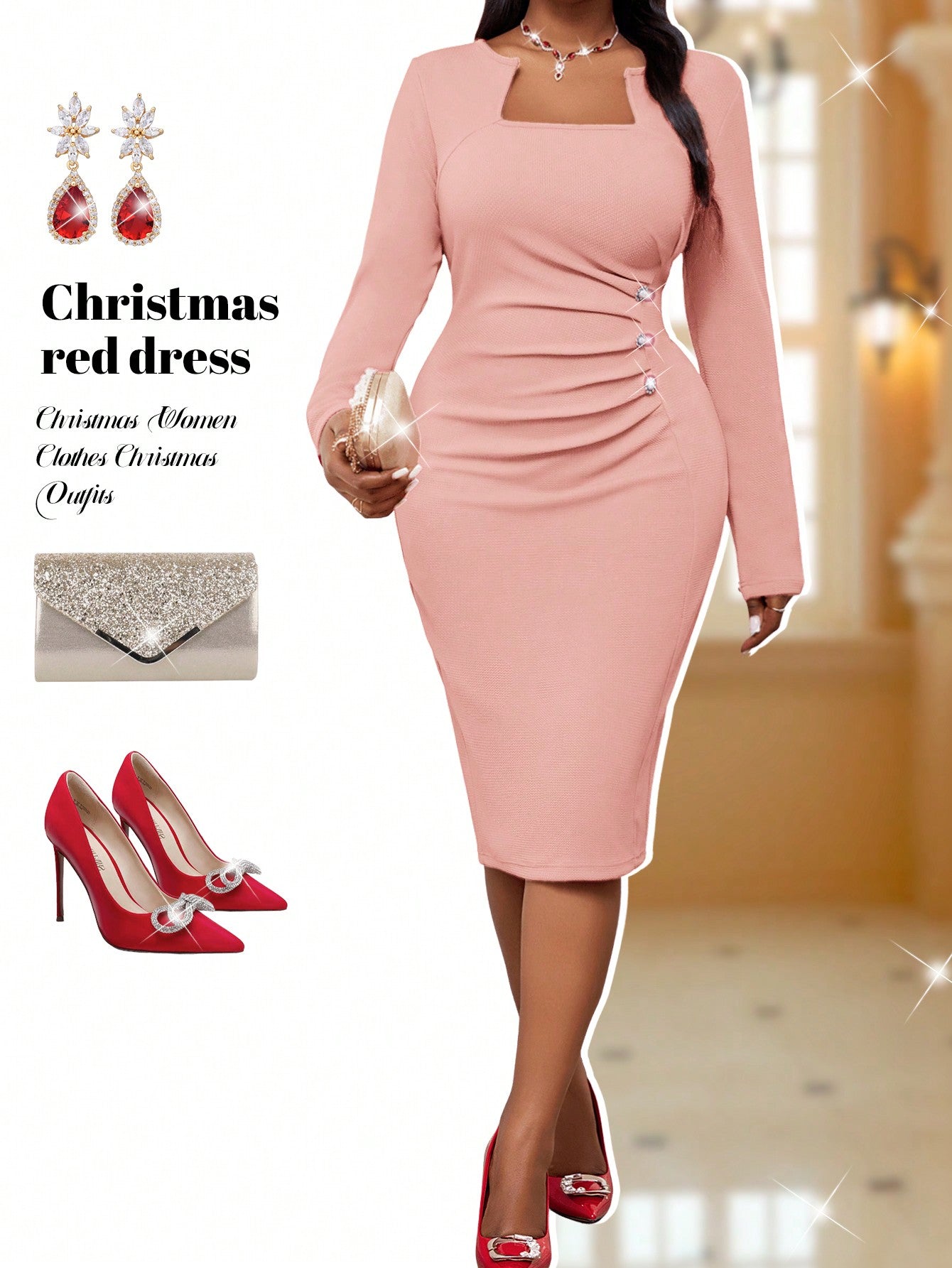فستان SHEIN Lady خريفي وشتوي أنيق أحمر محبوك بأكمام طويلة مقاس كبير جديد فستان حفلة موسيقية فستان أزرق ملابس المهرجانات فستان وصيفة العروس فستان وصيفة العروس