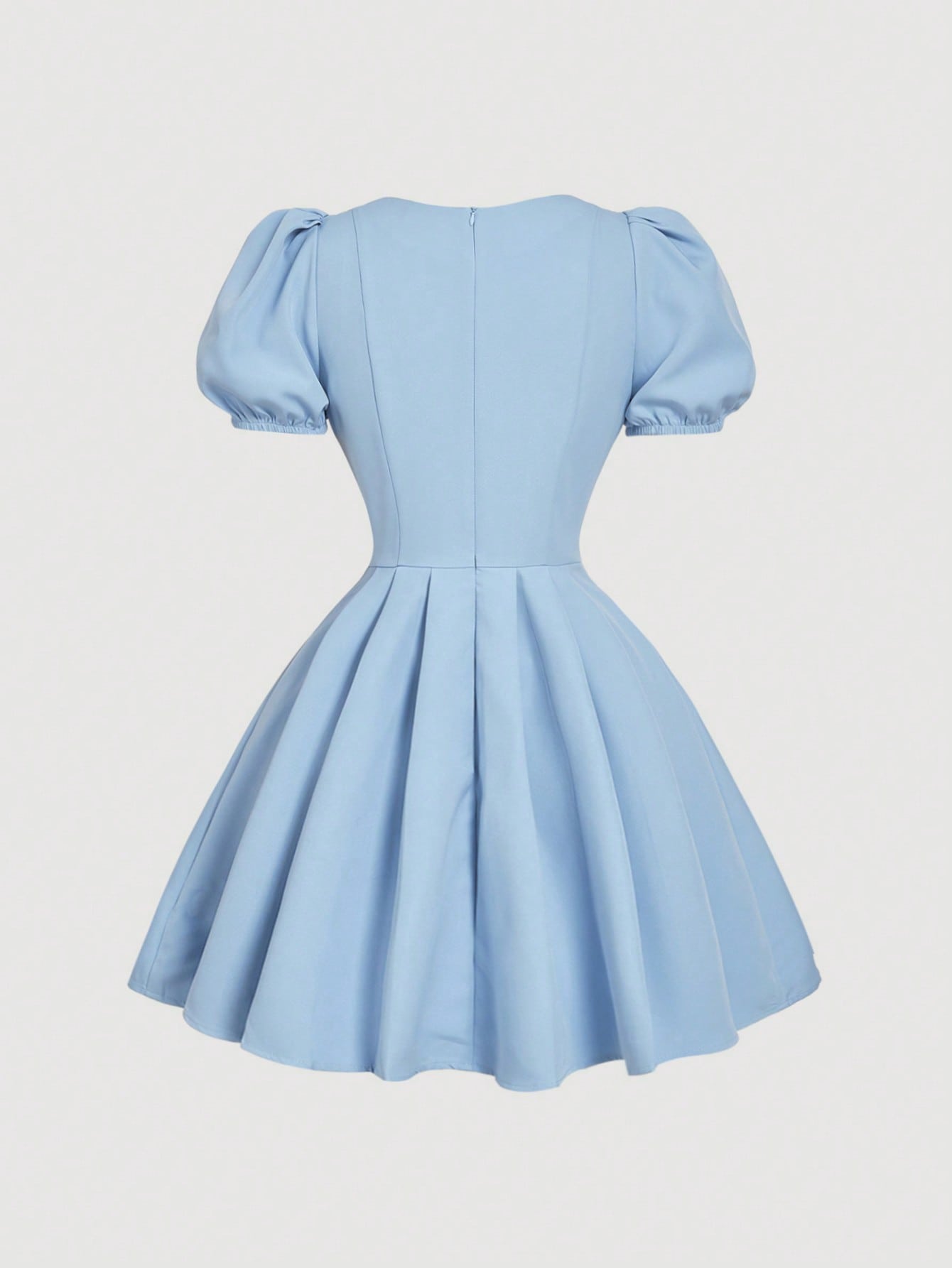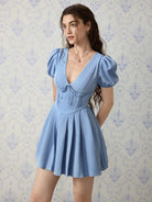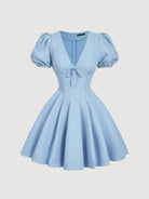 women SHEIN MOD Women's Puff Sleeve V-Neck Blue Bow Casual Dress