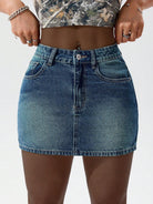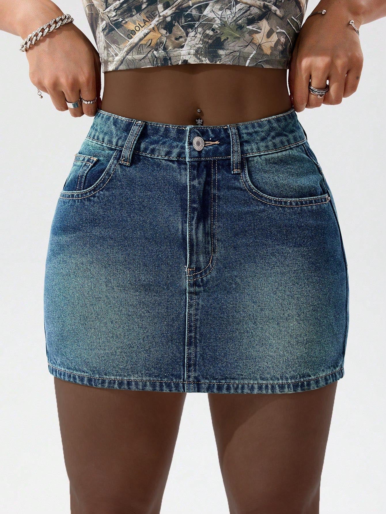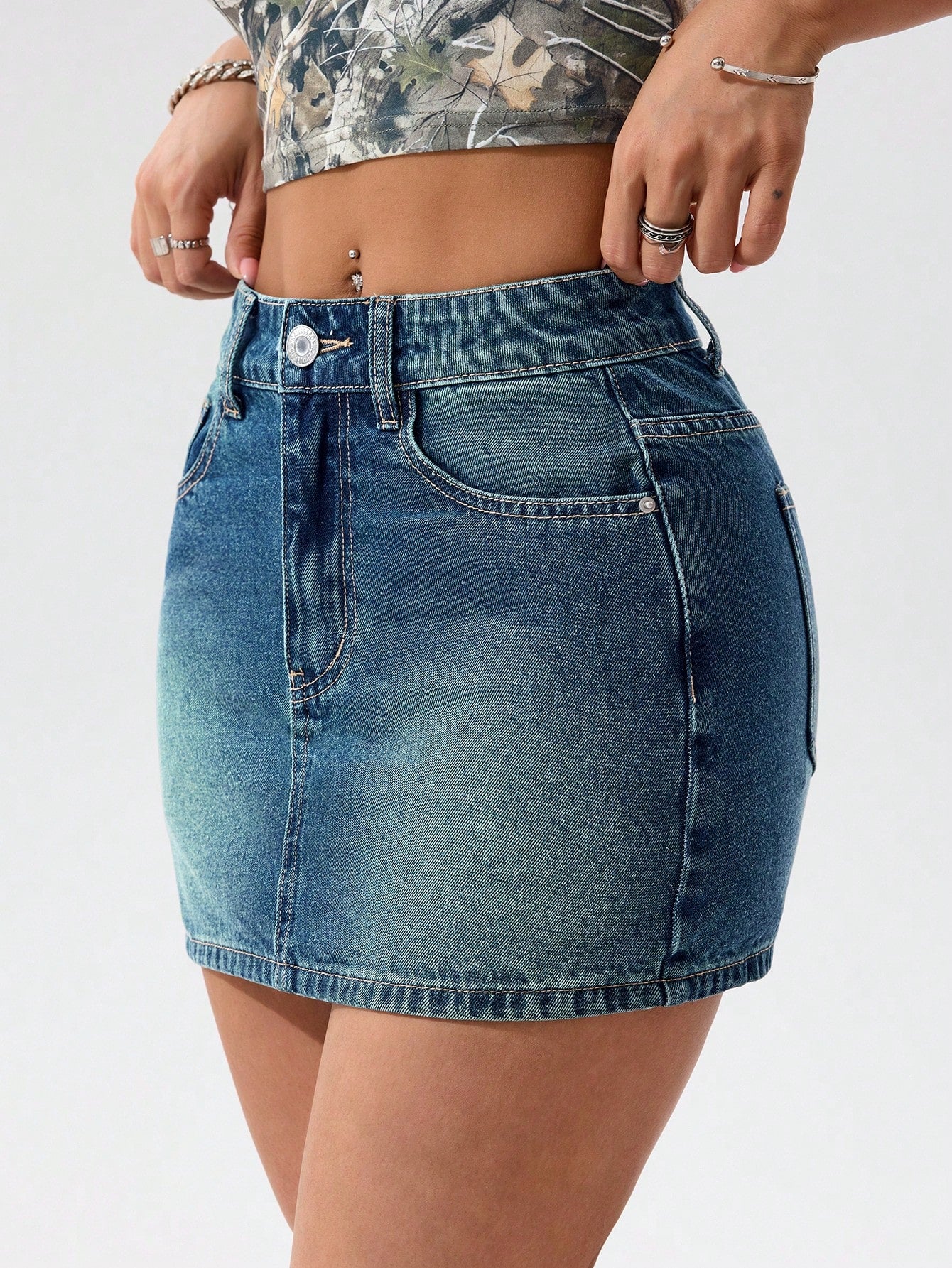 women SHEIN PETITE Women's Summer Casual Washed Side Pockets Bodycon Denim Mini Skirt
