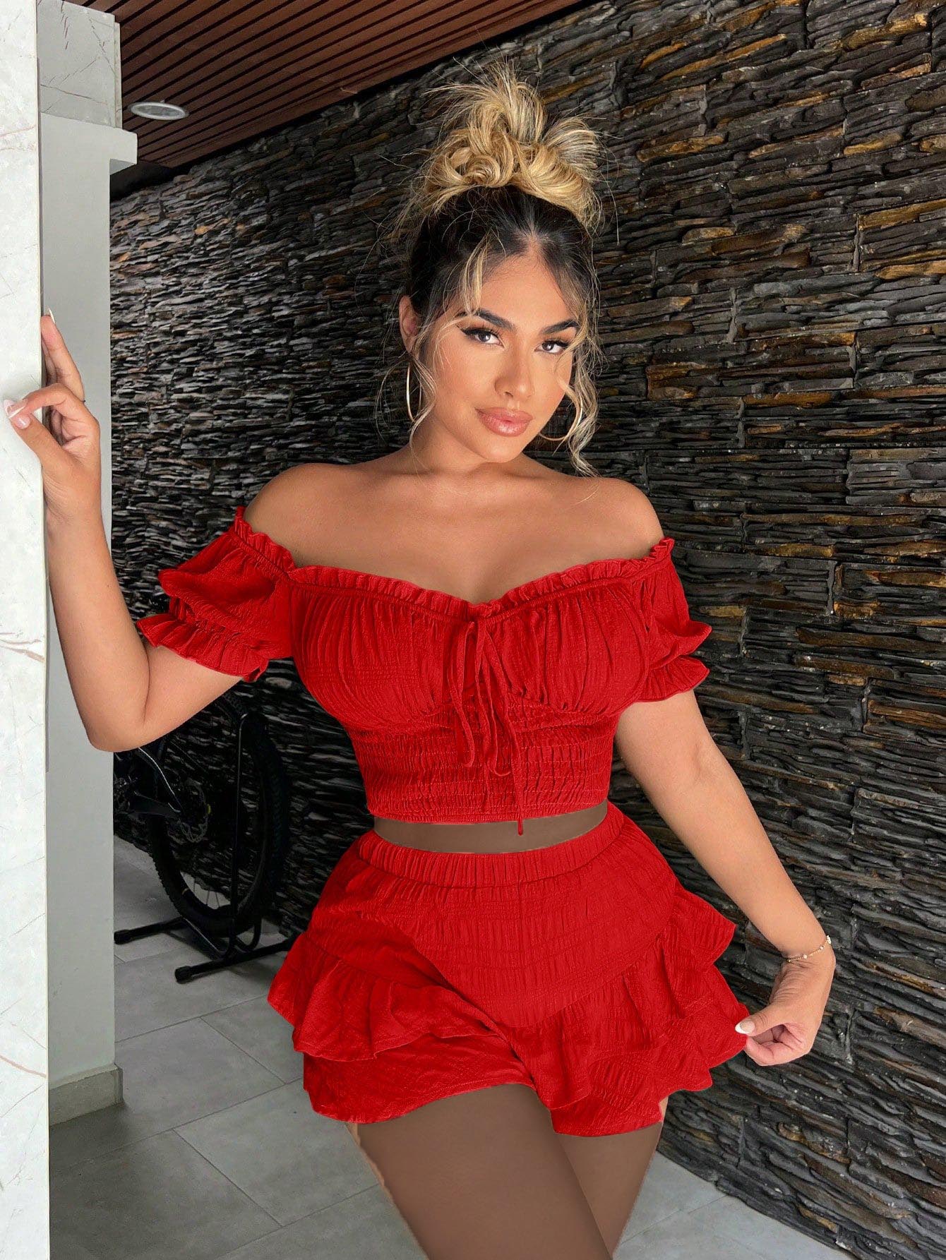 شورت نسائي فضفاض من SHEIN SXY Beach;Summer مصنوع من القماش المزخرف باللون الأخضر ومزين بكشكشة