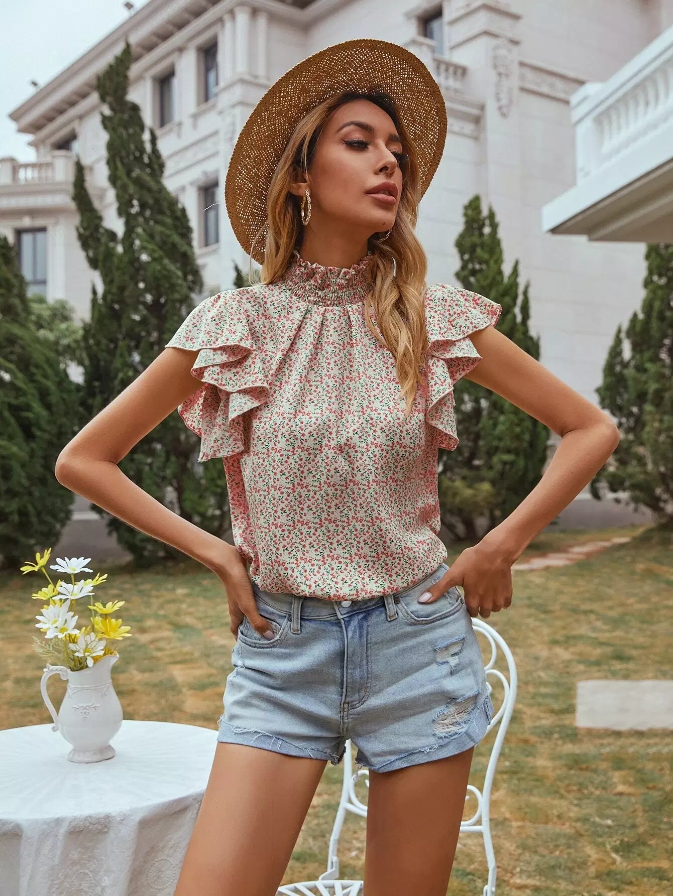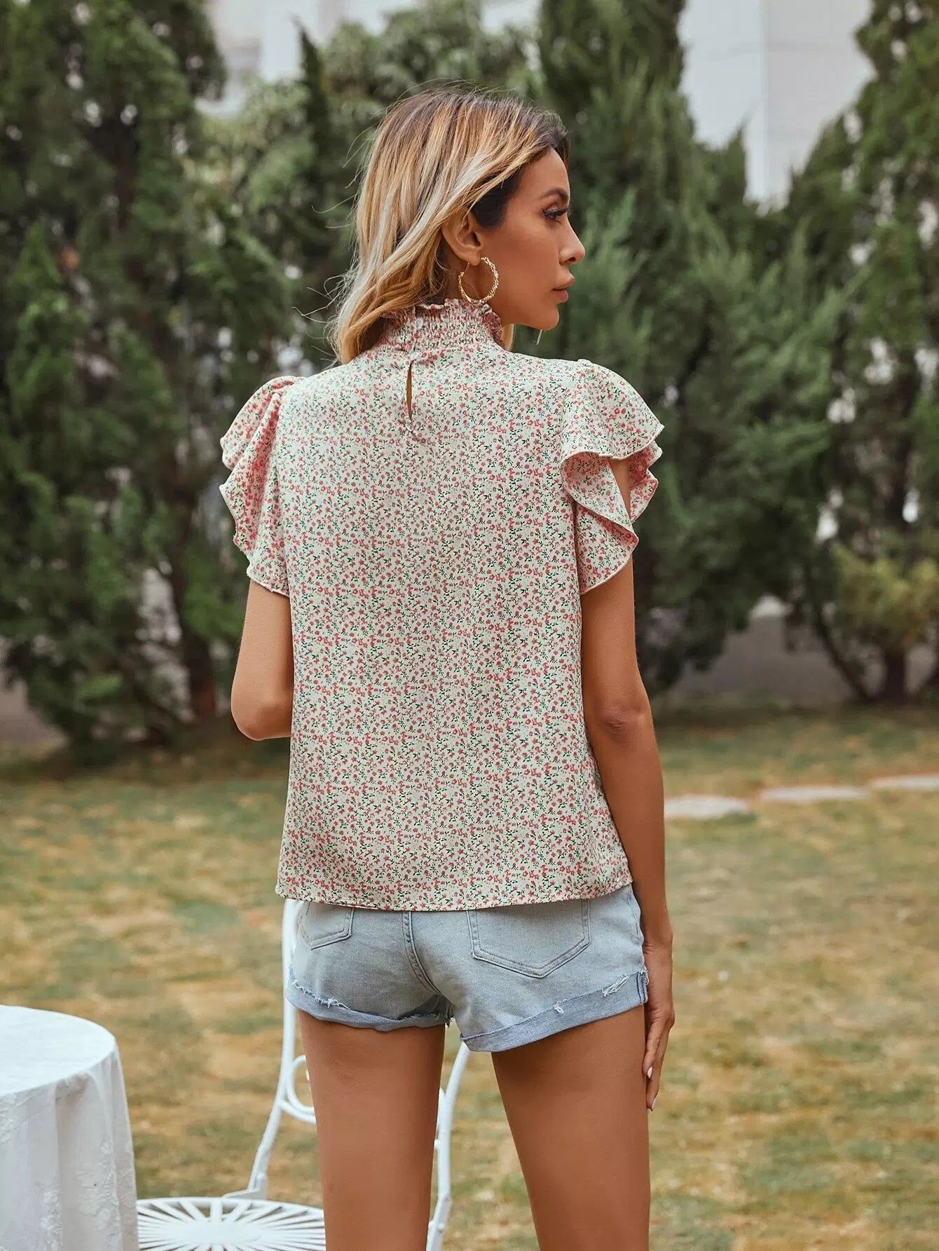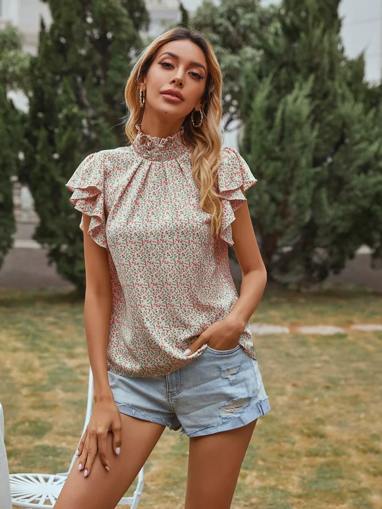 بلوزة ديتسي مزينة بالورود برقبة دائرية بفتحة رقبة دائرية