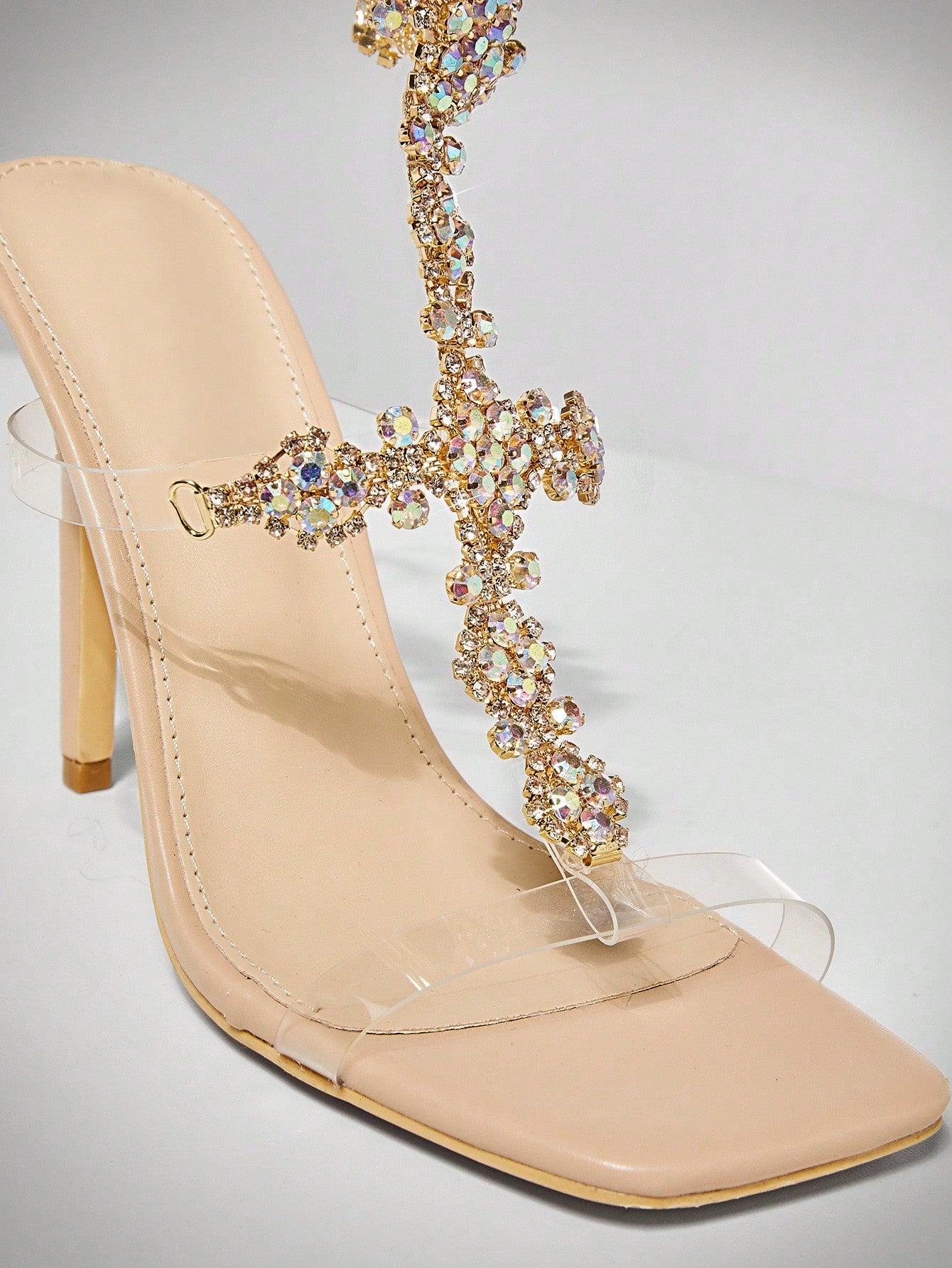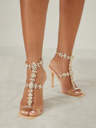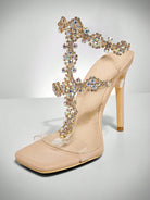 حذاء شوزيا بكعب عالٍ مفتوح من الأمام مزين بأحجار الراين وحزام للكاحل، مثالي لعيد الميلاد.