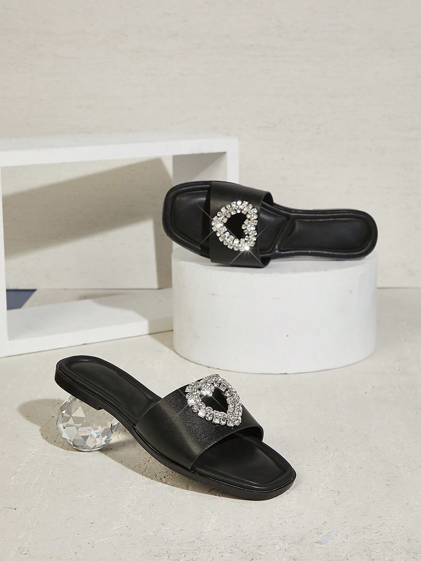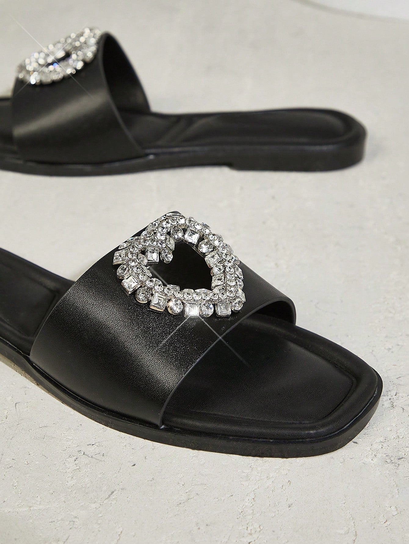 صندل نسائي من SHUZIA ذو تصميم أنيق ومريح من إسفنج الذاكرة بتصميم قلب من أحجار الراين مفتوح من الأمام ومسطح من البولي يوريثان باللون الأسود - أنيق