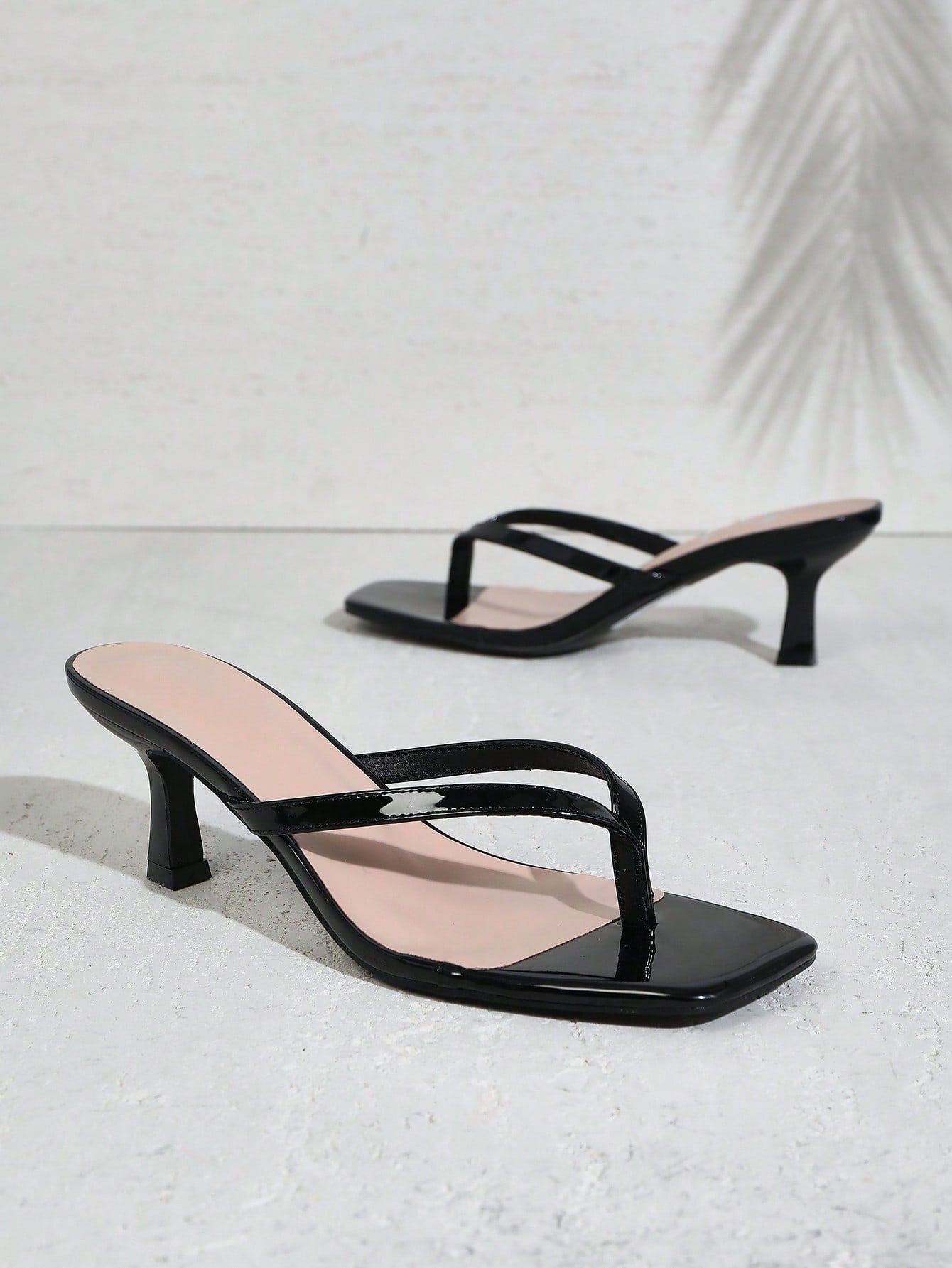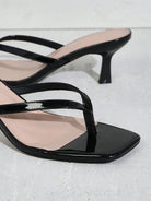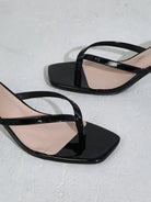 صندل نسائي أسود لامع من شوزيا، ذو مقدمة مربعة وكعب صغير، مزود بأشرطة رفيعة - أنيق