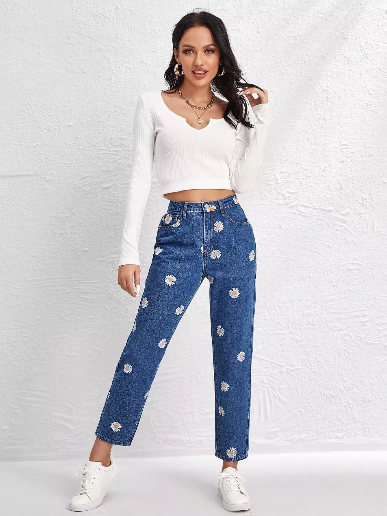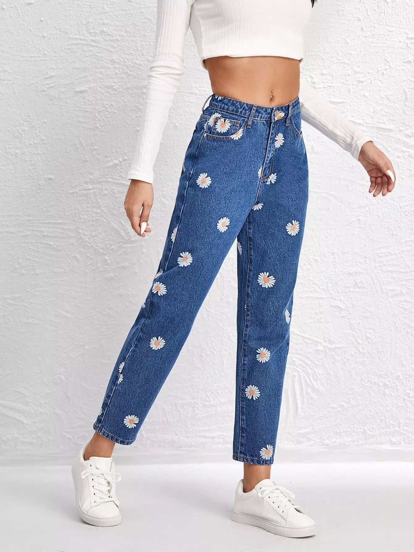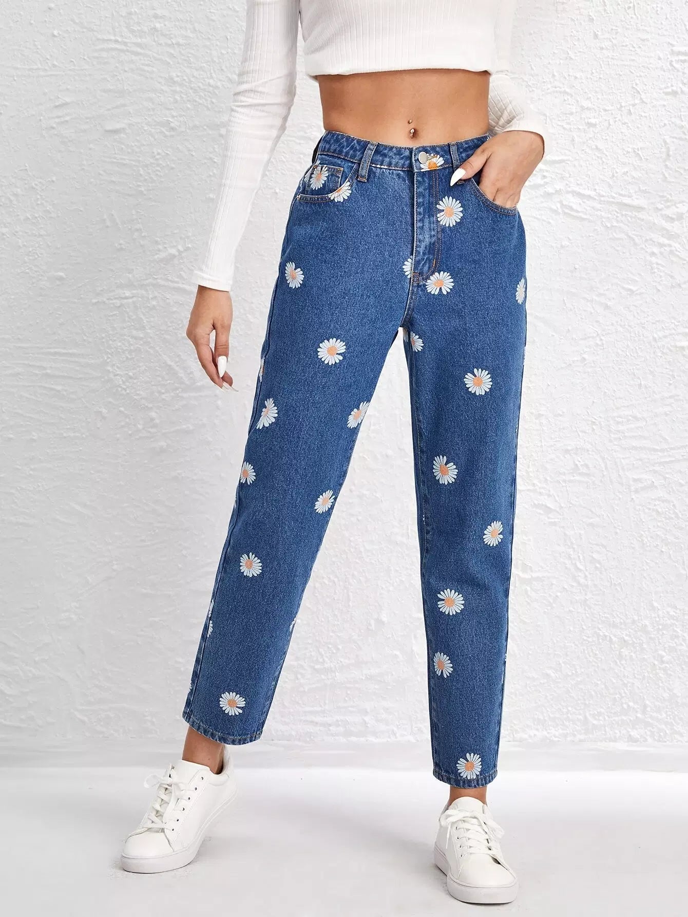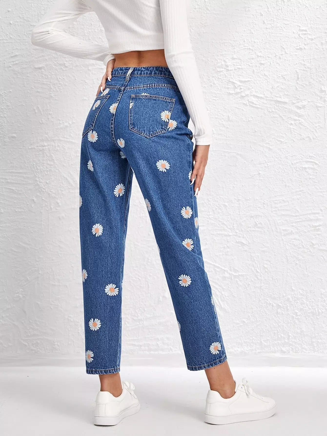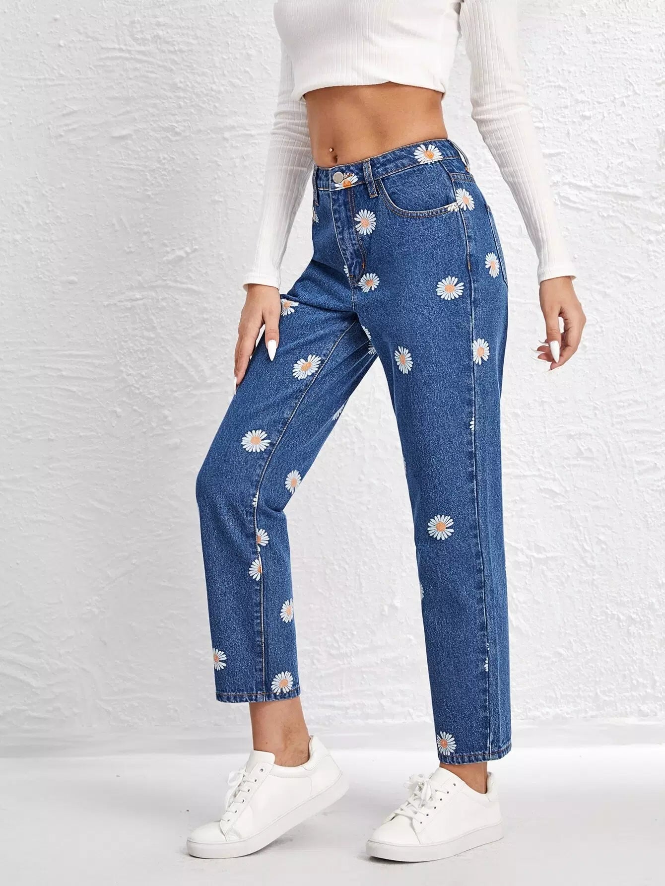 بنطلون جينز بجيب مائل بطبعة ديزي بساق مستقيمة
