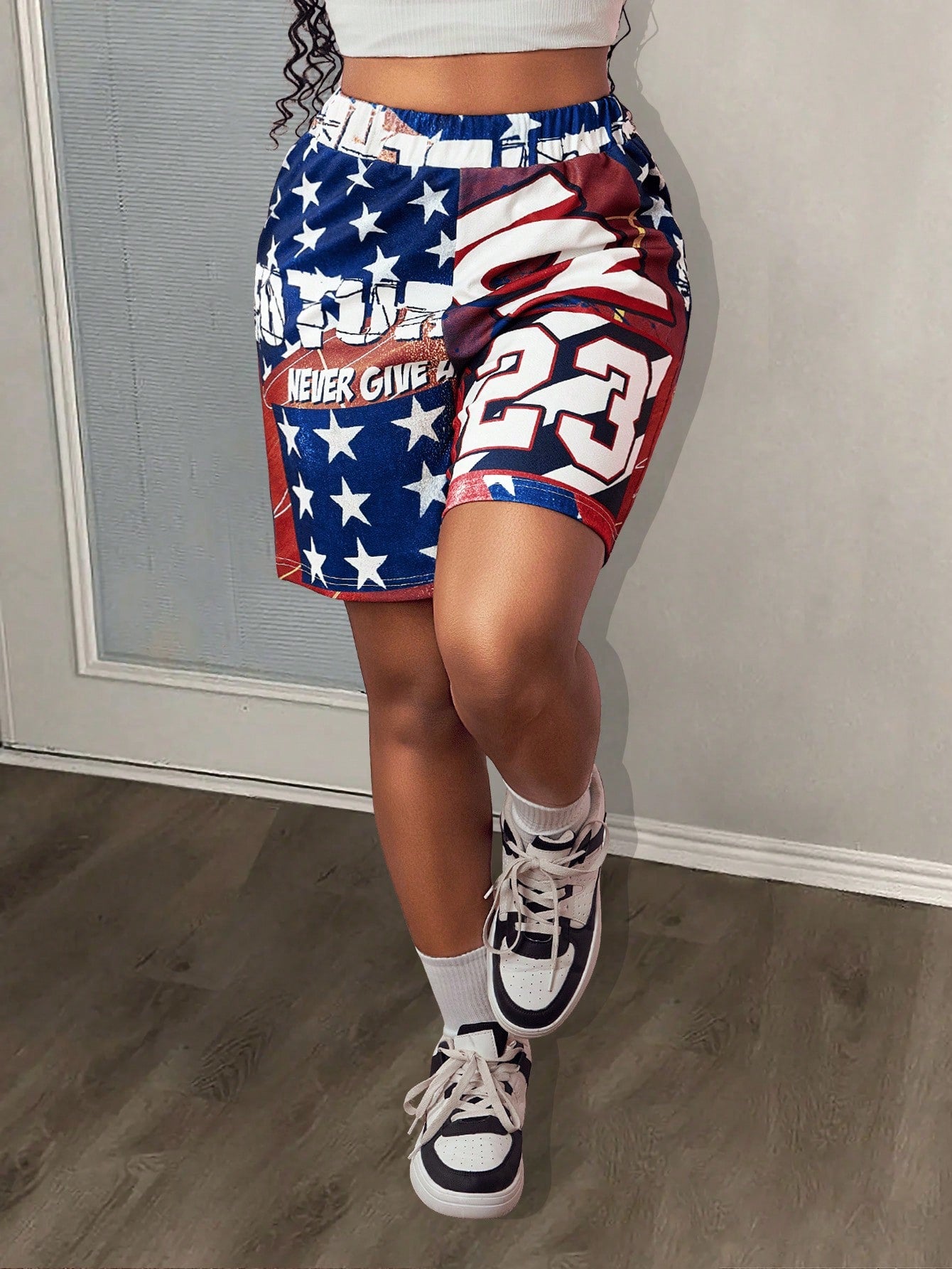 Slaydiva 25 Years New Sports Style Casual Street Pants Straight Pants Five-Quarter Pants Star Number Color Printed Women's Shorts-A