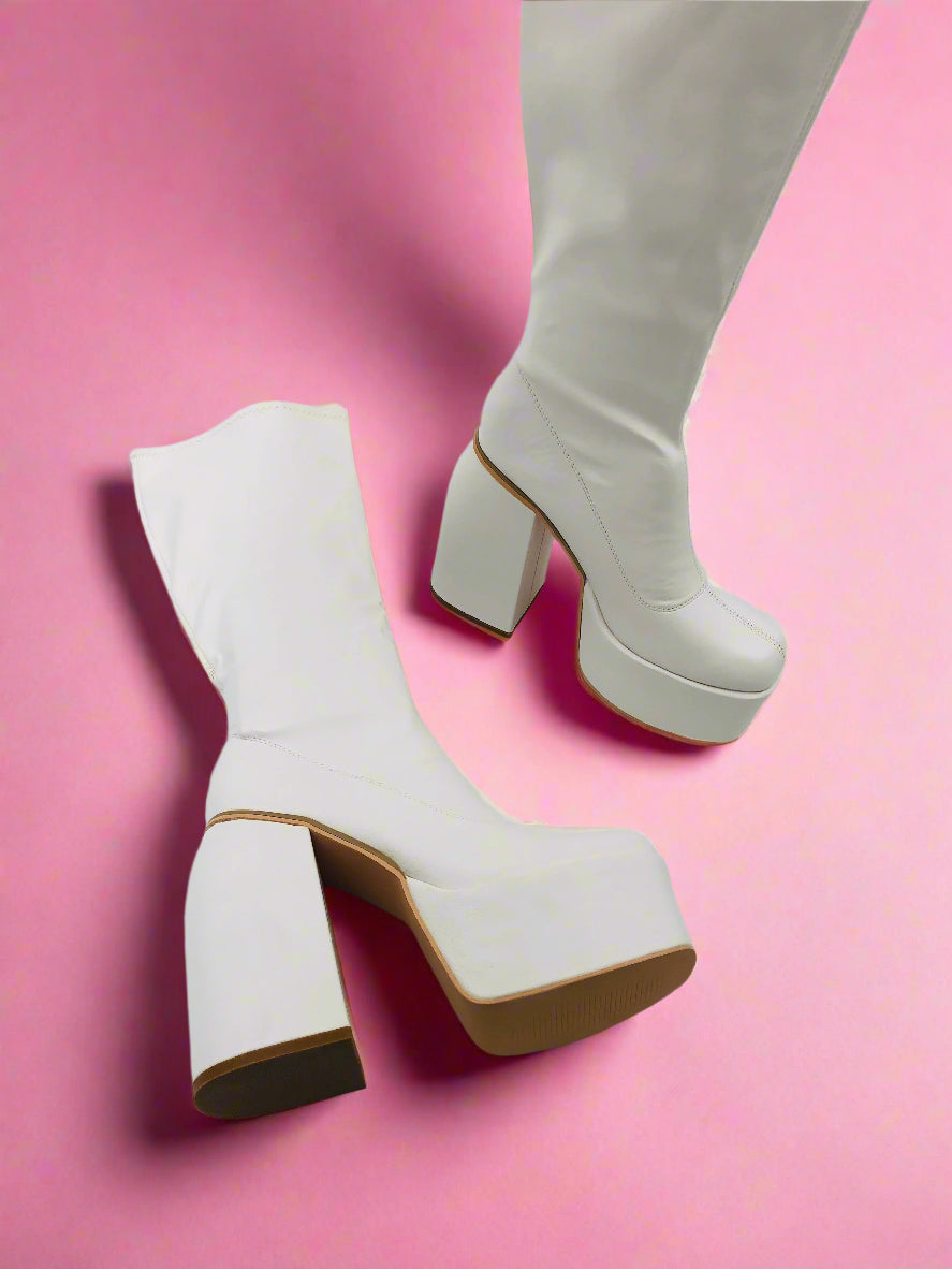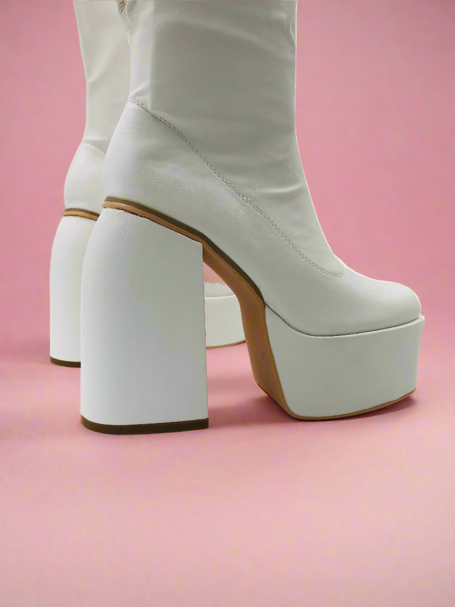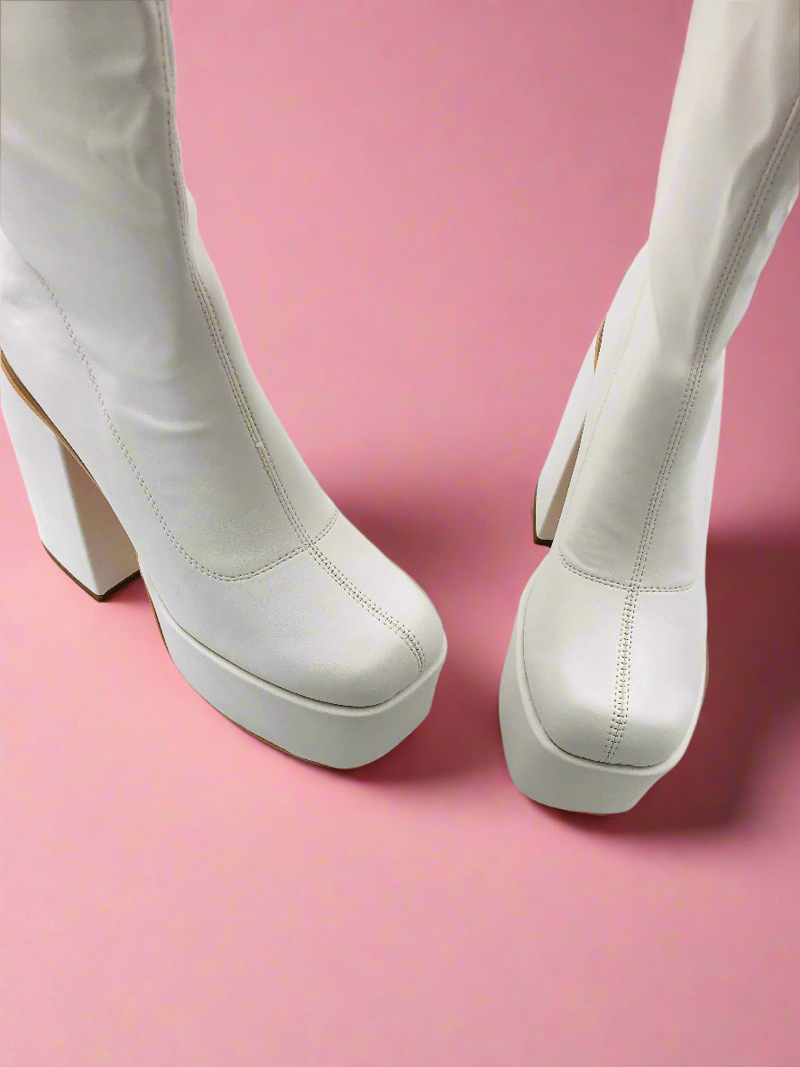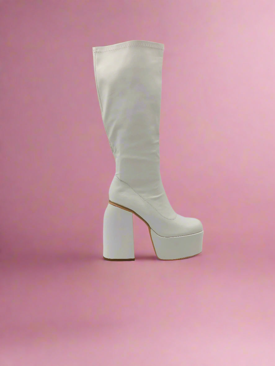 جزمة نسائية بيضاء أنيقة بكعب عريض يصل إلى الركبة وتضيف كل من الارتفاع والثبات إلى خطواتك. التصميم المرتفع يوفر دعماً إضافياً، مما يجعل هذه الجزمة مثالية لإطلالة واثقة.