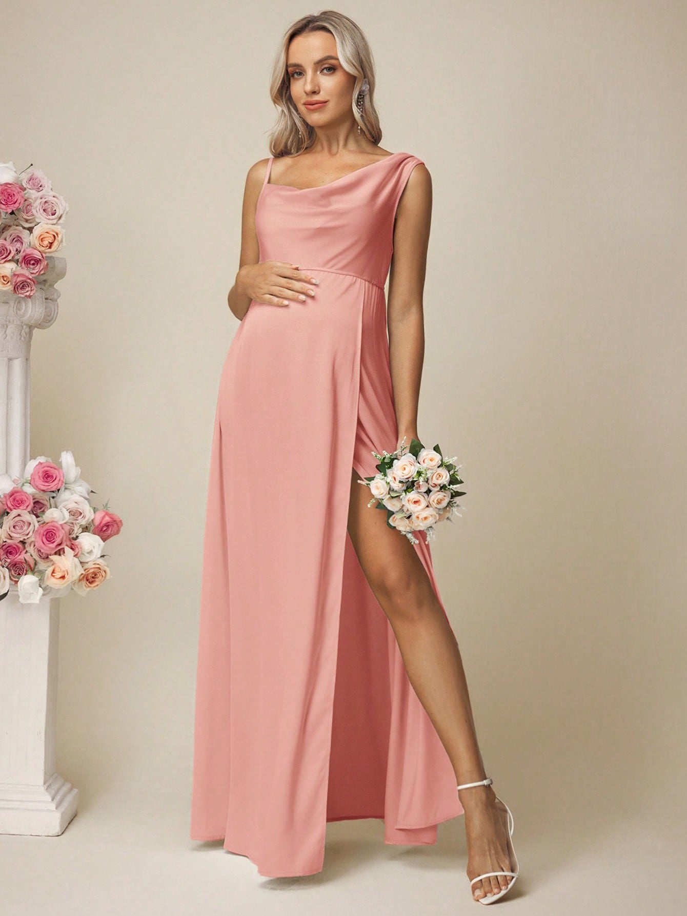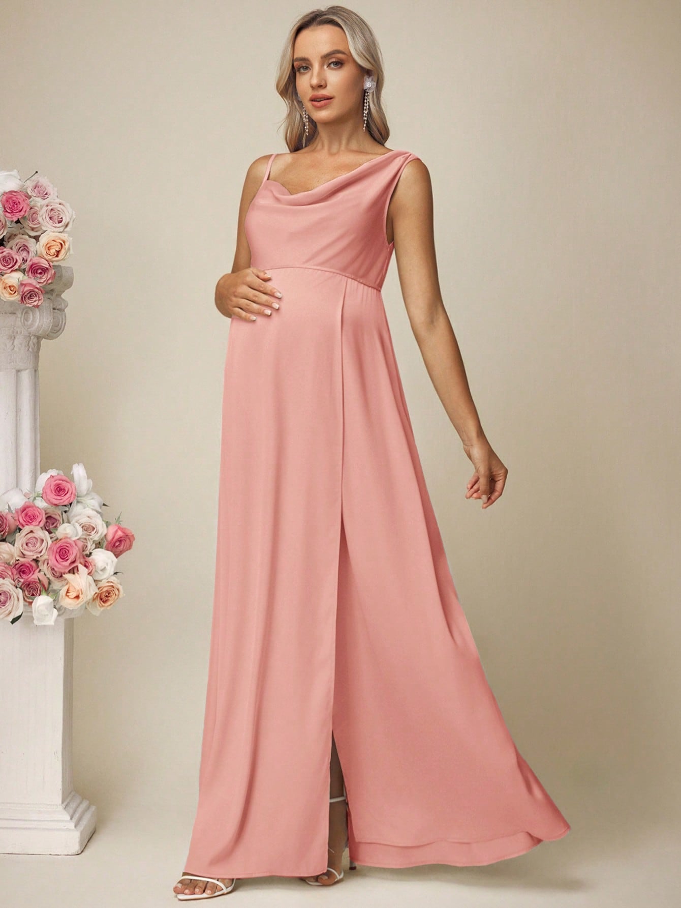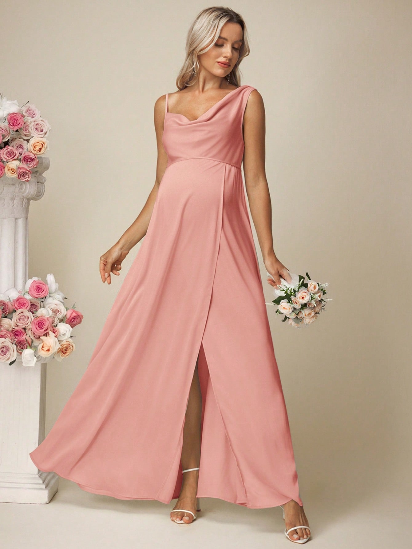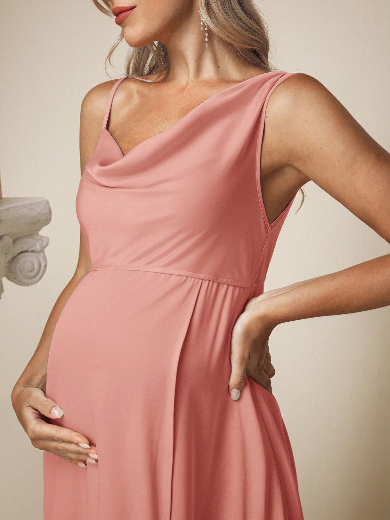 فستان حمل سادة من الساتان بدون أكمام بياقة عالية وفتحة جانبية