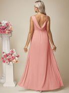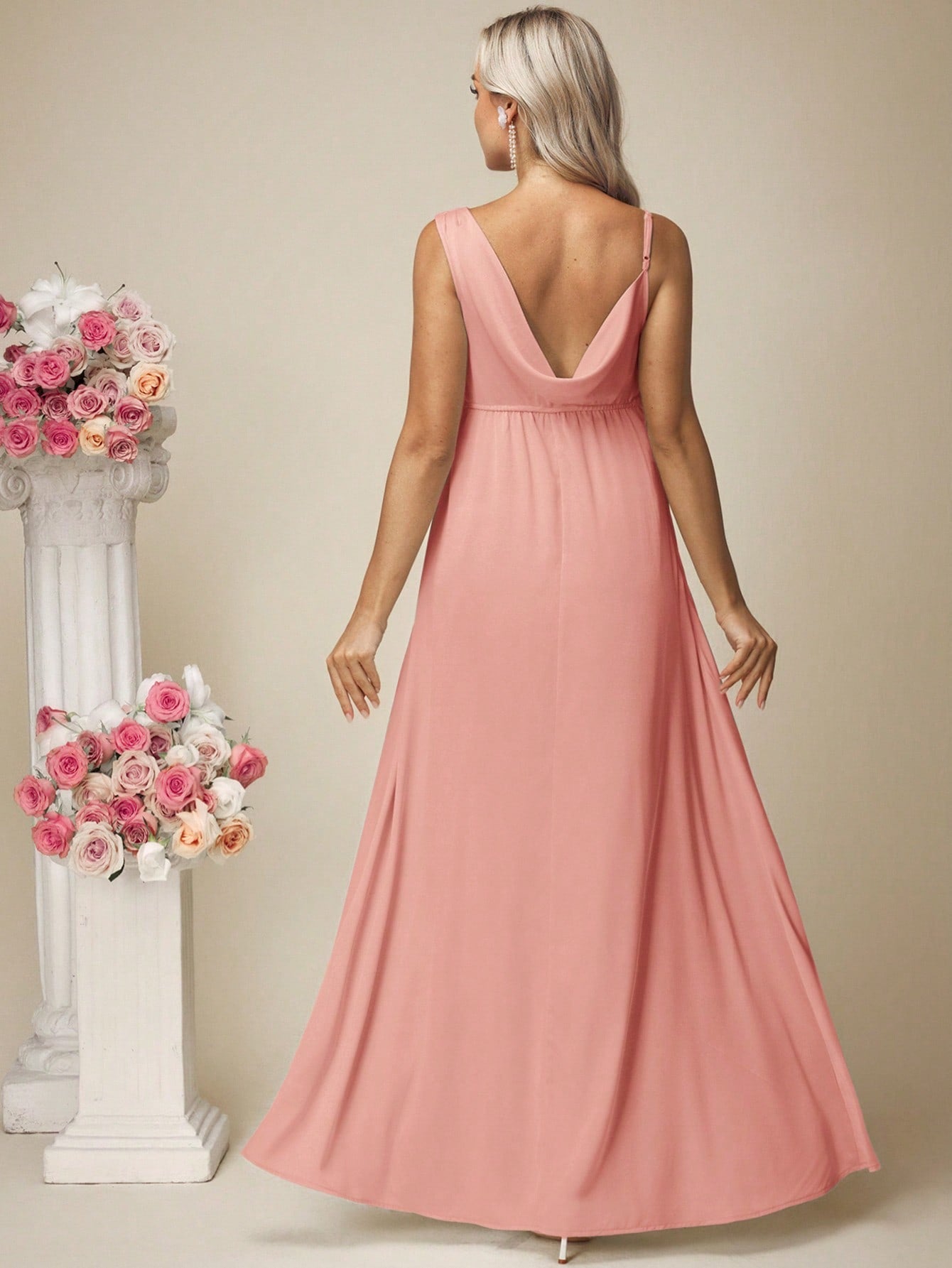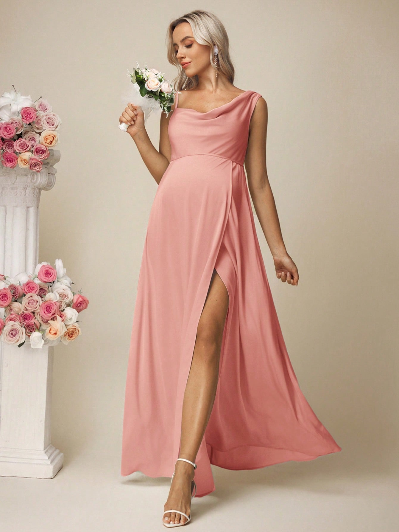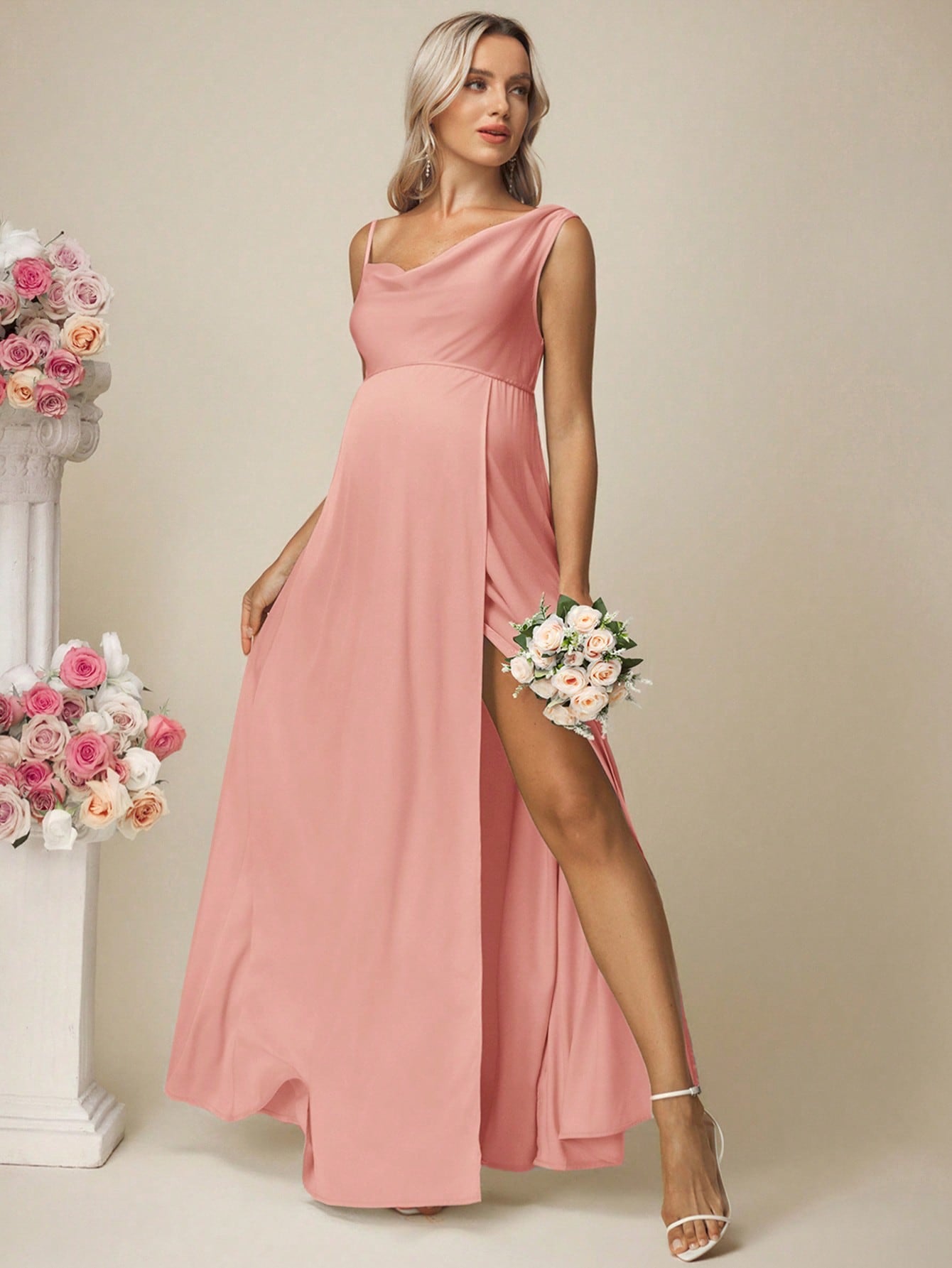 فستان حمل سادة من الساتان بدون أكمام بياقة عالية وفتحة جانبية