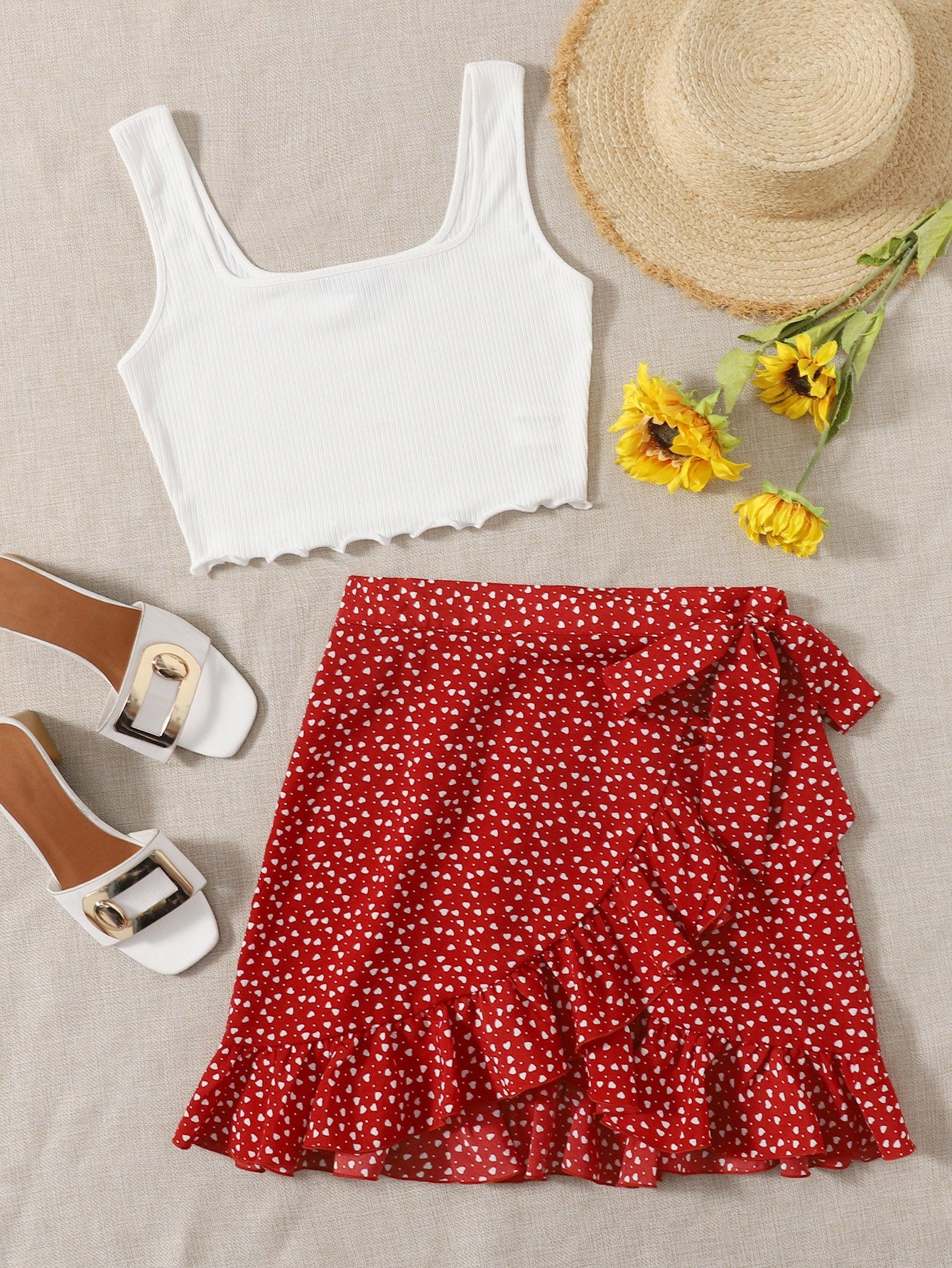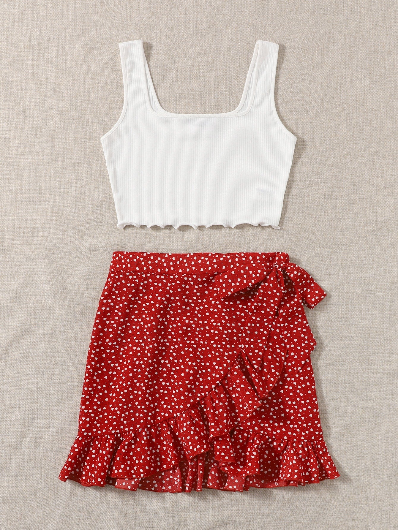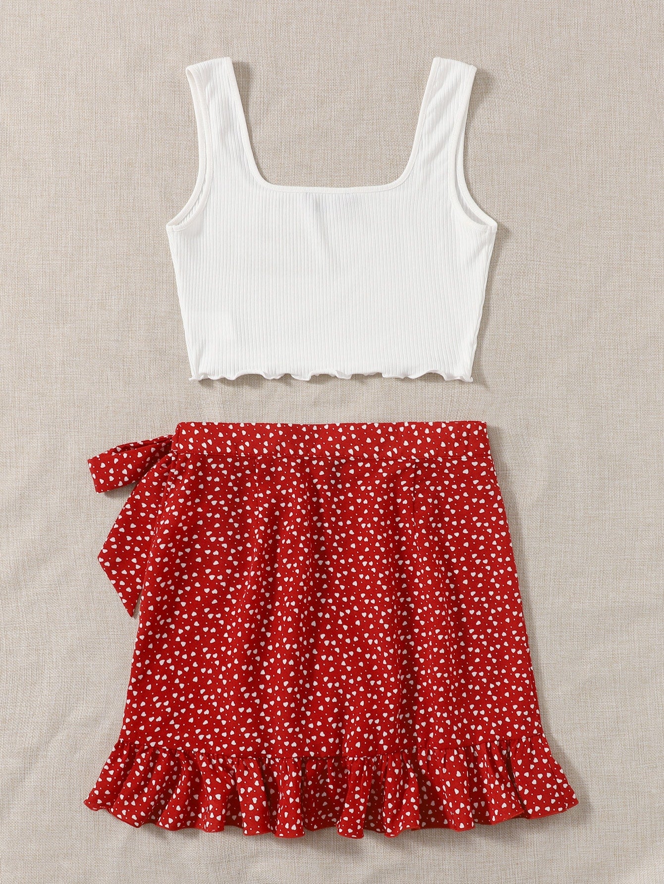 طقم بلوزة بدون أكمام مزينة بحواف خس وتنورة جانبية برباط ملفوف من سوليا