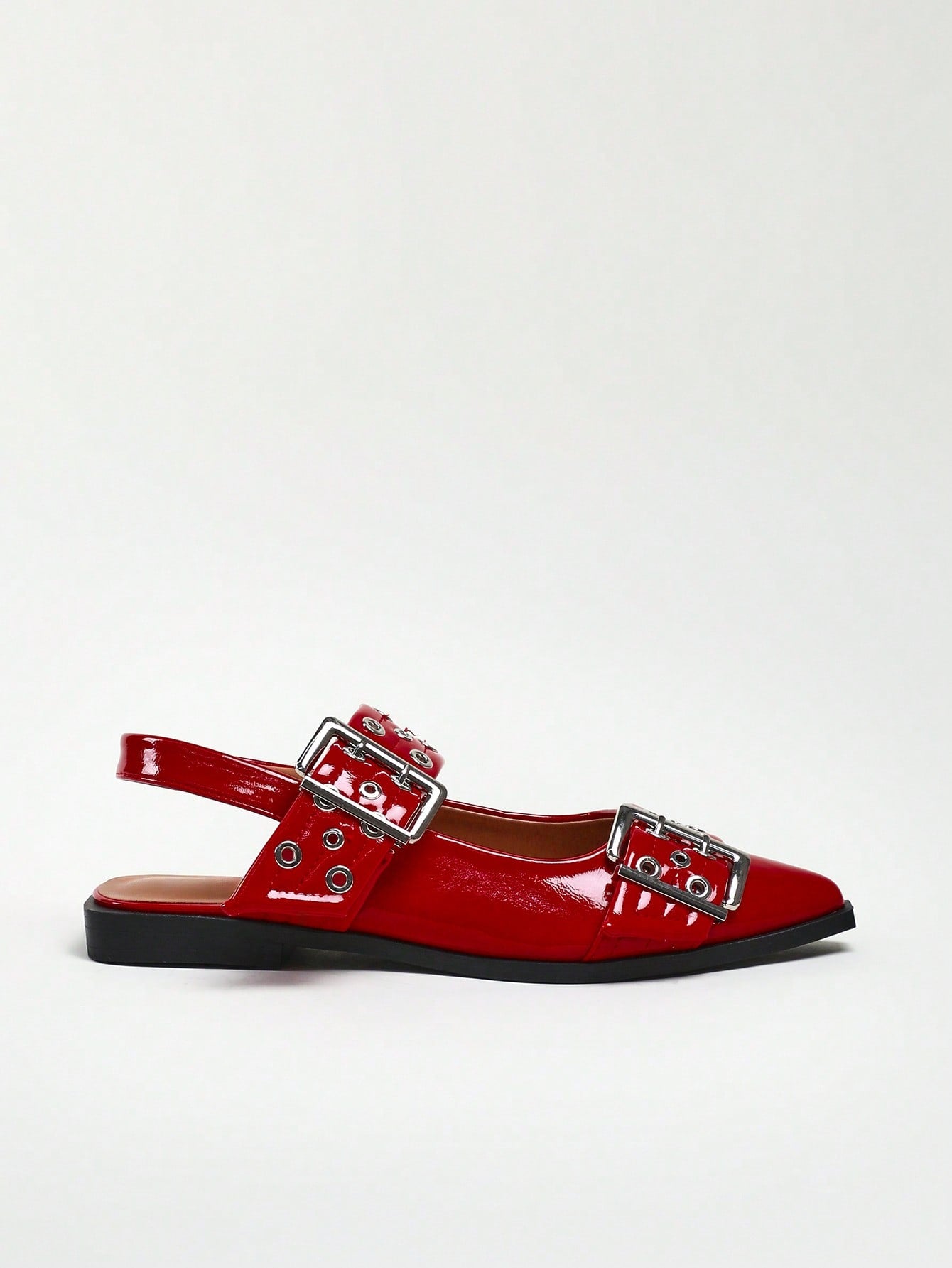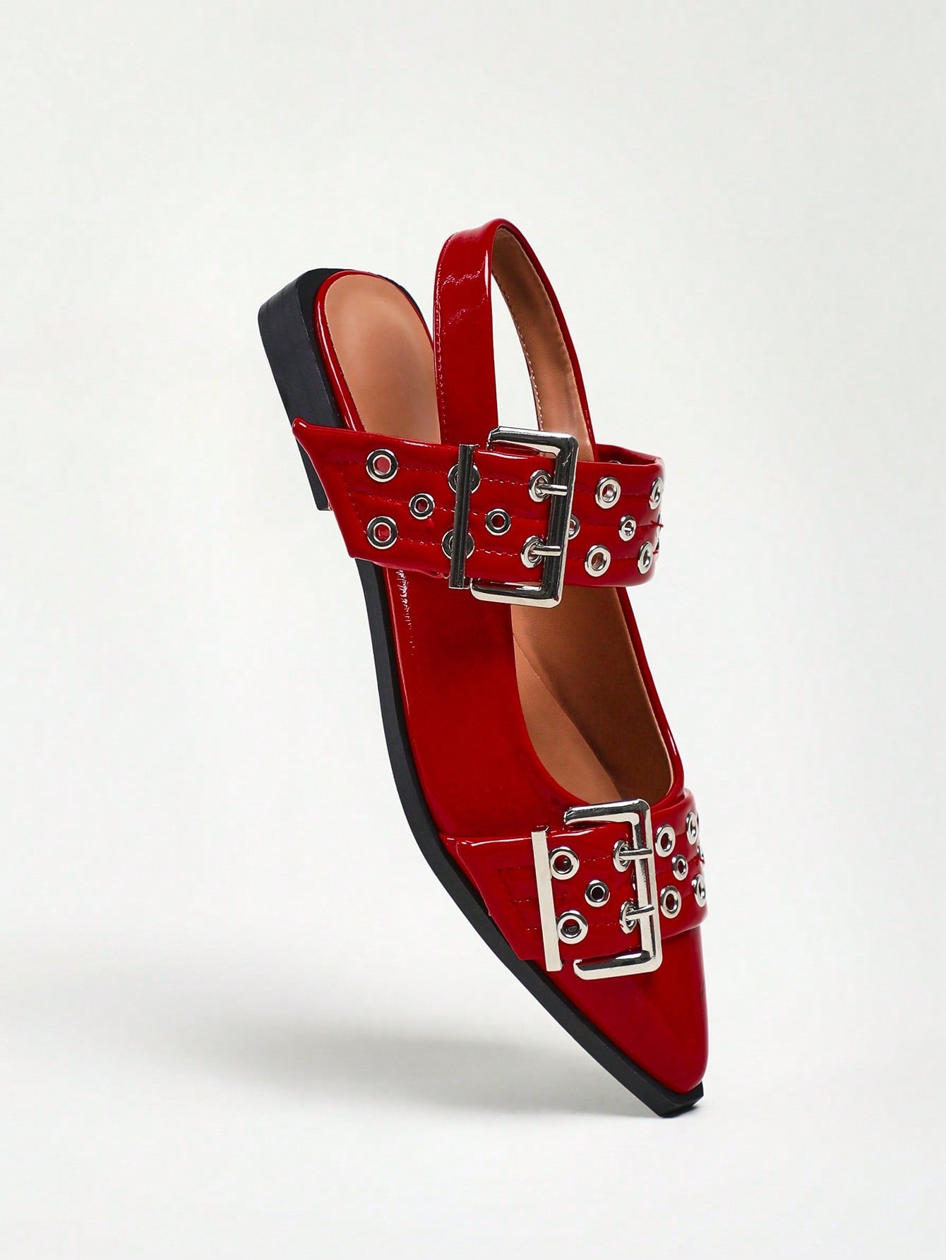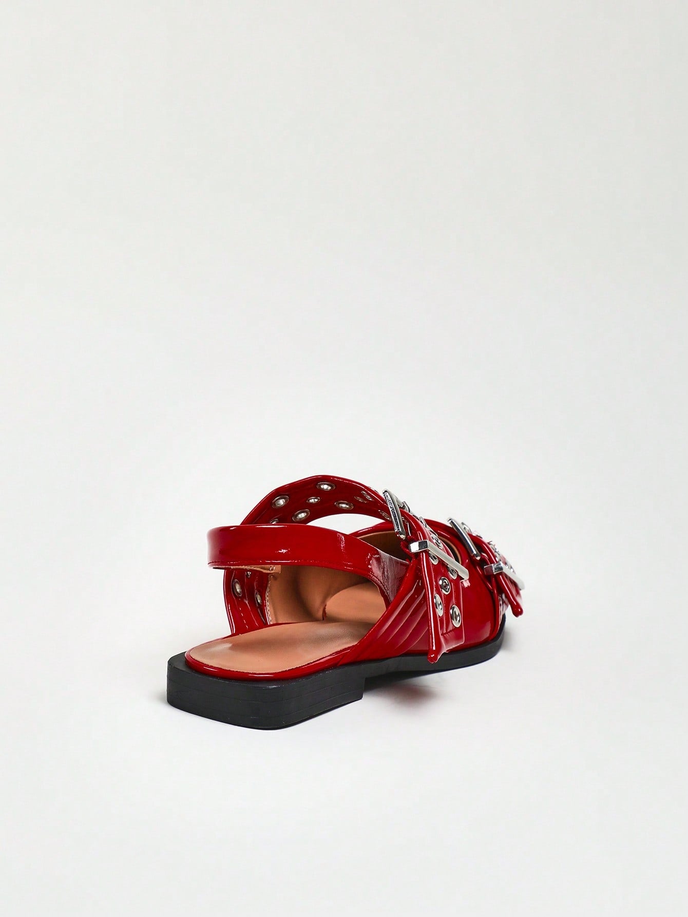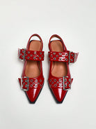 حذاء سوليزاي النسائي ذو الكعب العالي، مزين بإبزيم كبير وحلقات معدنية، بتصميم أنيق وعصري، باللون الأحمر.