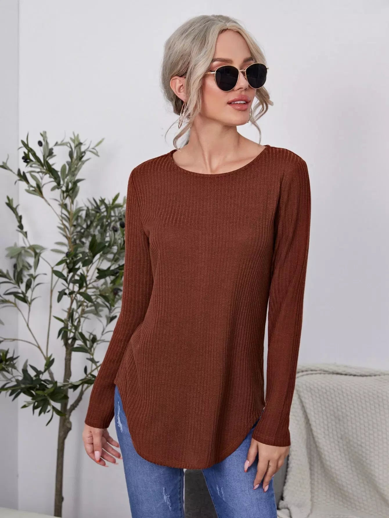 قميص تي شيرت طويل محبوك بأزرار خلفية سادة
