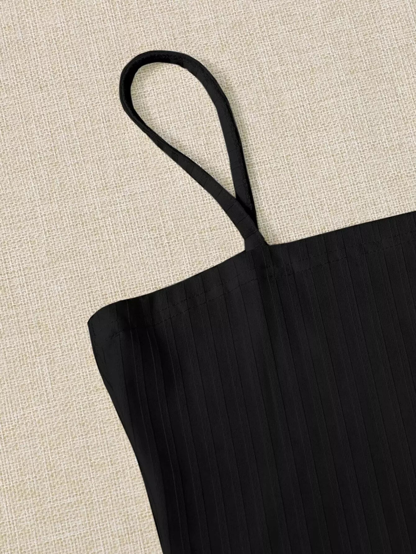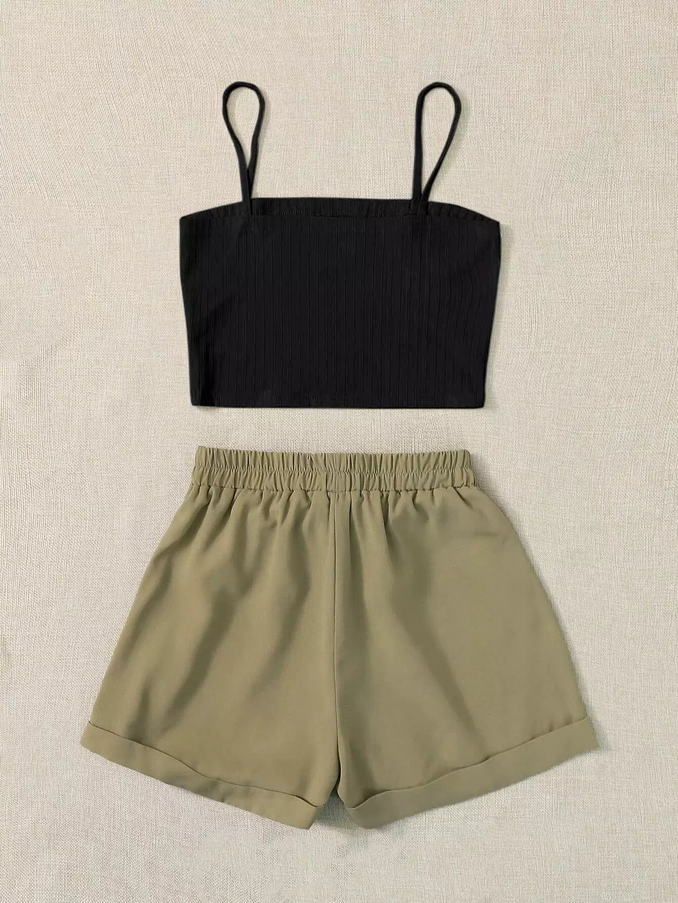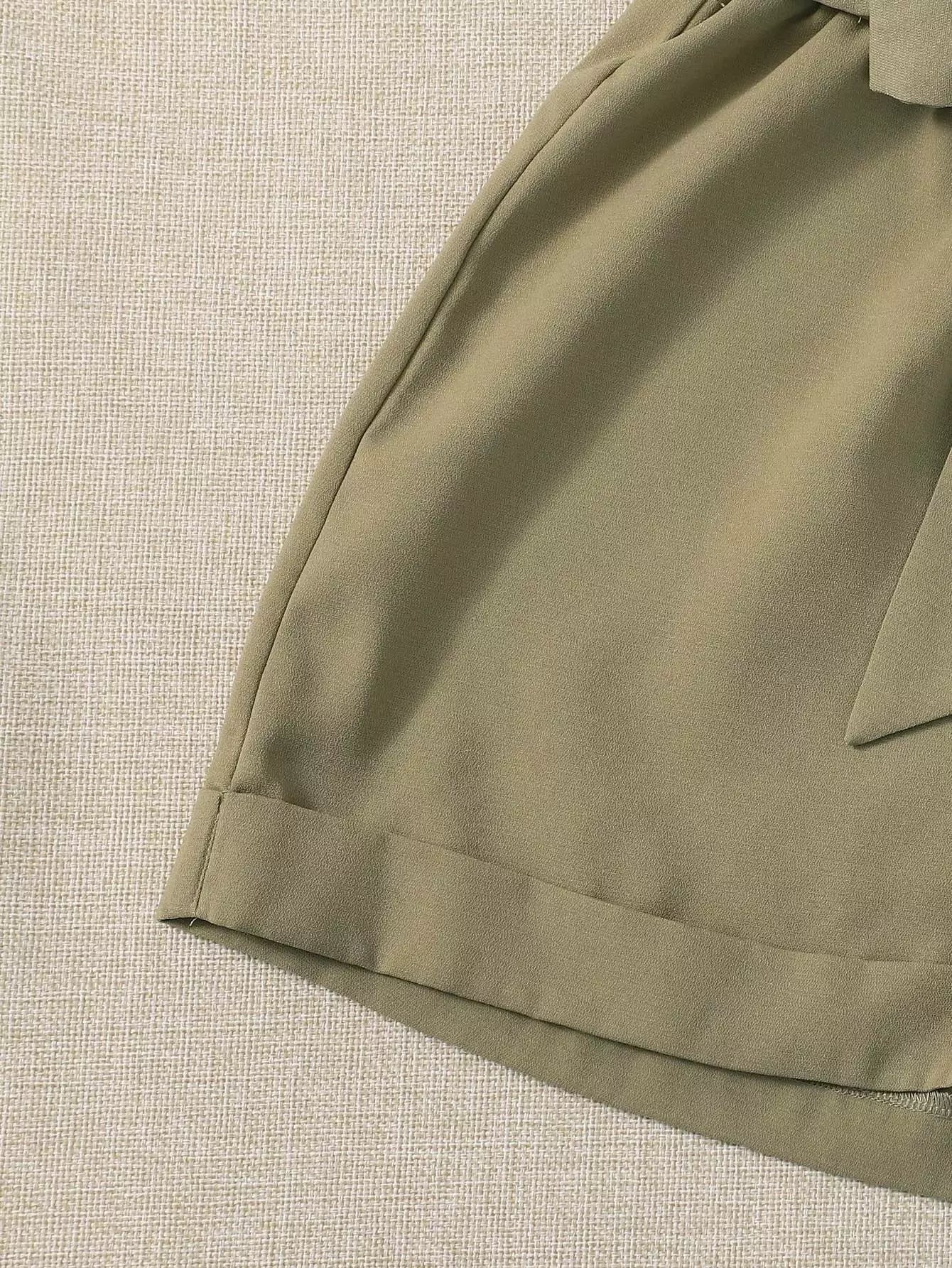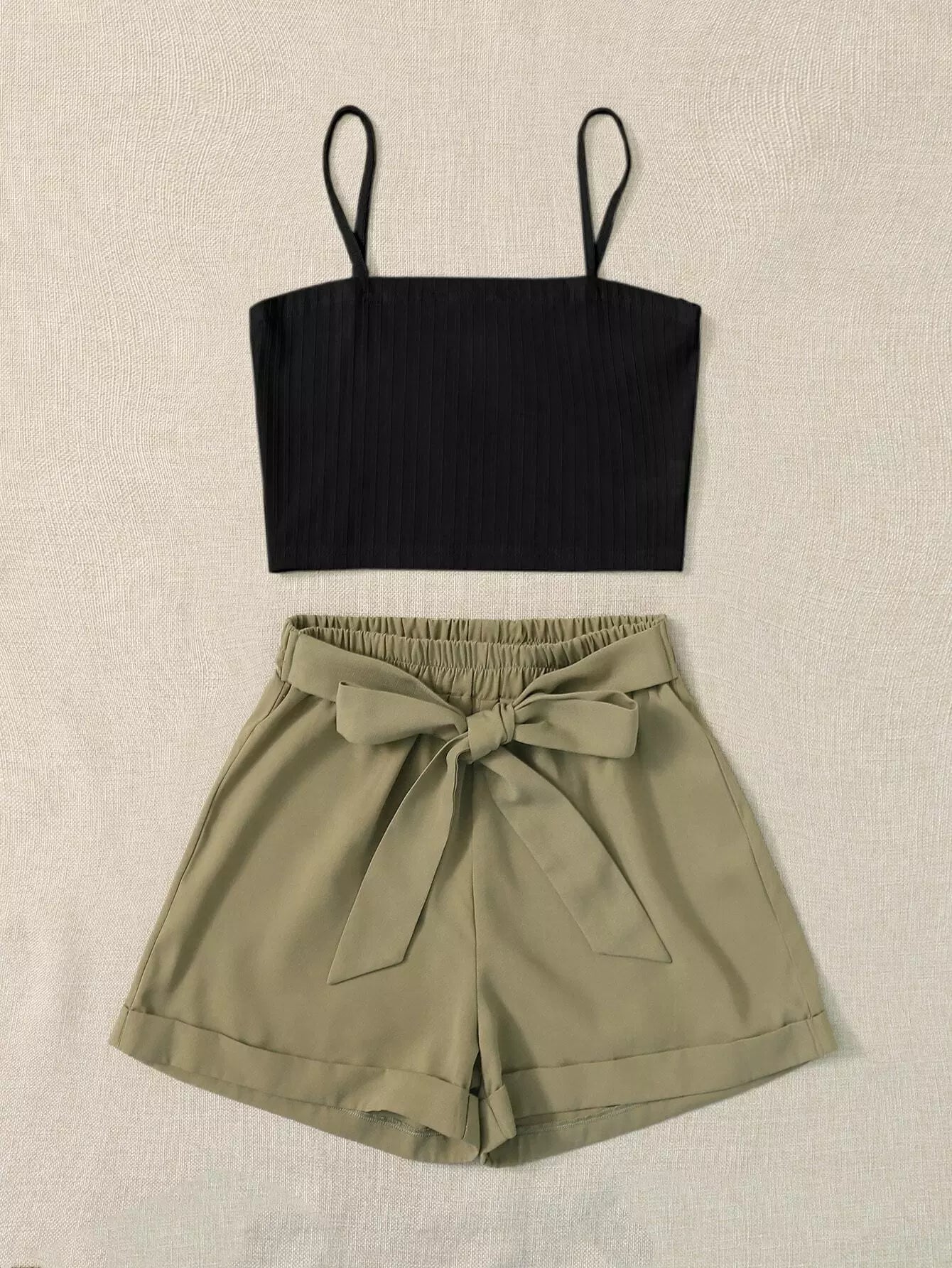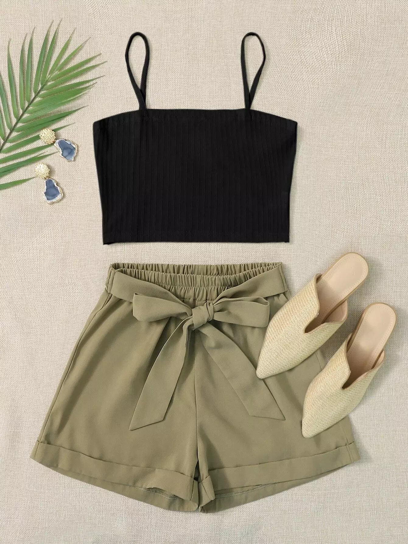 بلوزة كامي قصيرة صلبة وسروال واسع الساق بدون حزام