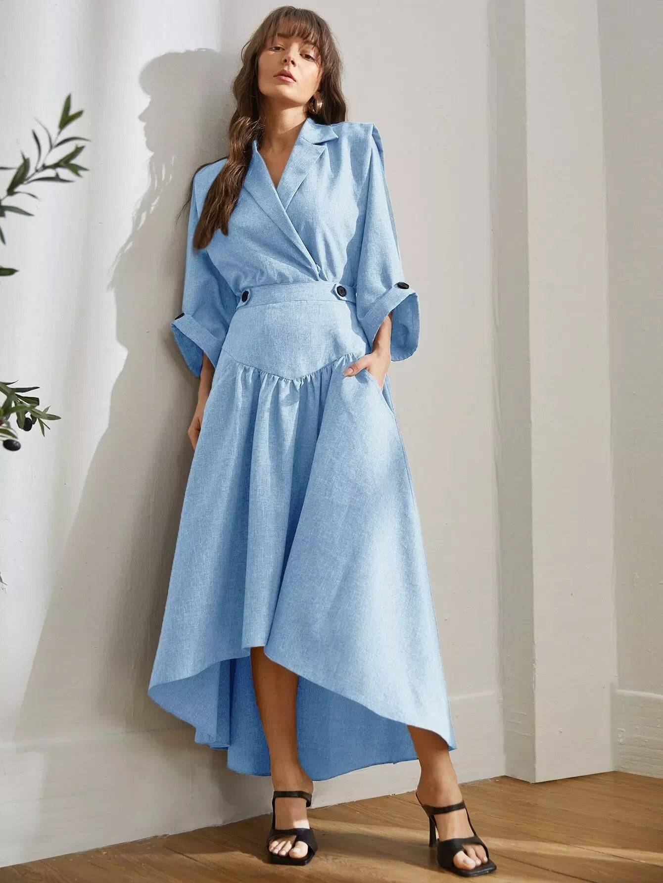 طقم بلوزة برقبة سادة بفتحة رقبة ملفوفة الأكمام وتنورة عالية منخفضة