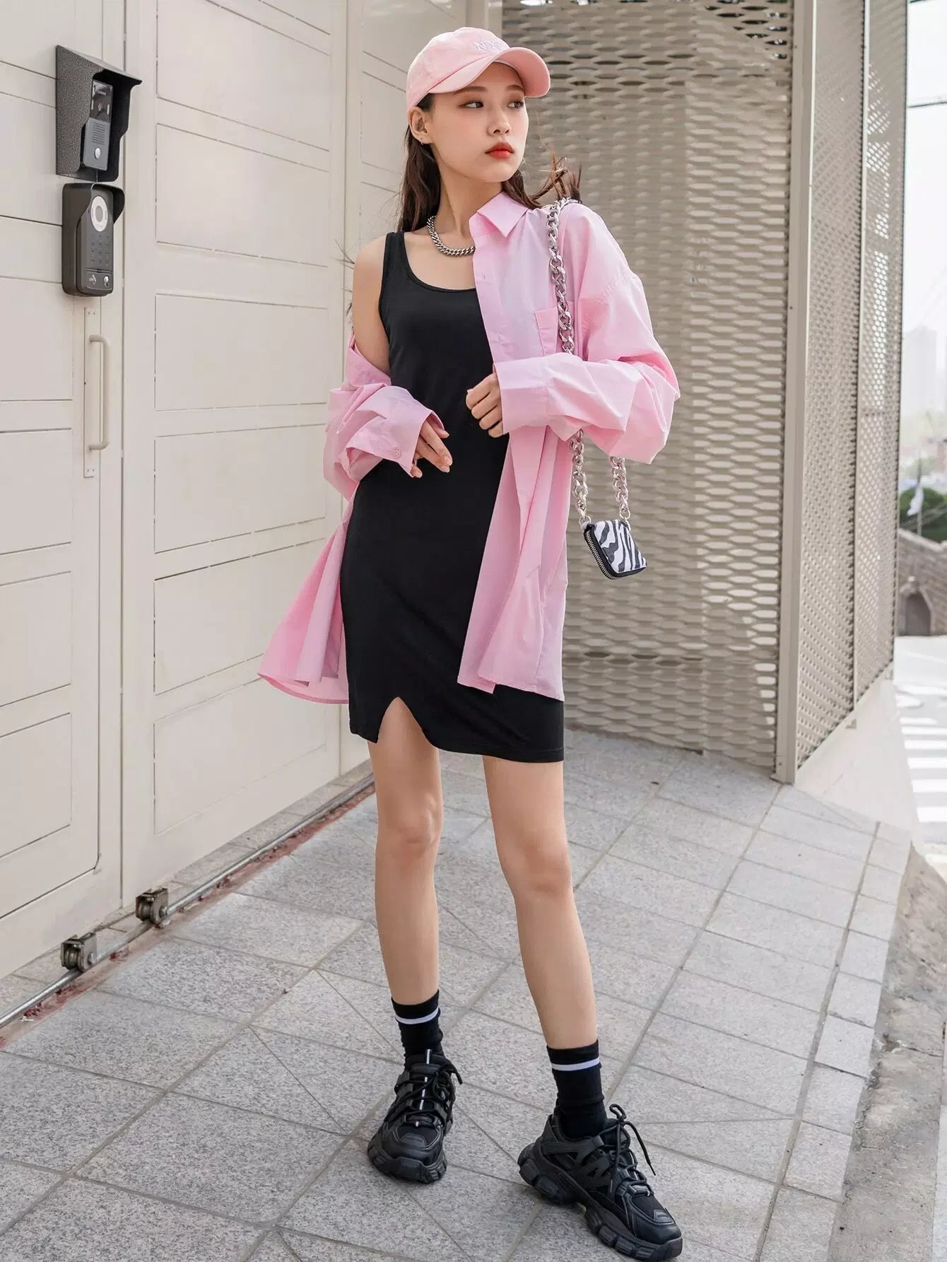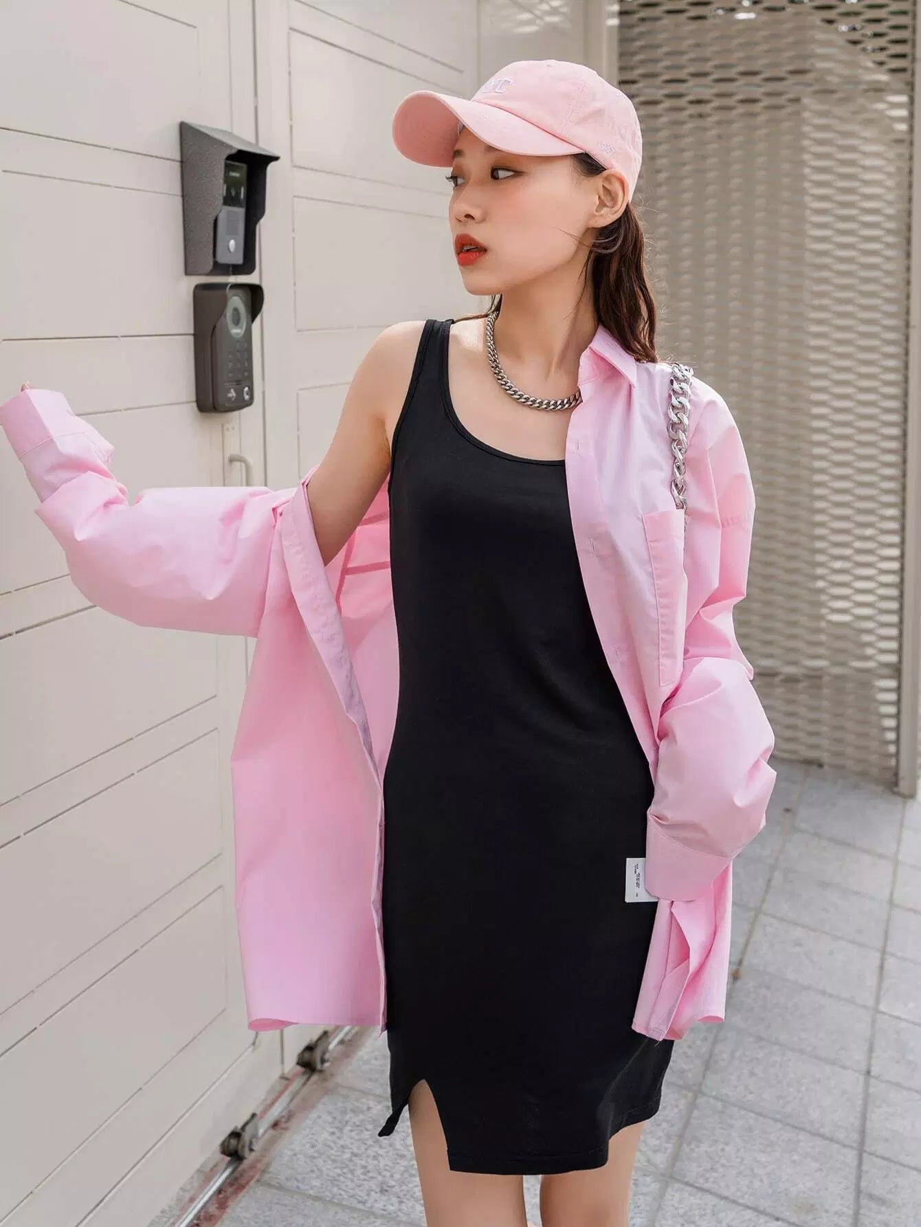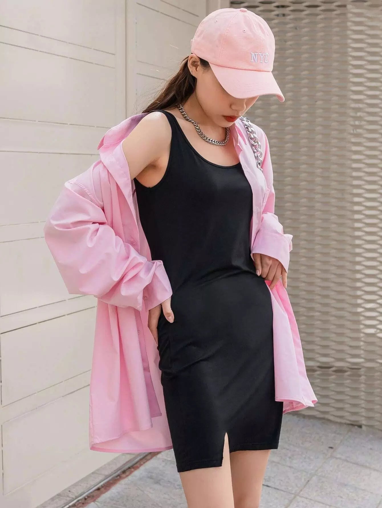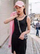 فستان بدون أكمام برقبة سادة بفتحة عنق دائرية مشقوقة الحاشية