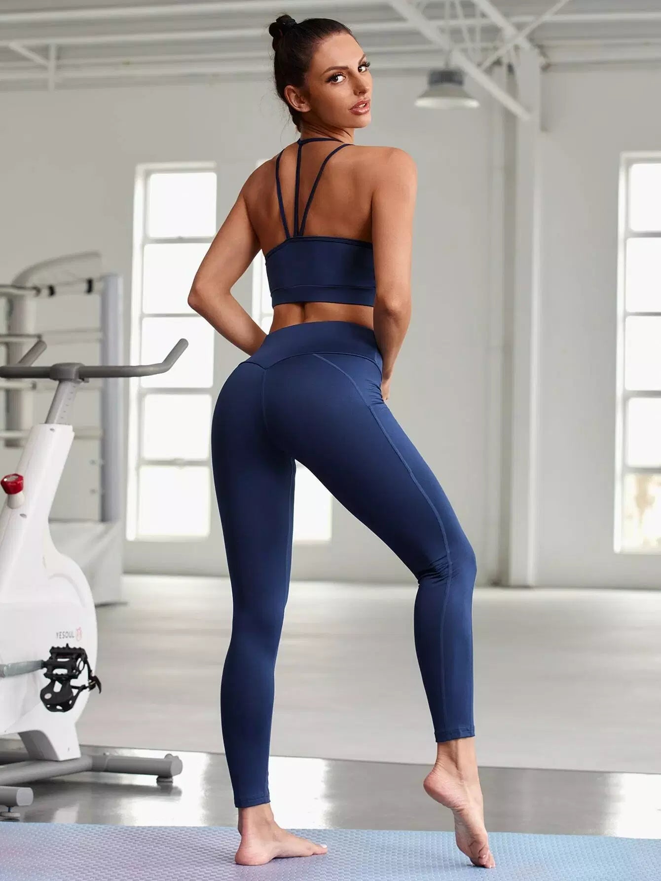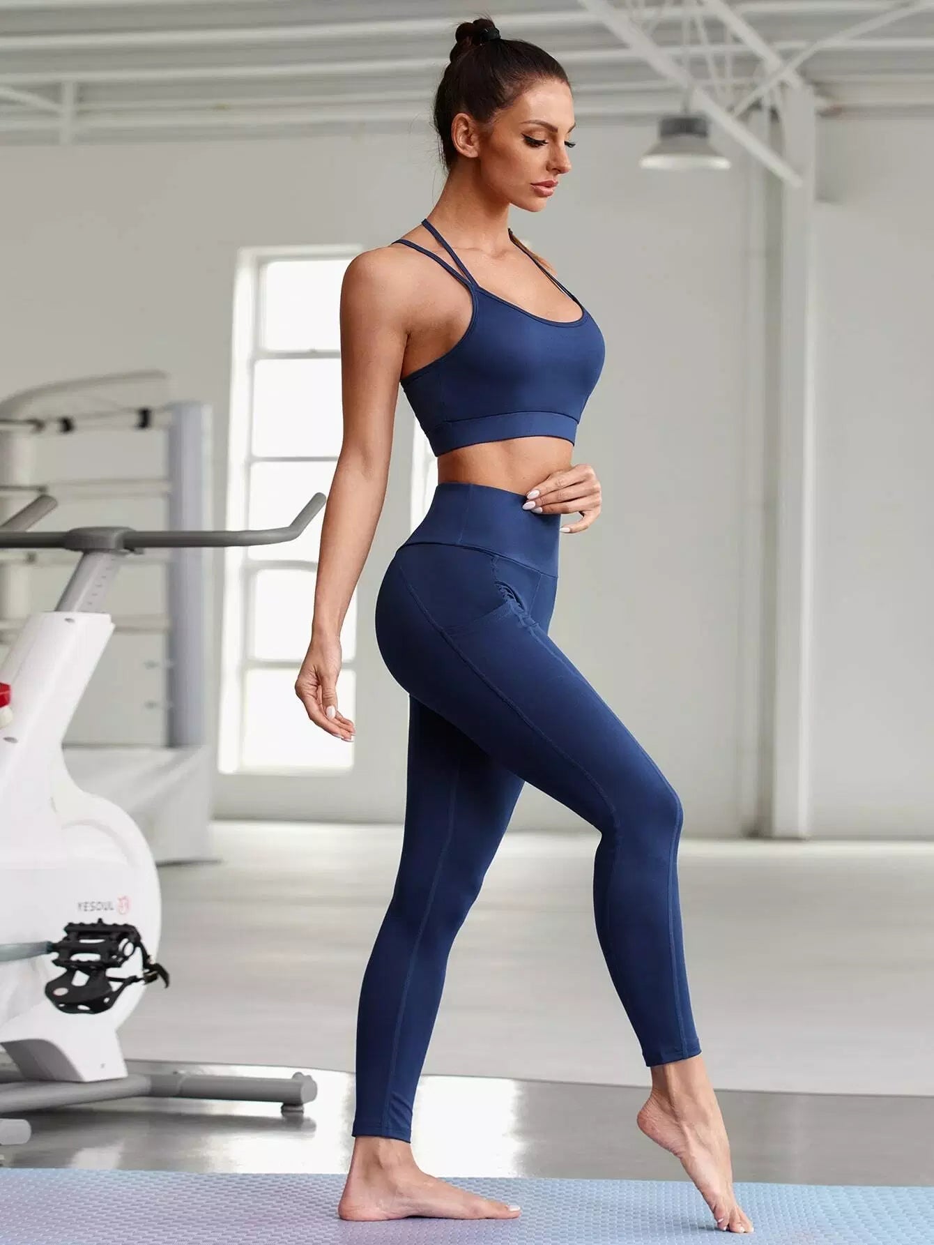 حمالة صدر رياضية سادة وبنطلون رياضي ضيق مع جيب للهاتف