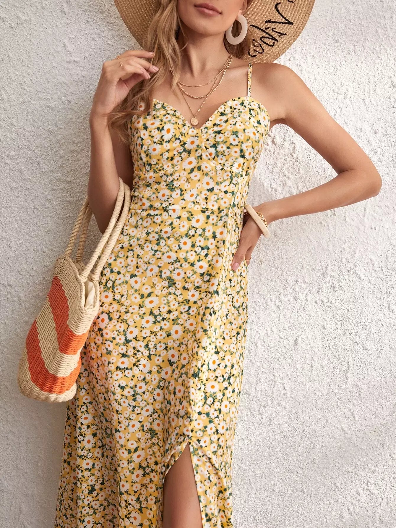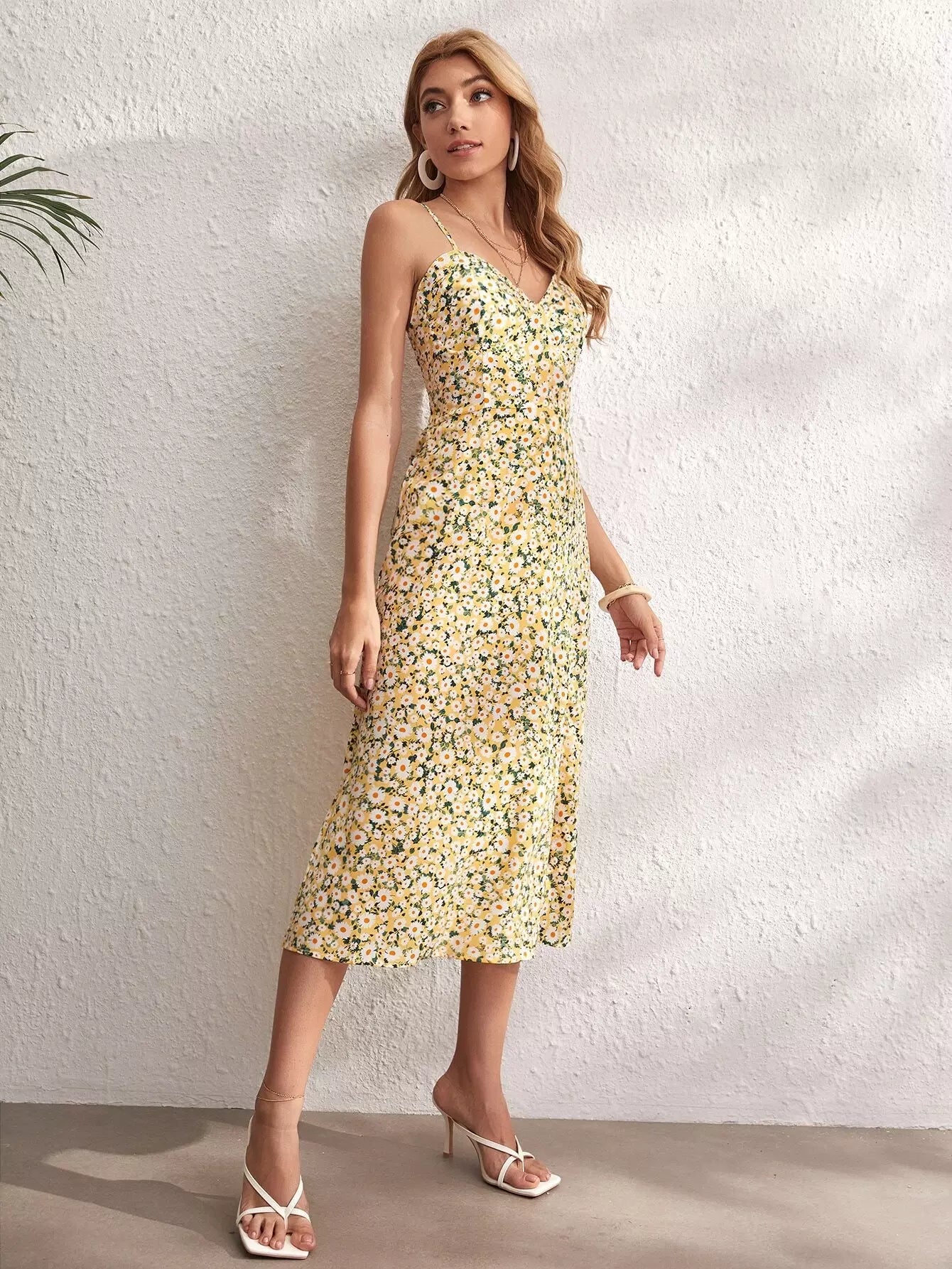 للنساء - فستان كامي مزين بالزهور بحاشية مقسمة