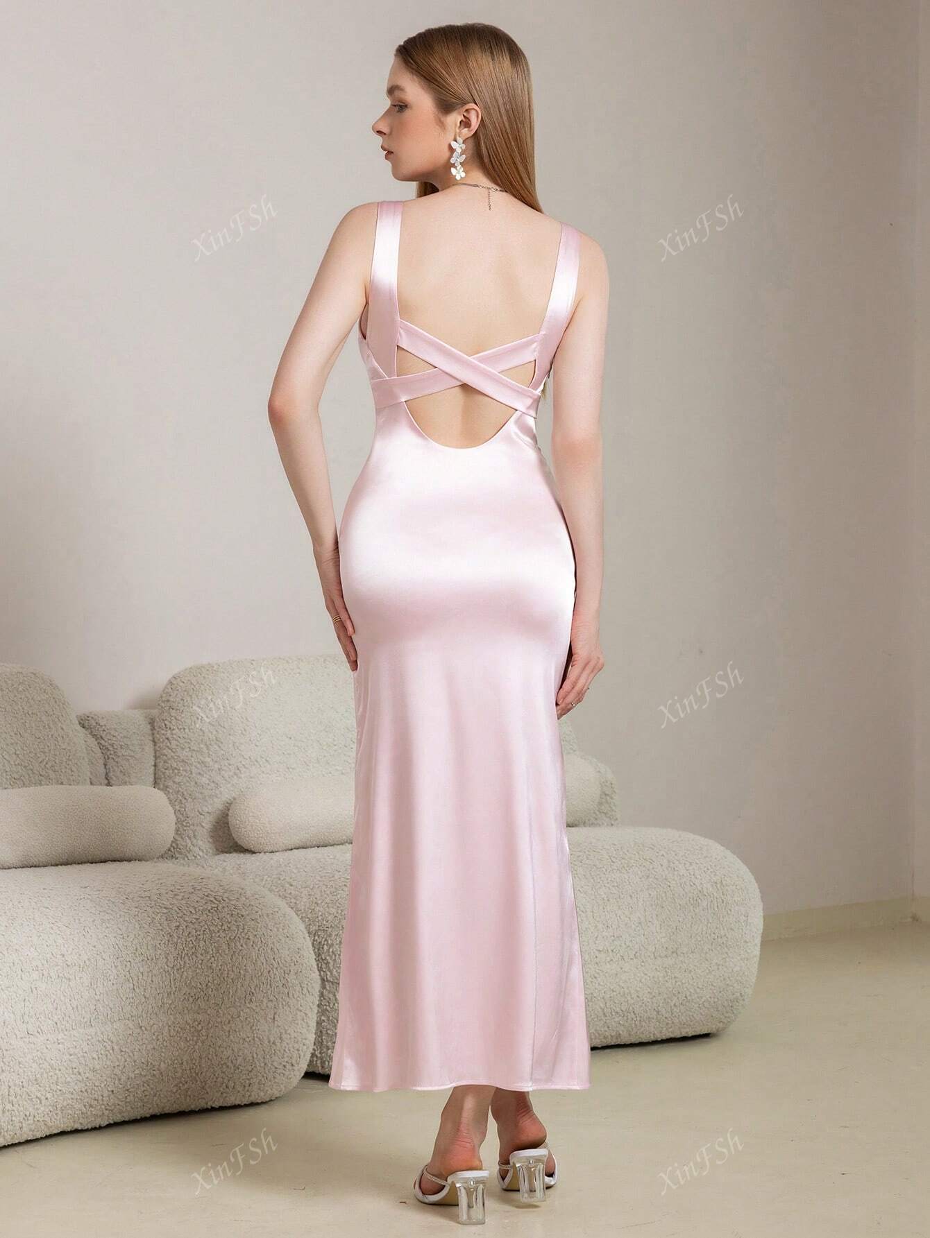 Square Neck Backless Cut Out Crisscross Up Trim Mermaid Hem Bodycon Elegant Formal Evening Gowns, Party