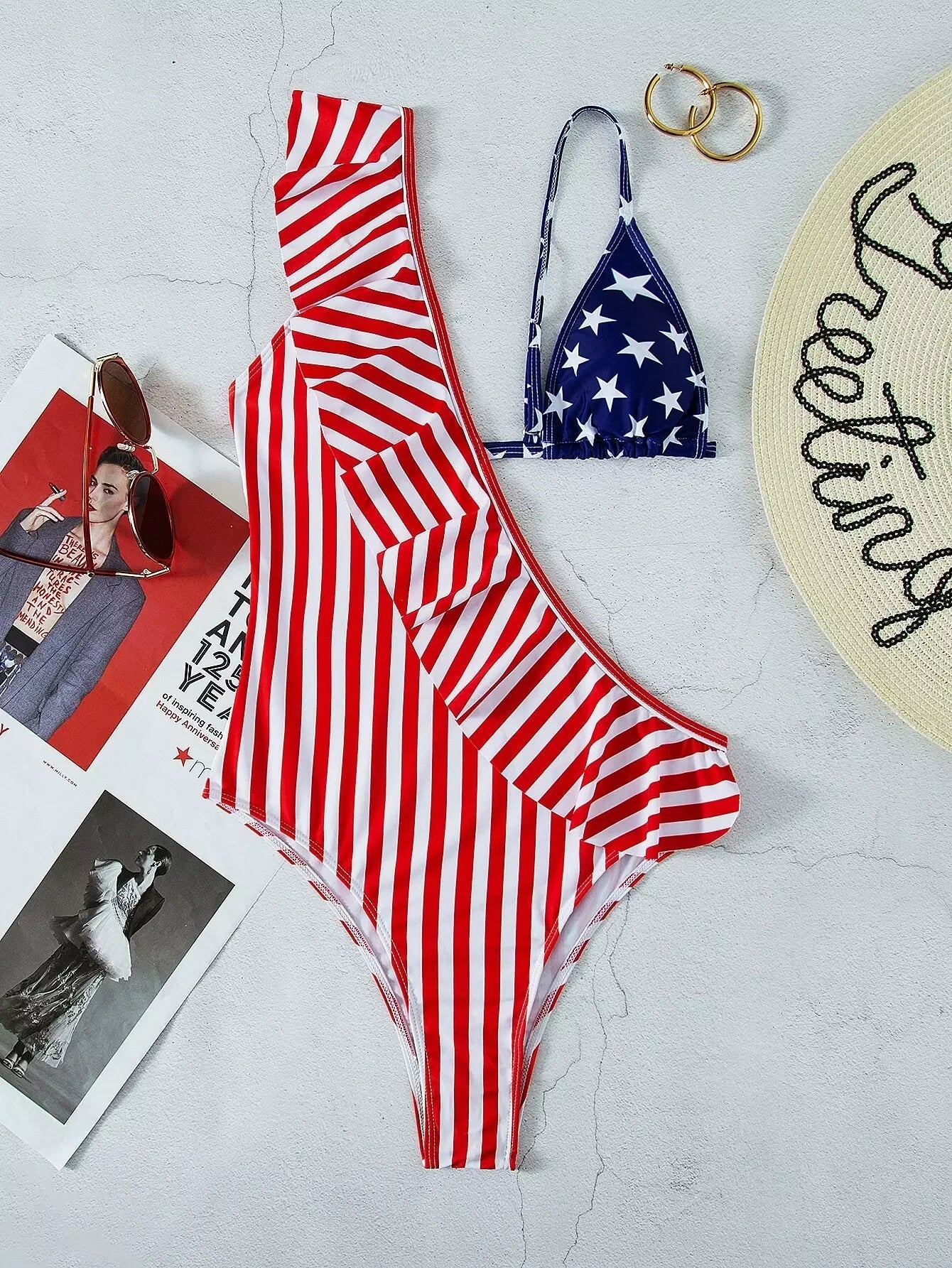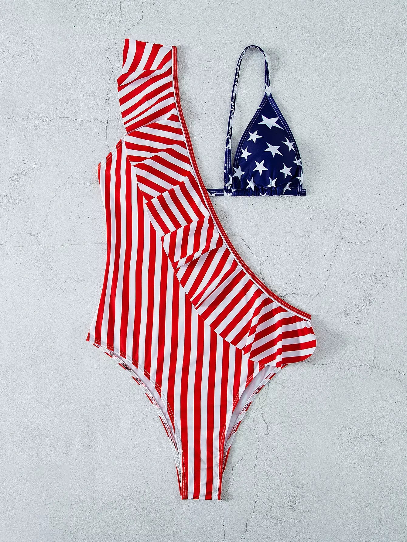 بذلة سباحة من قطعة واحدة بنقشة نجوم وخطوط مكشكشة