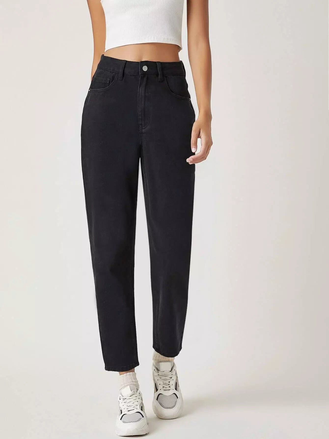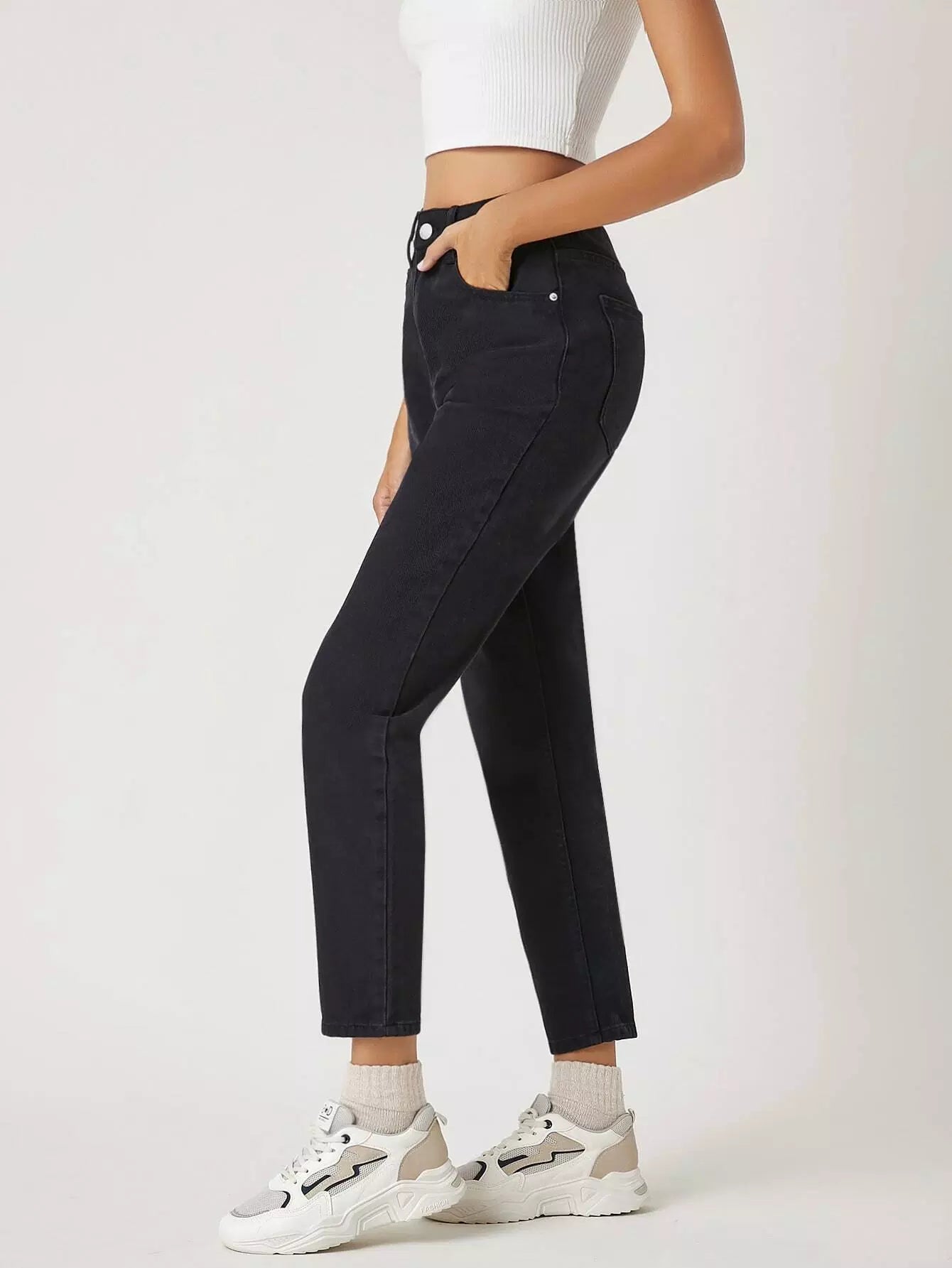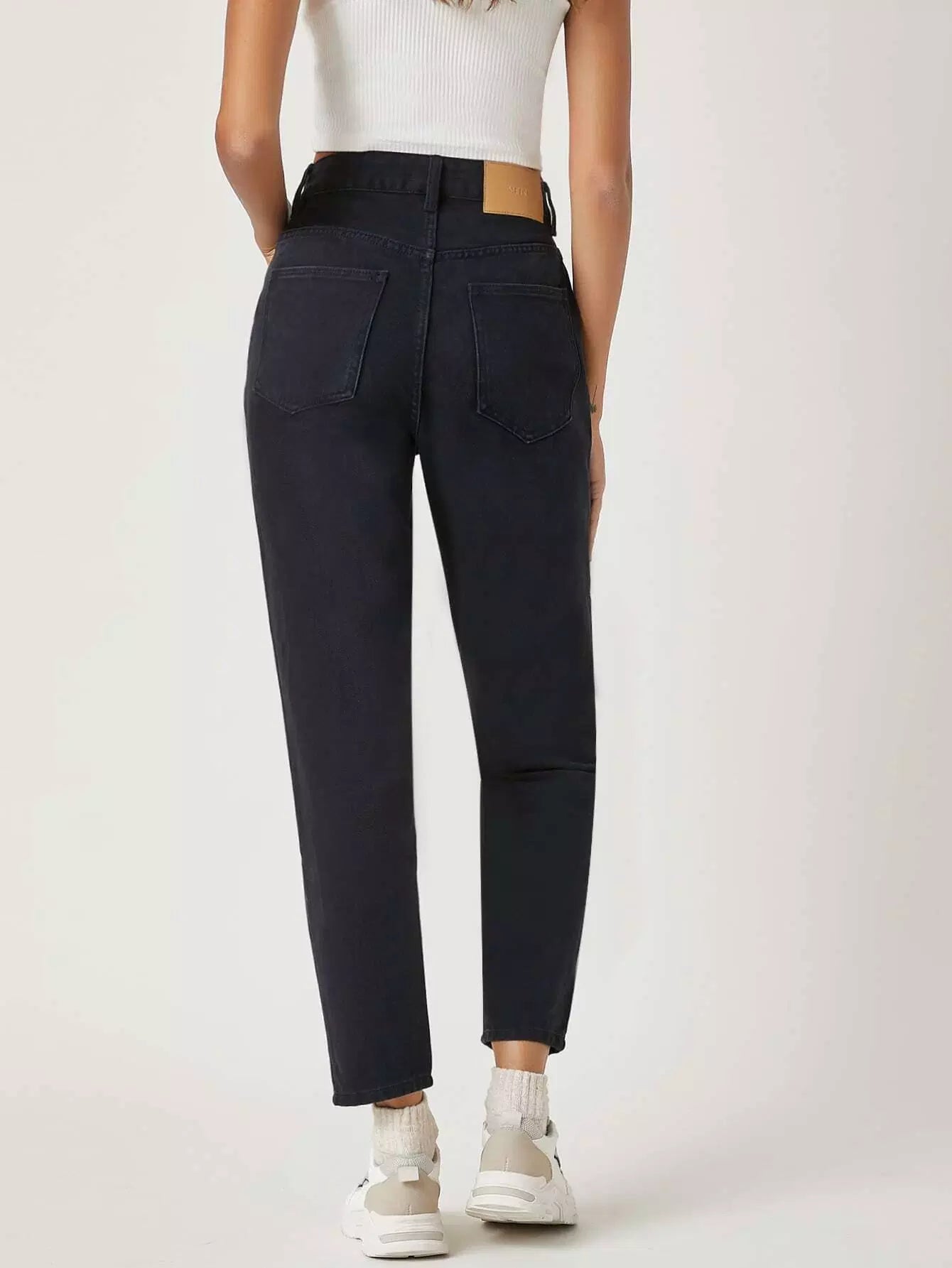 بنطلون جينز جينز للأمهات متوسط الخصر مغسول بالحجر