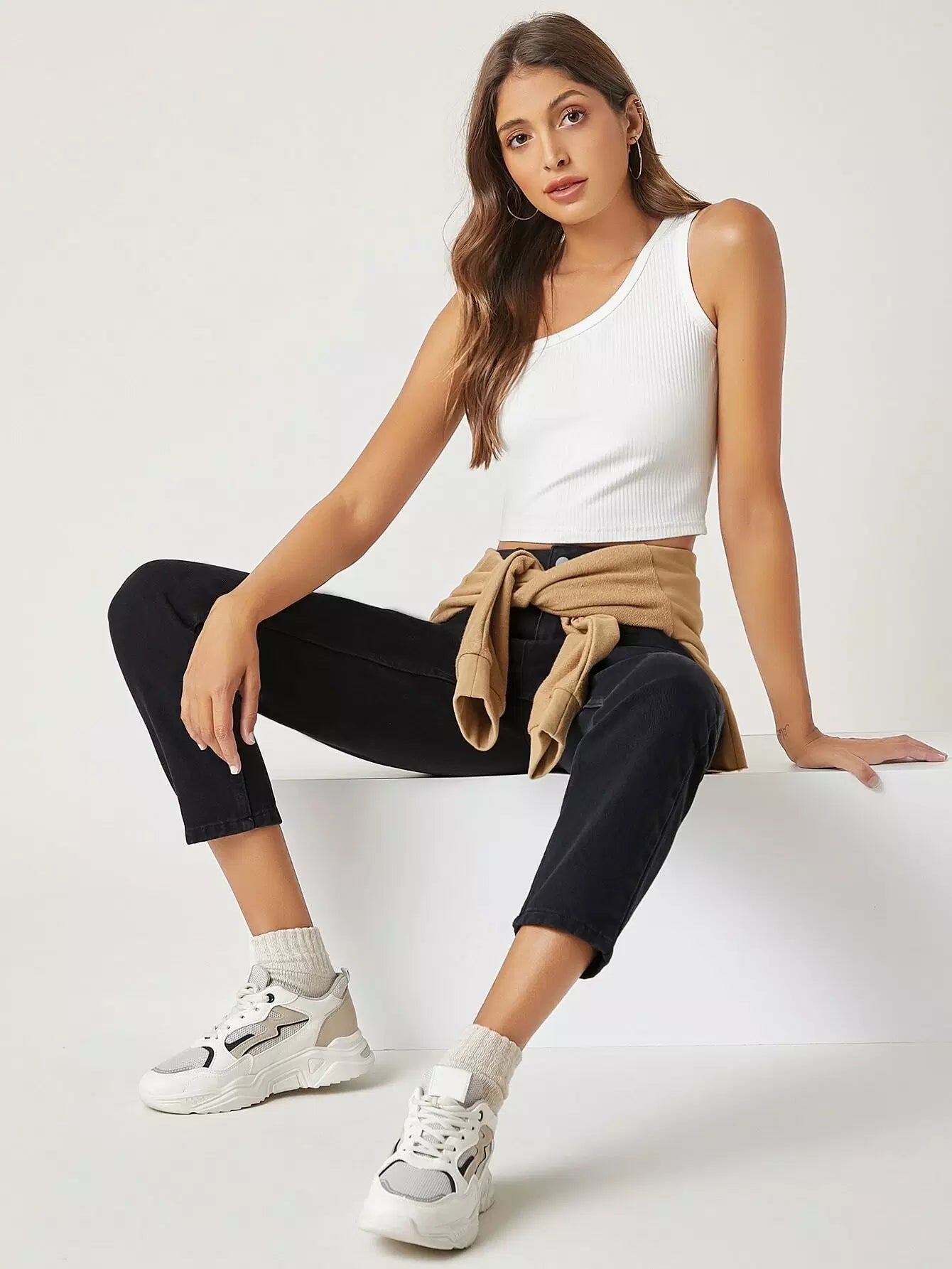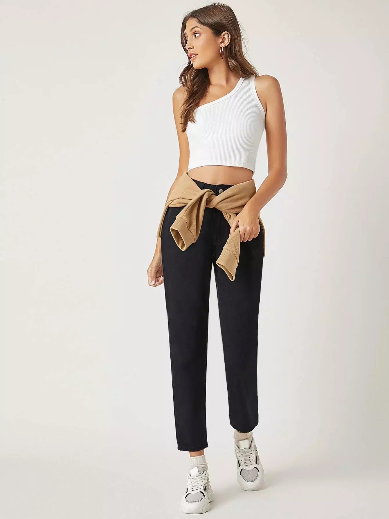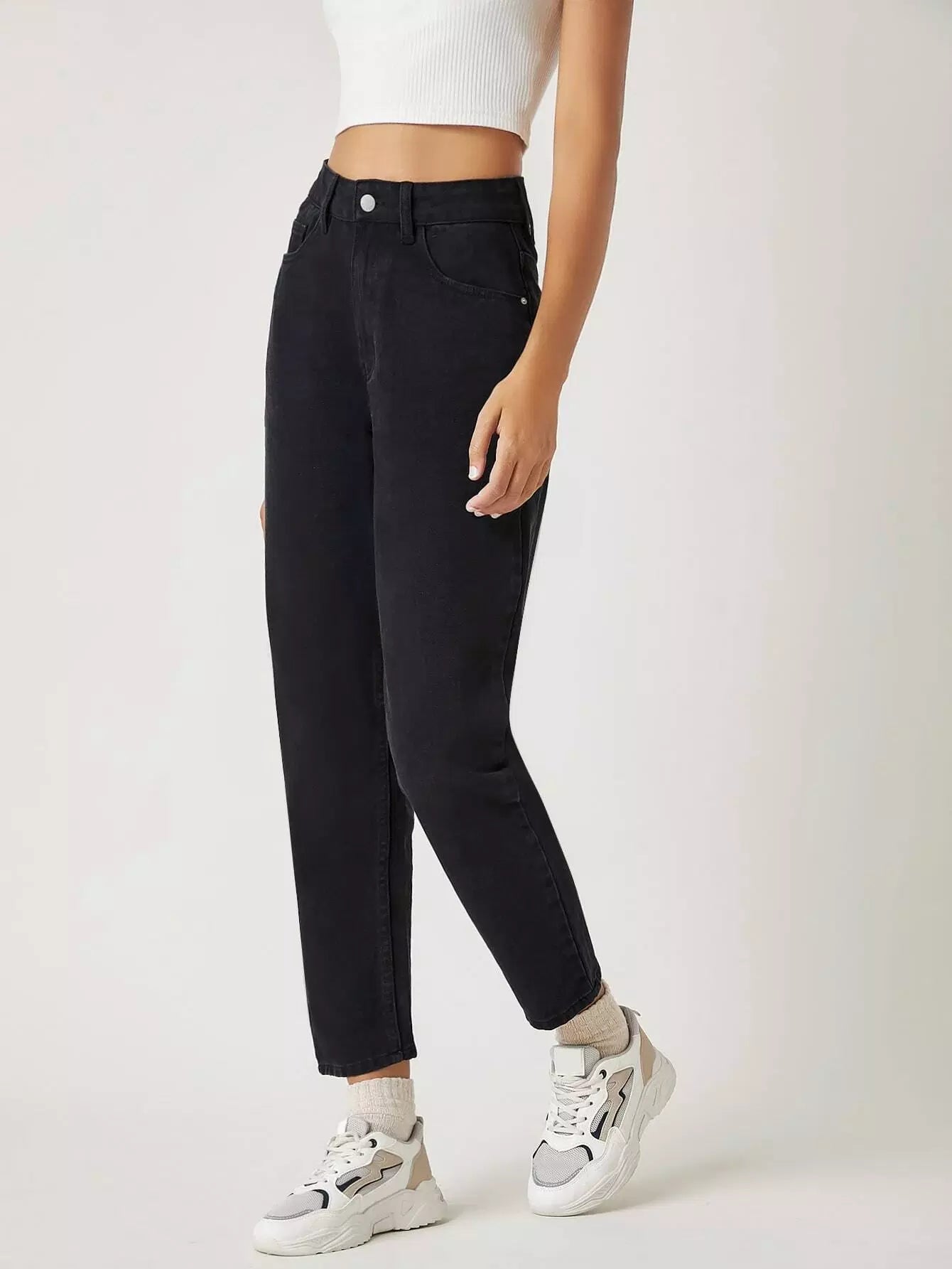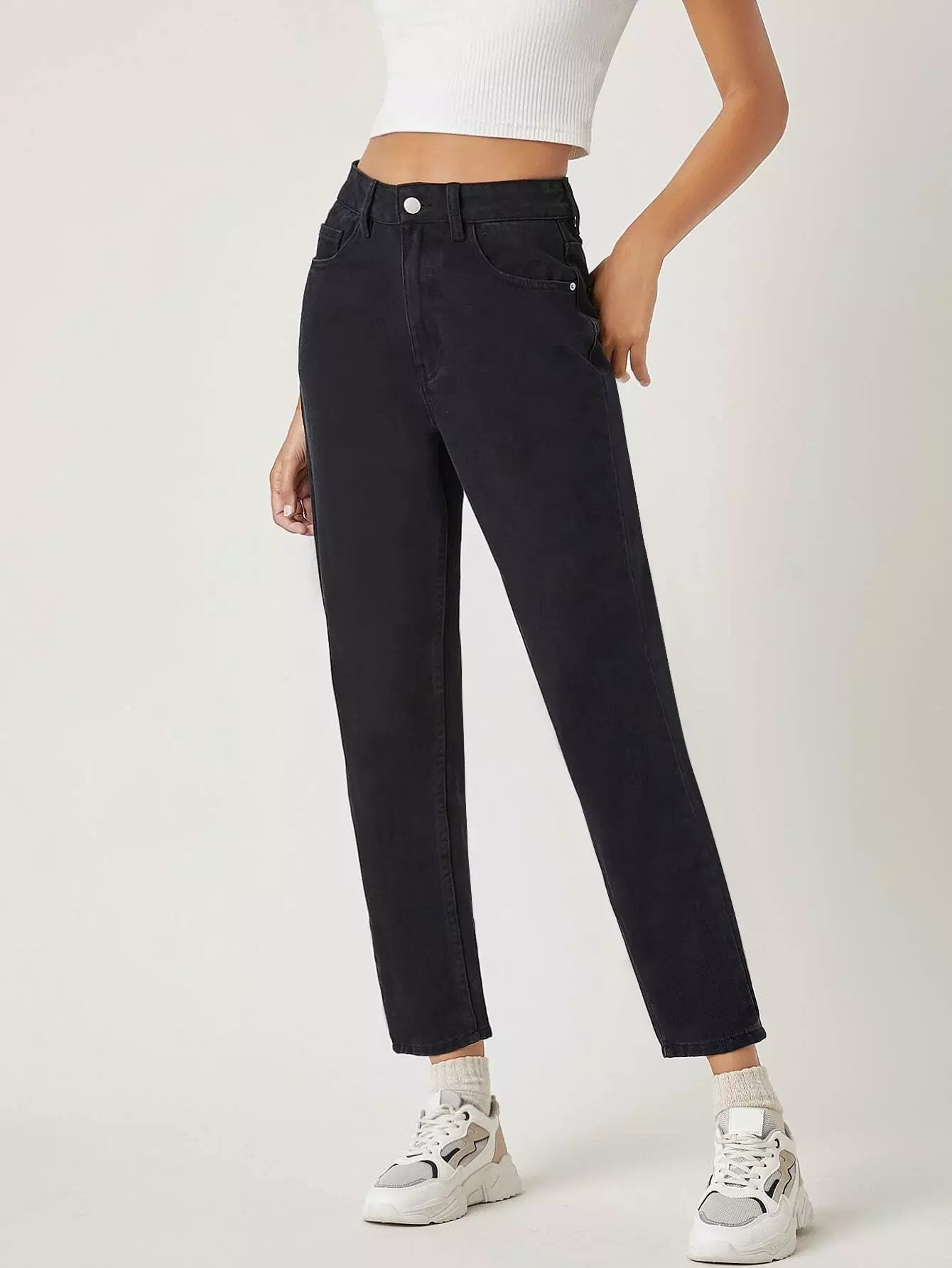 بنطلون جينز جينز للأمهات متوسط الخصر مغسول بالحجر