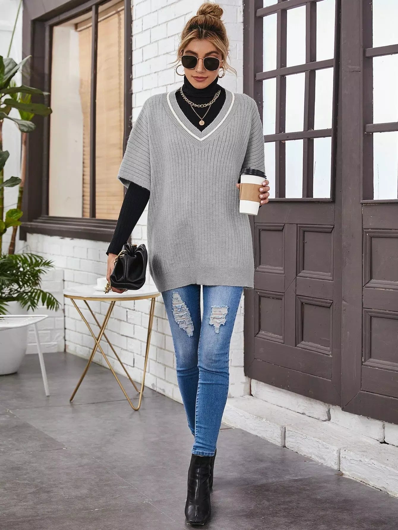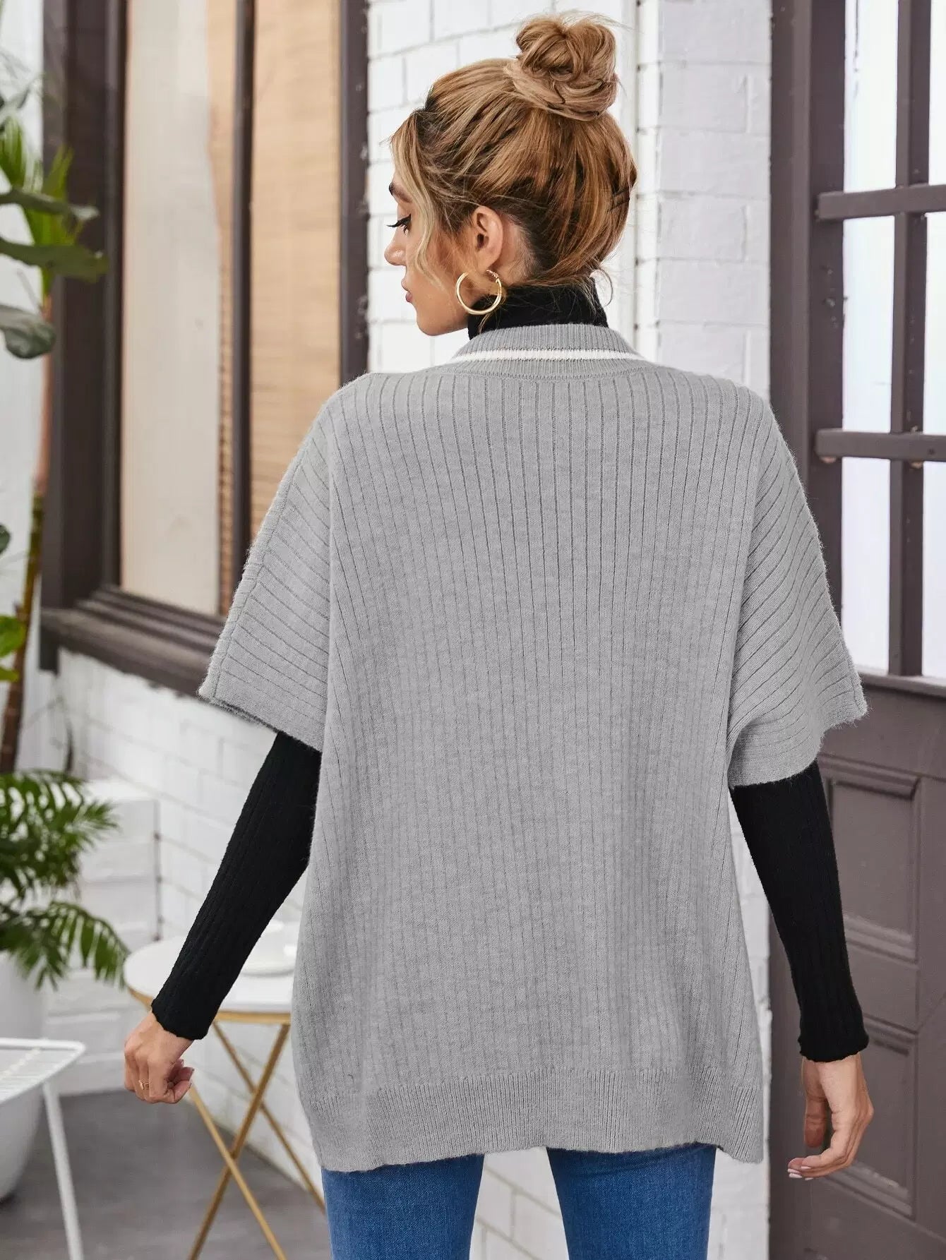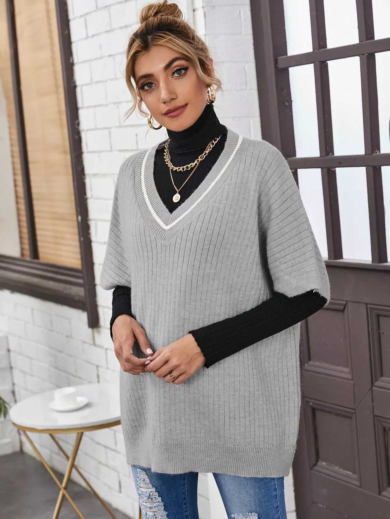 سترة مخططة برقبة مخططة بسترة كبيرة الحجم بدون تي شيرت