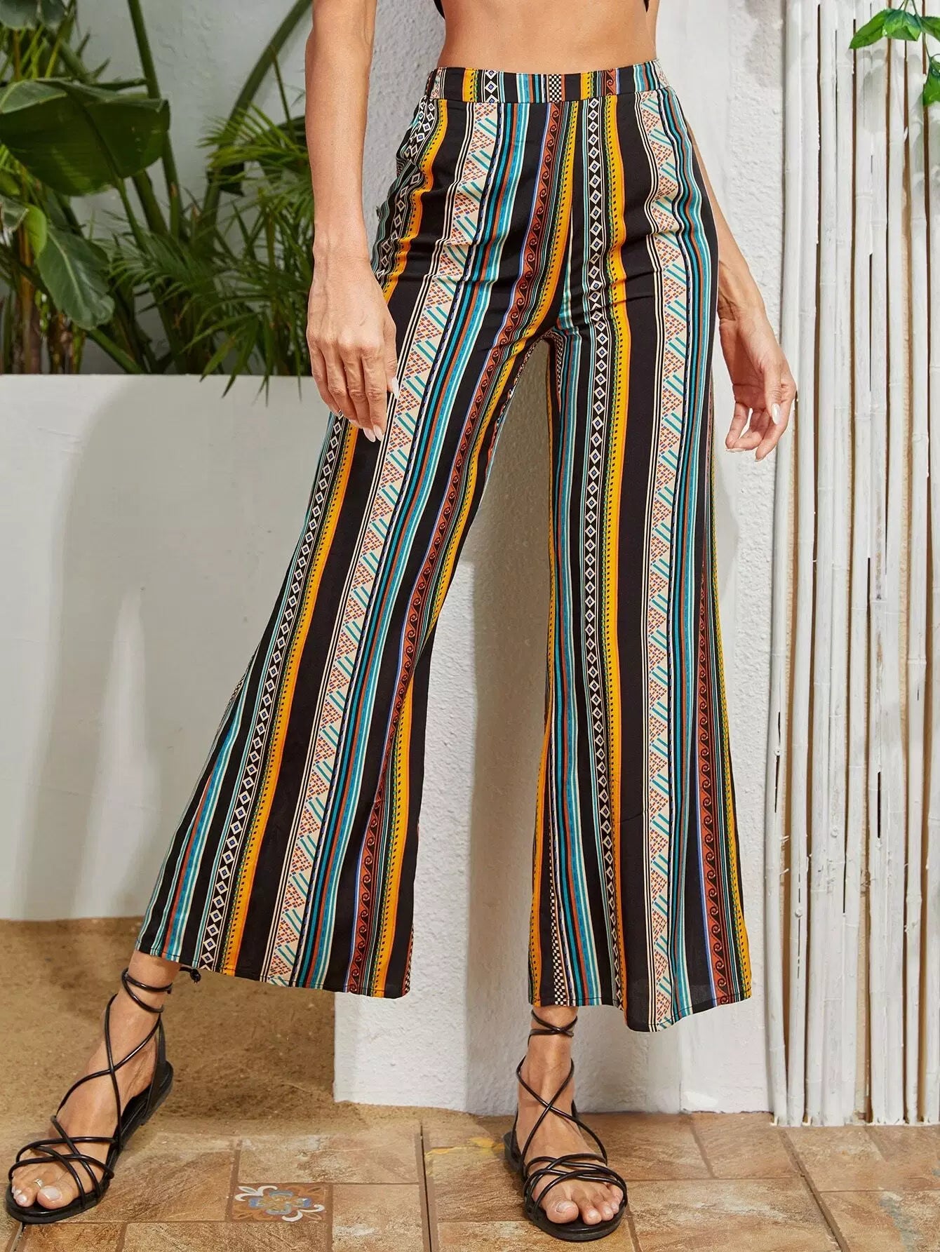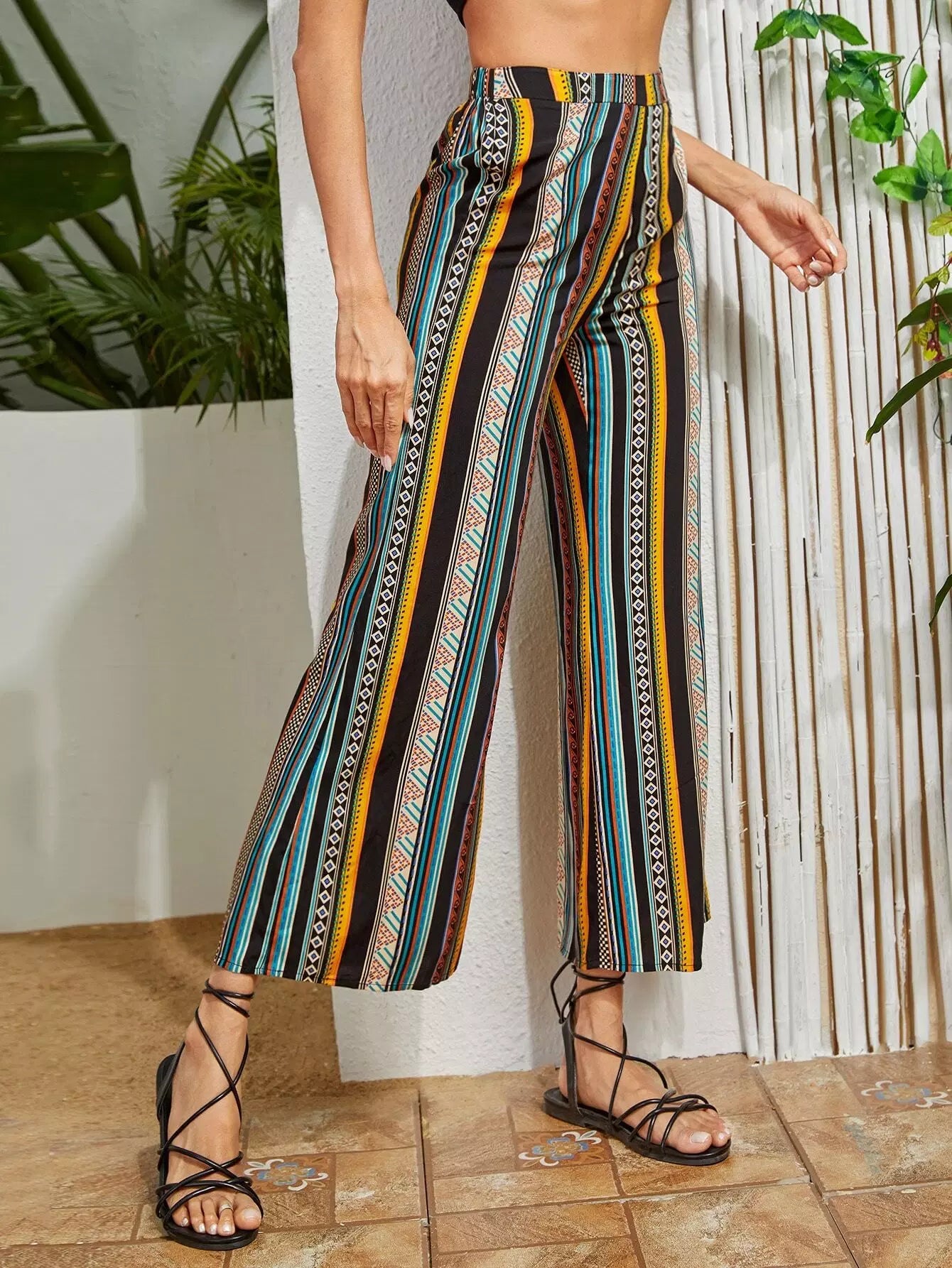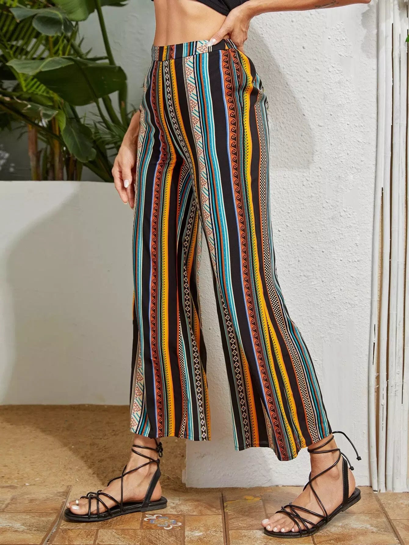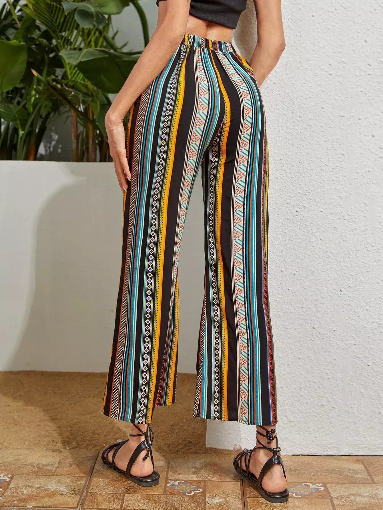 بنطلون بطبعة مخططة بطباعة واسعة الساقين