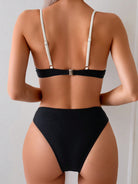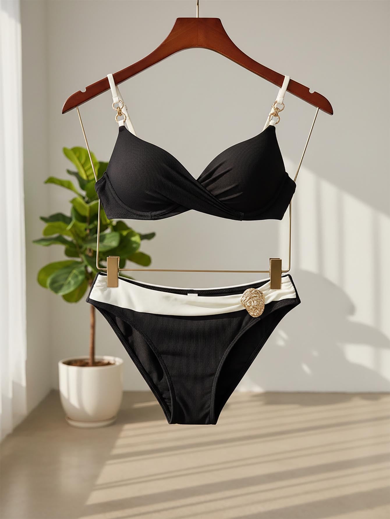 طقم صيفي للشاطئ مكون من قطعتين، بلوزة نسائية سوداء وبيضاء مزينة بحلقتين متداخلتين وحمالات مزينة بمثلث ذهبي اللون