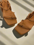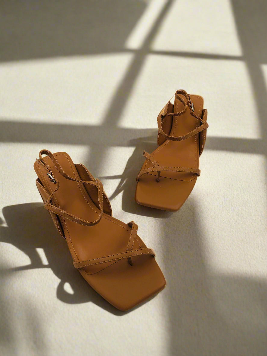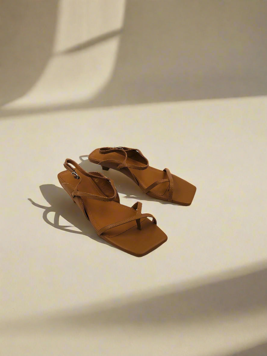 صندل نسائي بكعب صغير باللون الجملي مع مقدمة مربعة مفتوحة، وتصميم شريط متقاطع وحزام كاحل. مثالي لإطلالات الصيف.