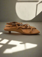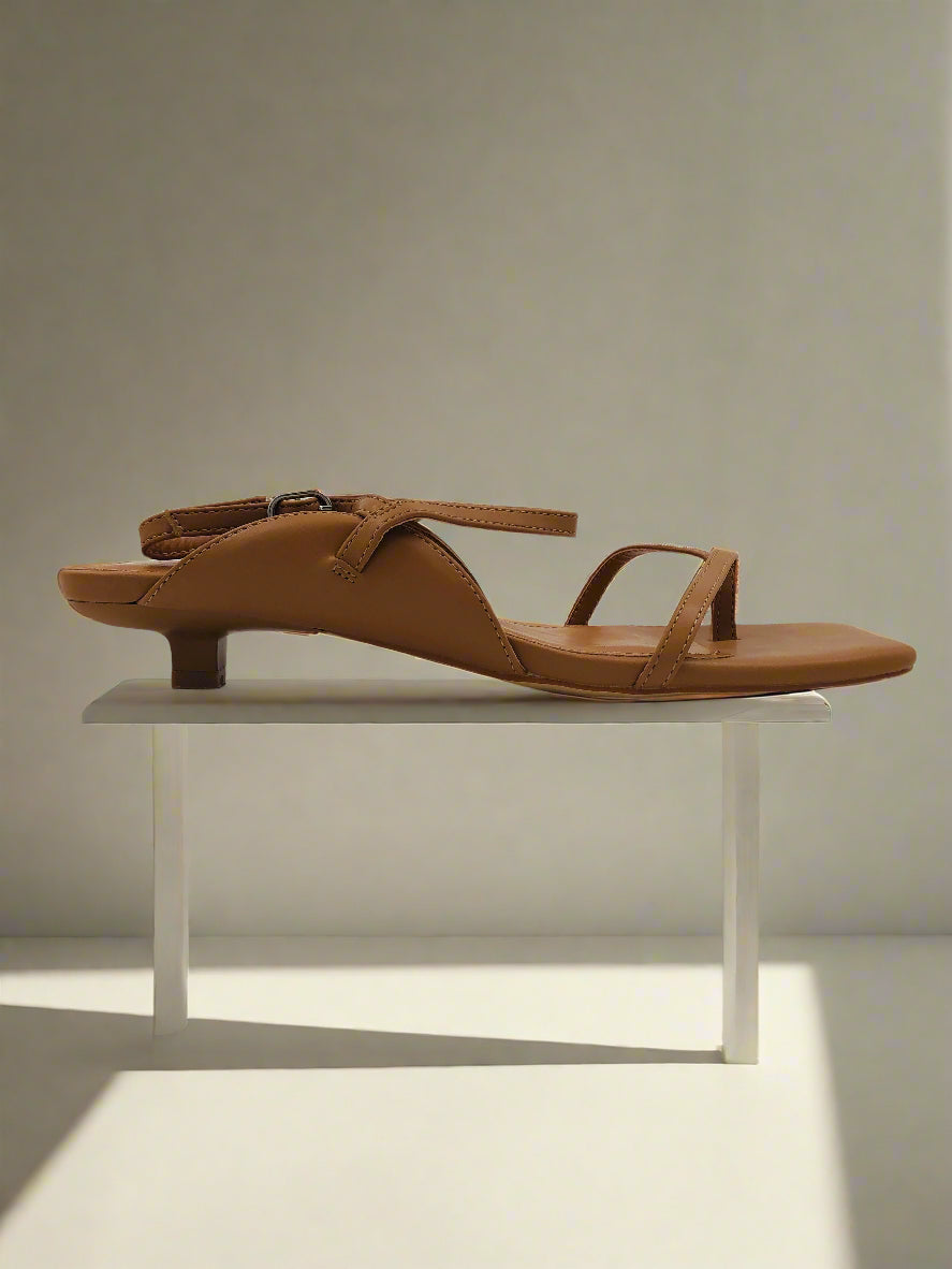 صندل صيفي بكعب صغير باللون الجملي مع تصميم شريط متقاطع