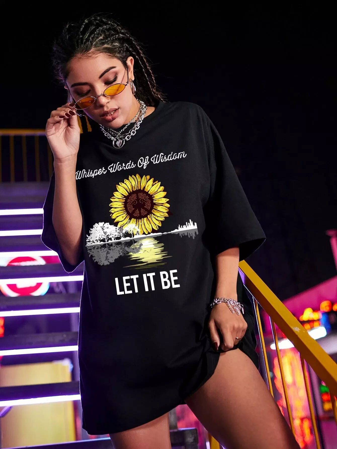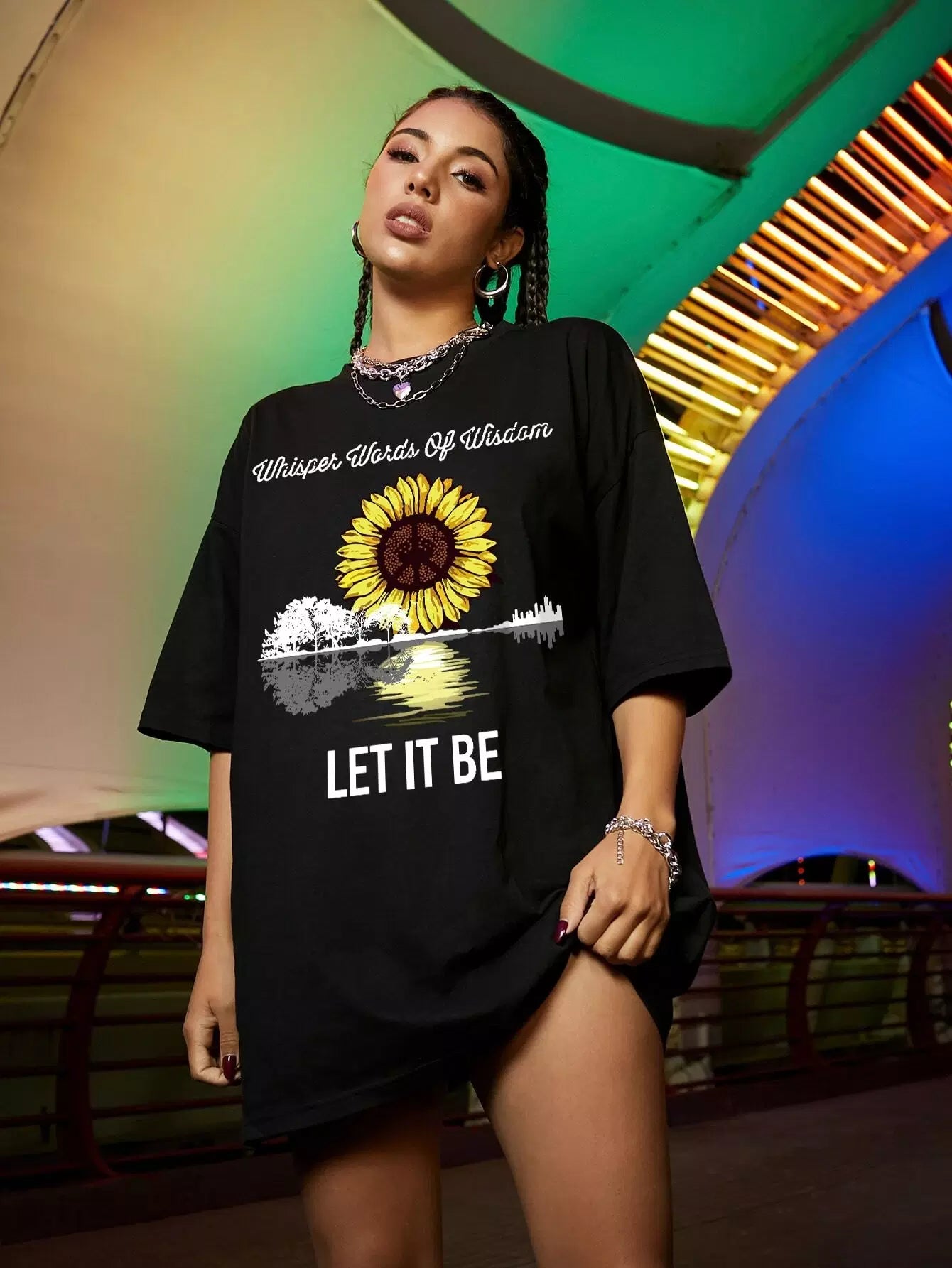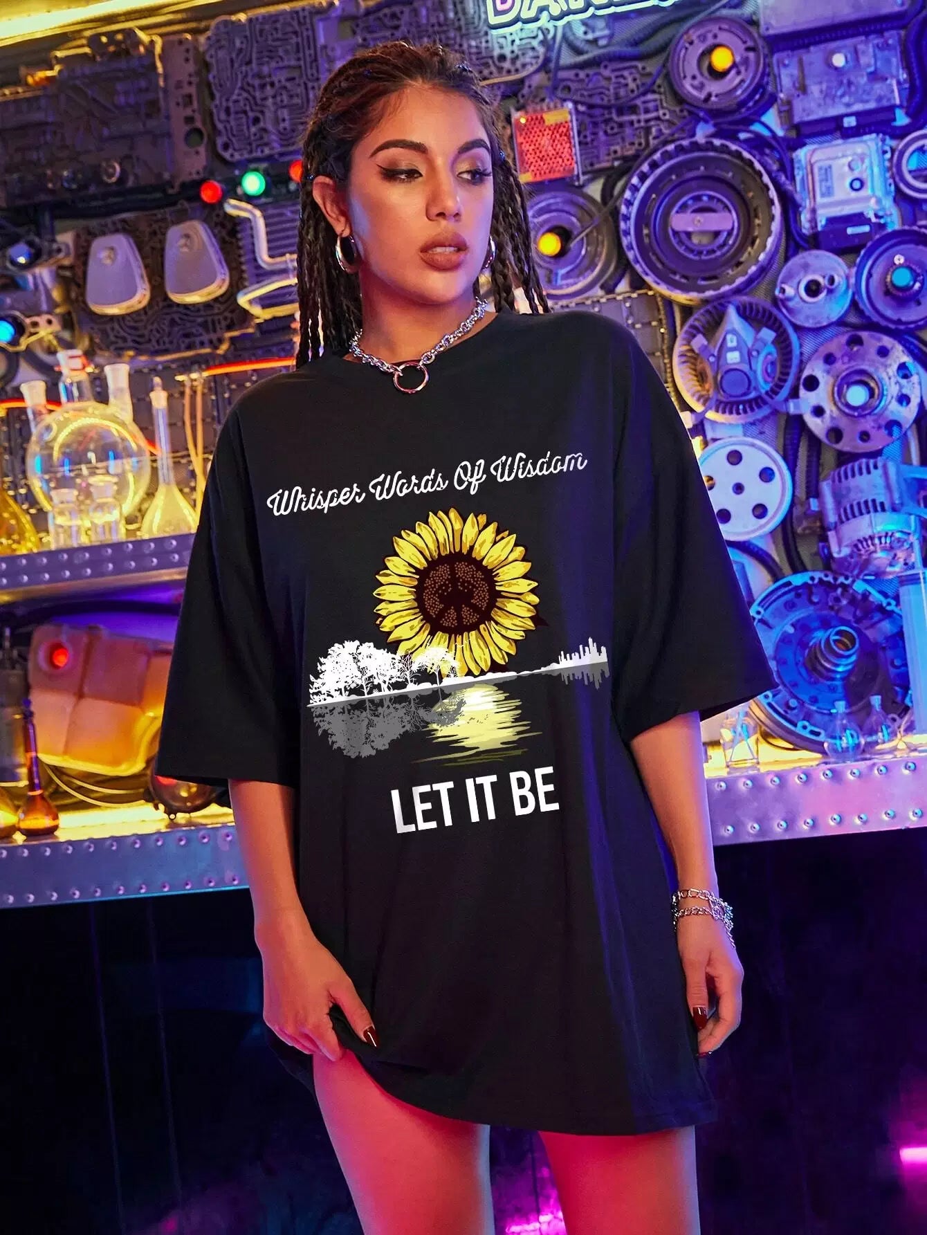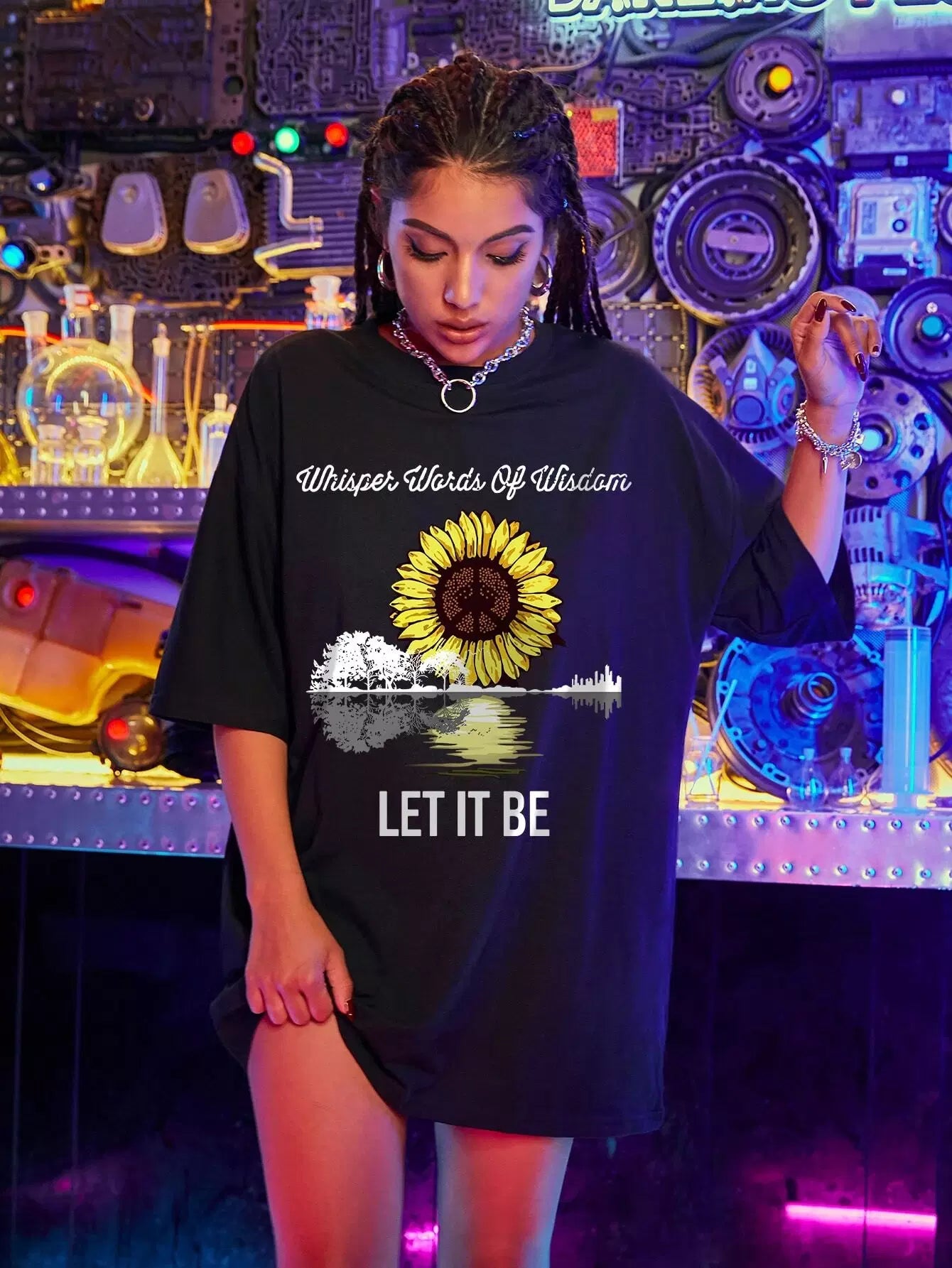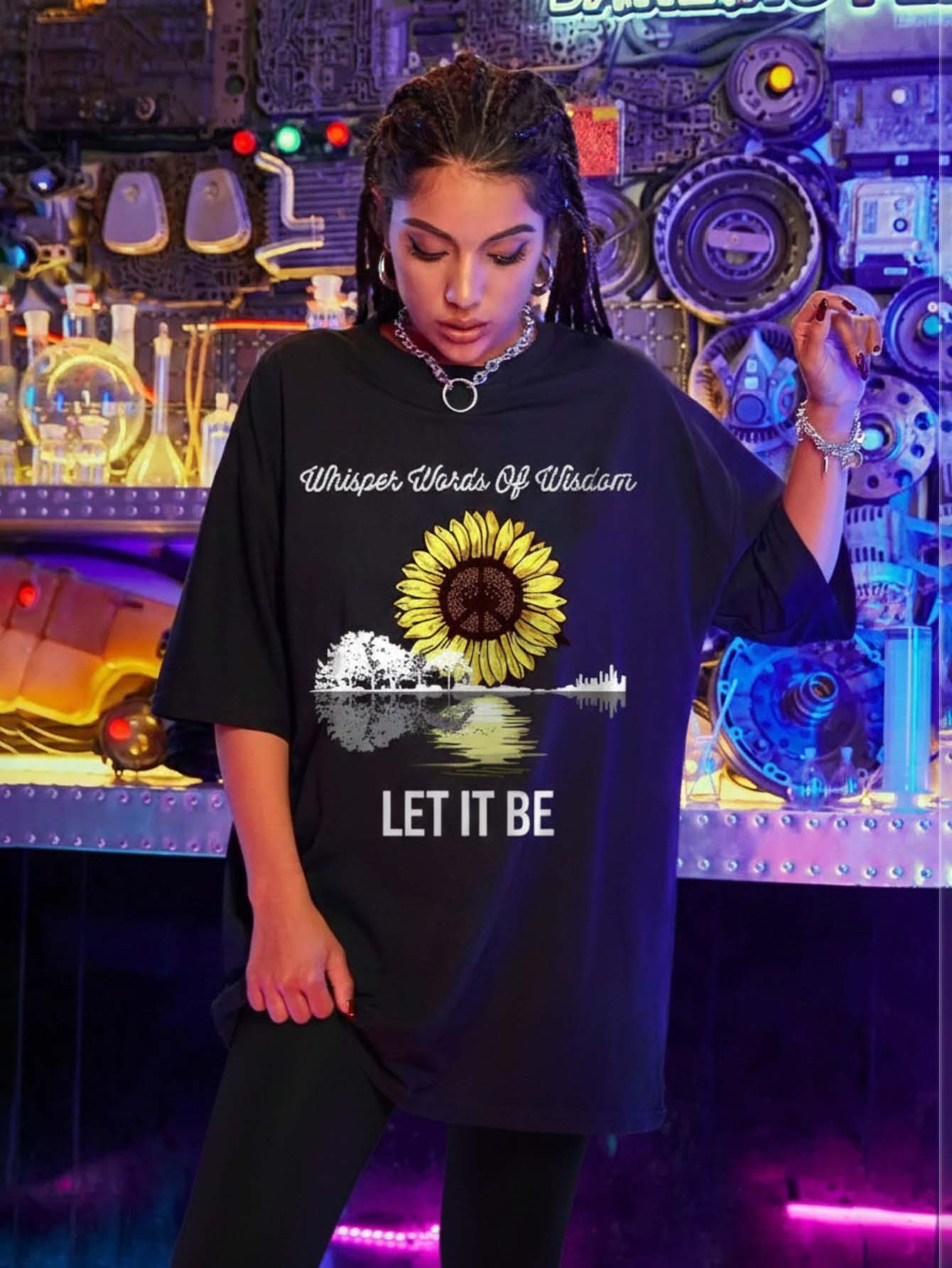 تي شيرت دوار الشمس وشعارها جرافيك كبير الحجم