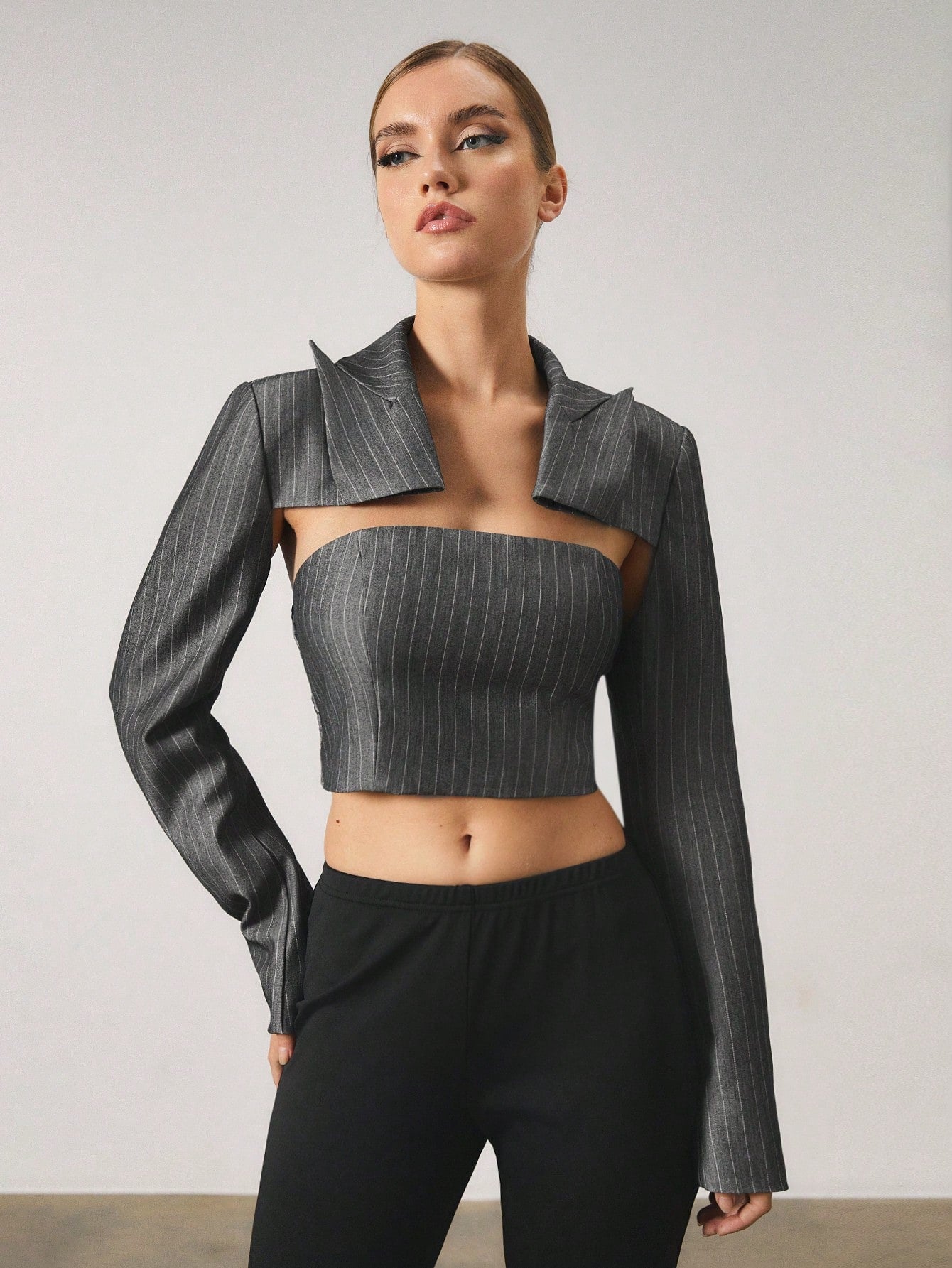 SURIMA Women's Striped Patchwork Lapel Long Sleeve Cropped Blazer With Tube Top, Retro Inspired