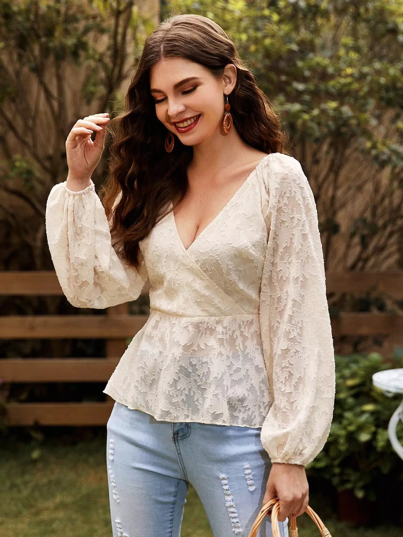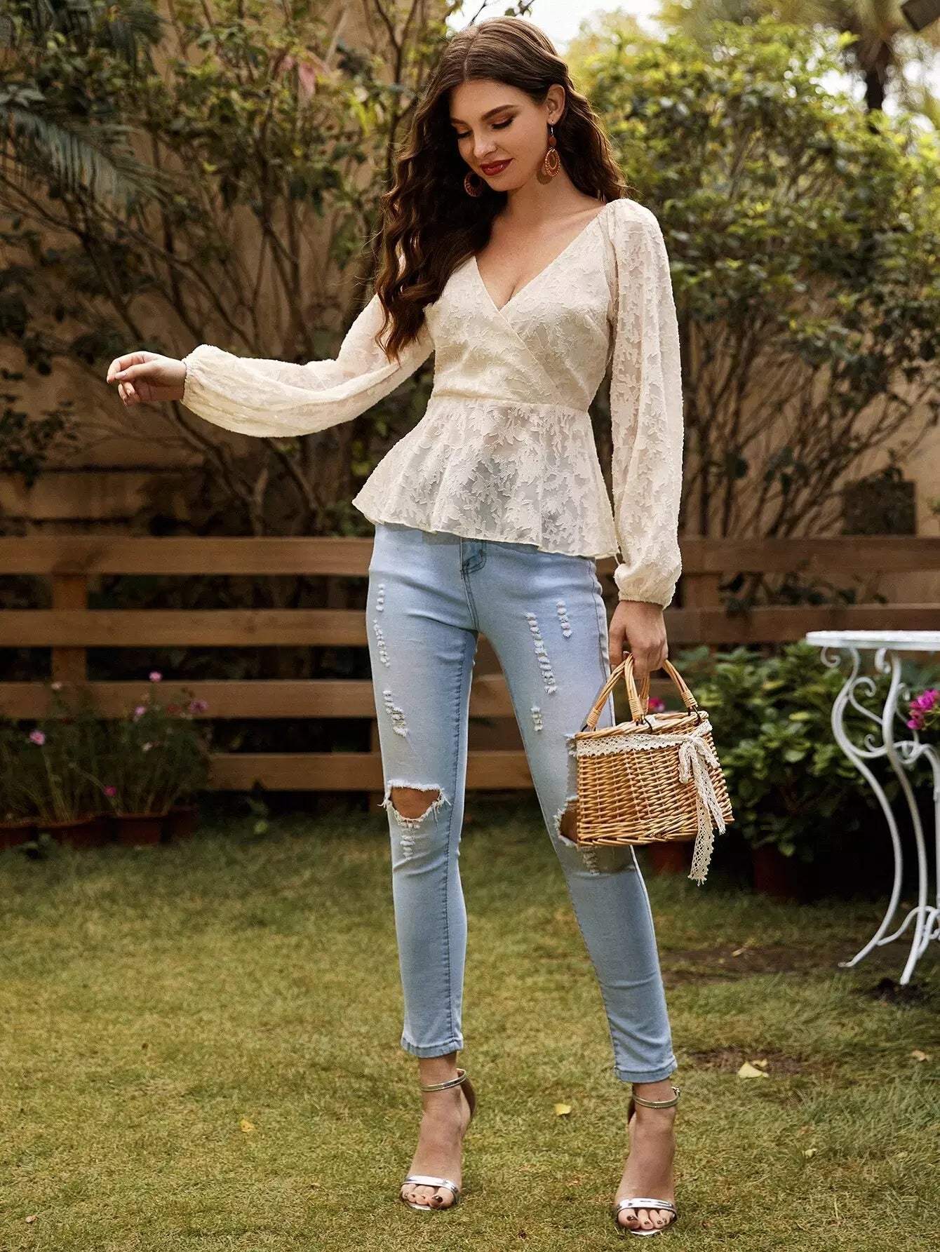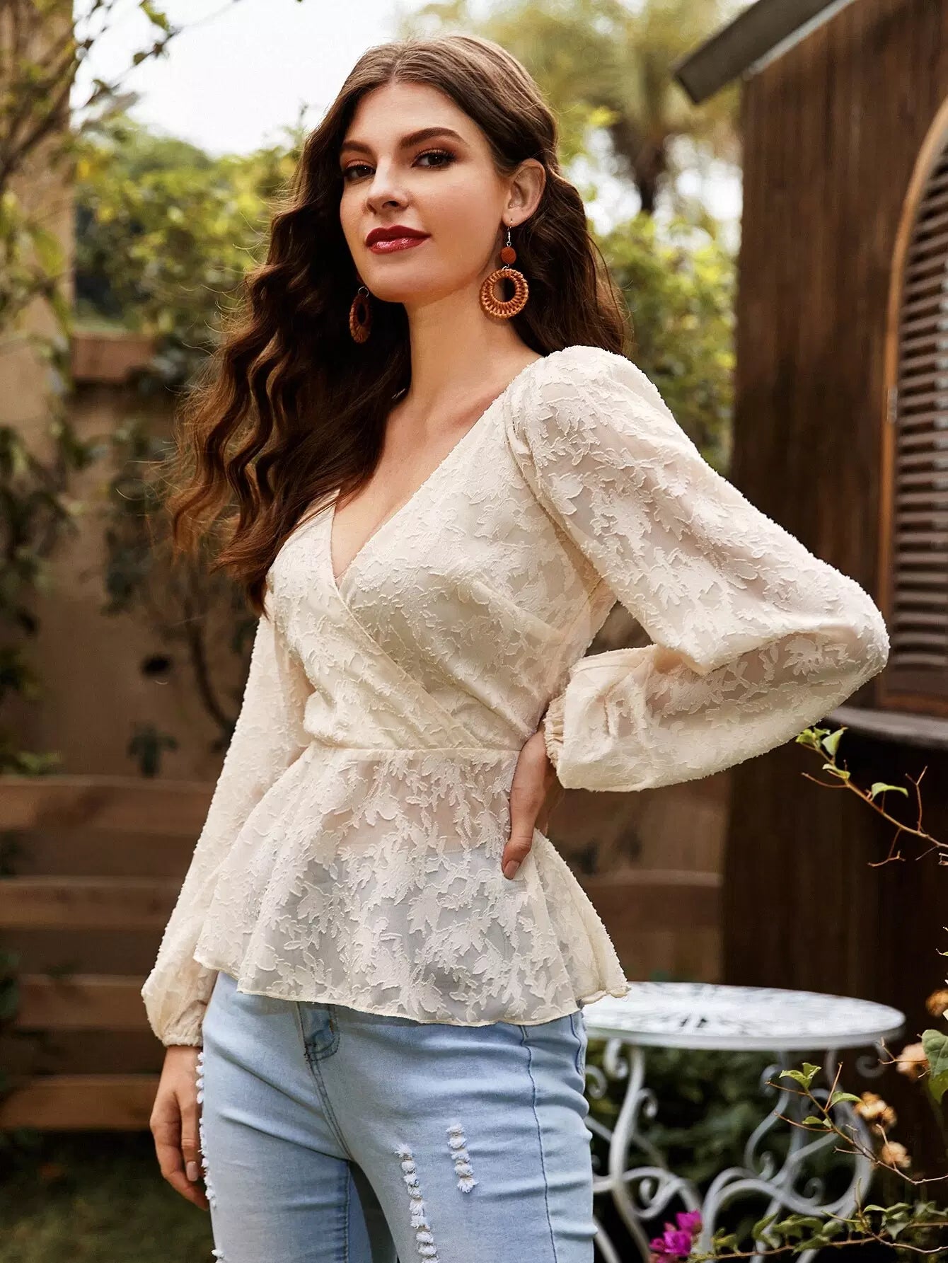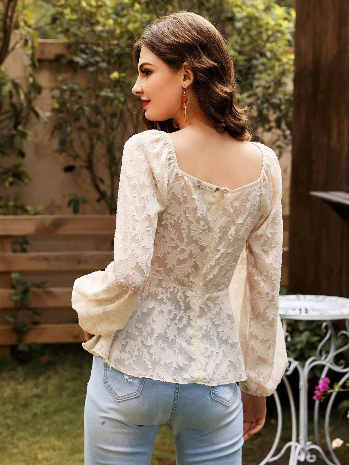 بلوزة بياقة بياقة بياقة بياقة برقبة جانبية مزينة بتطريزات بأكمام فانوسية