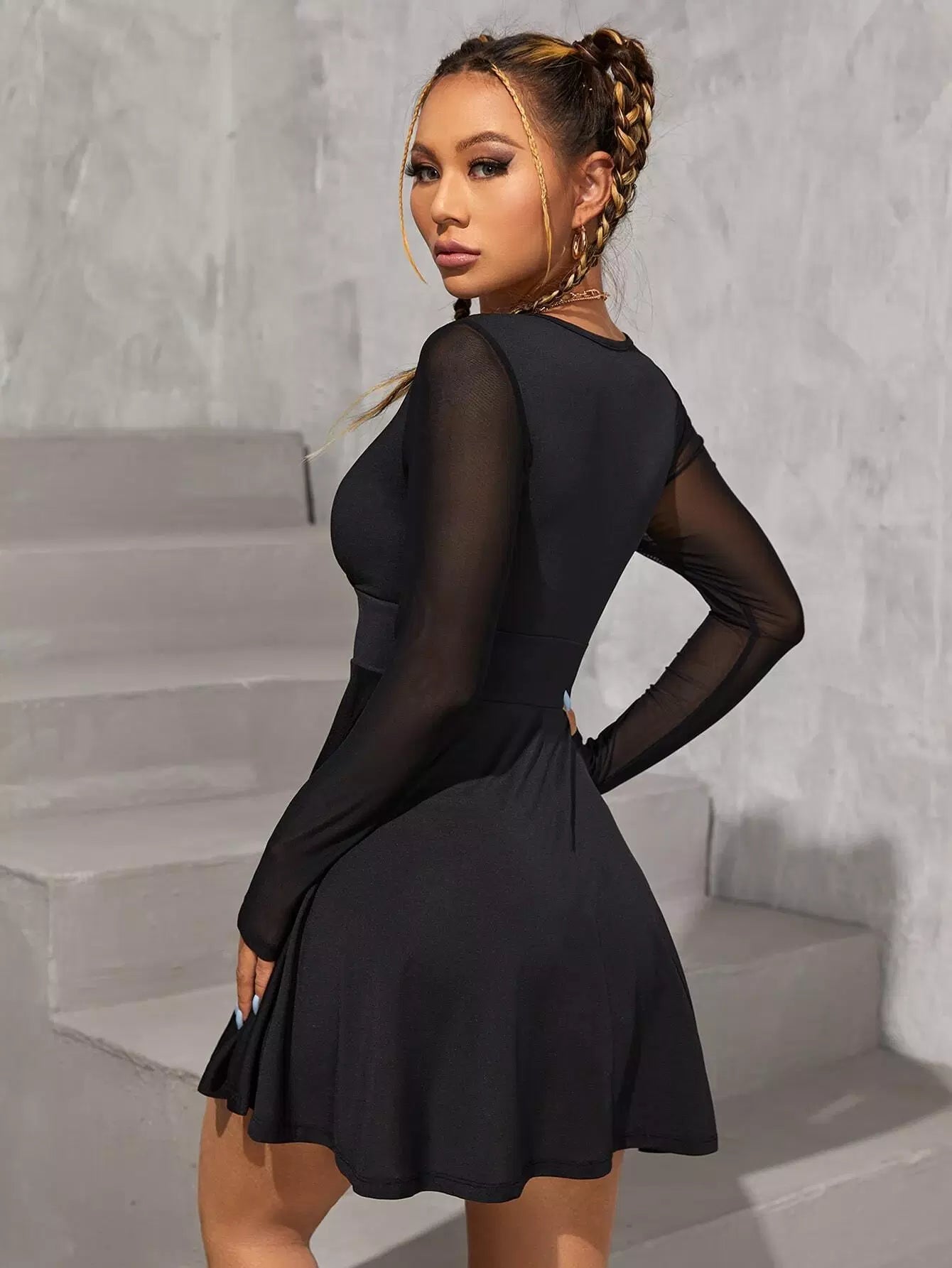 فستان برقبة دائرية وأكمام شبكية