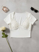 تي شيرت برقبة حلوة بياقة بلون مغاير من الدانتيل