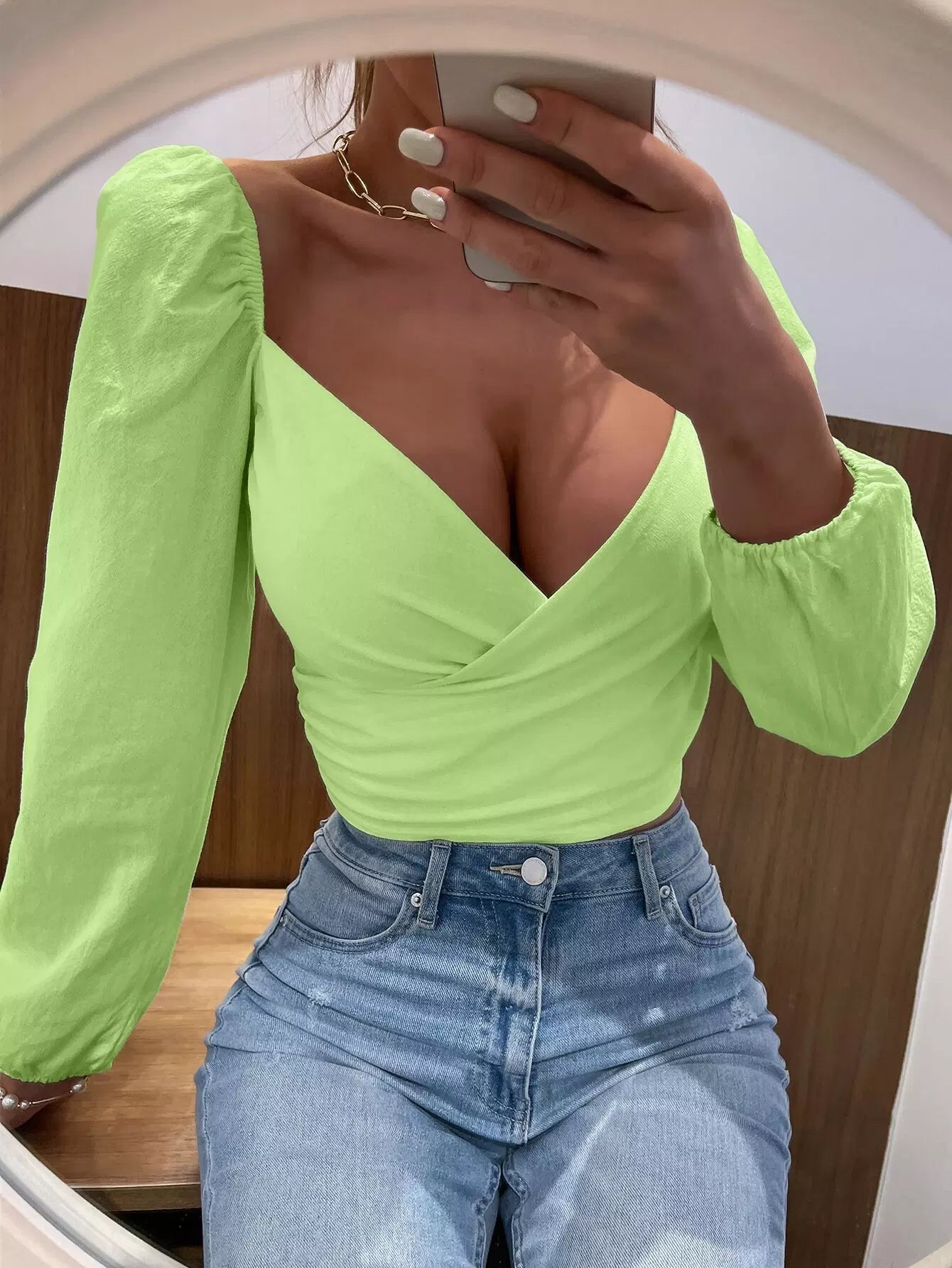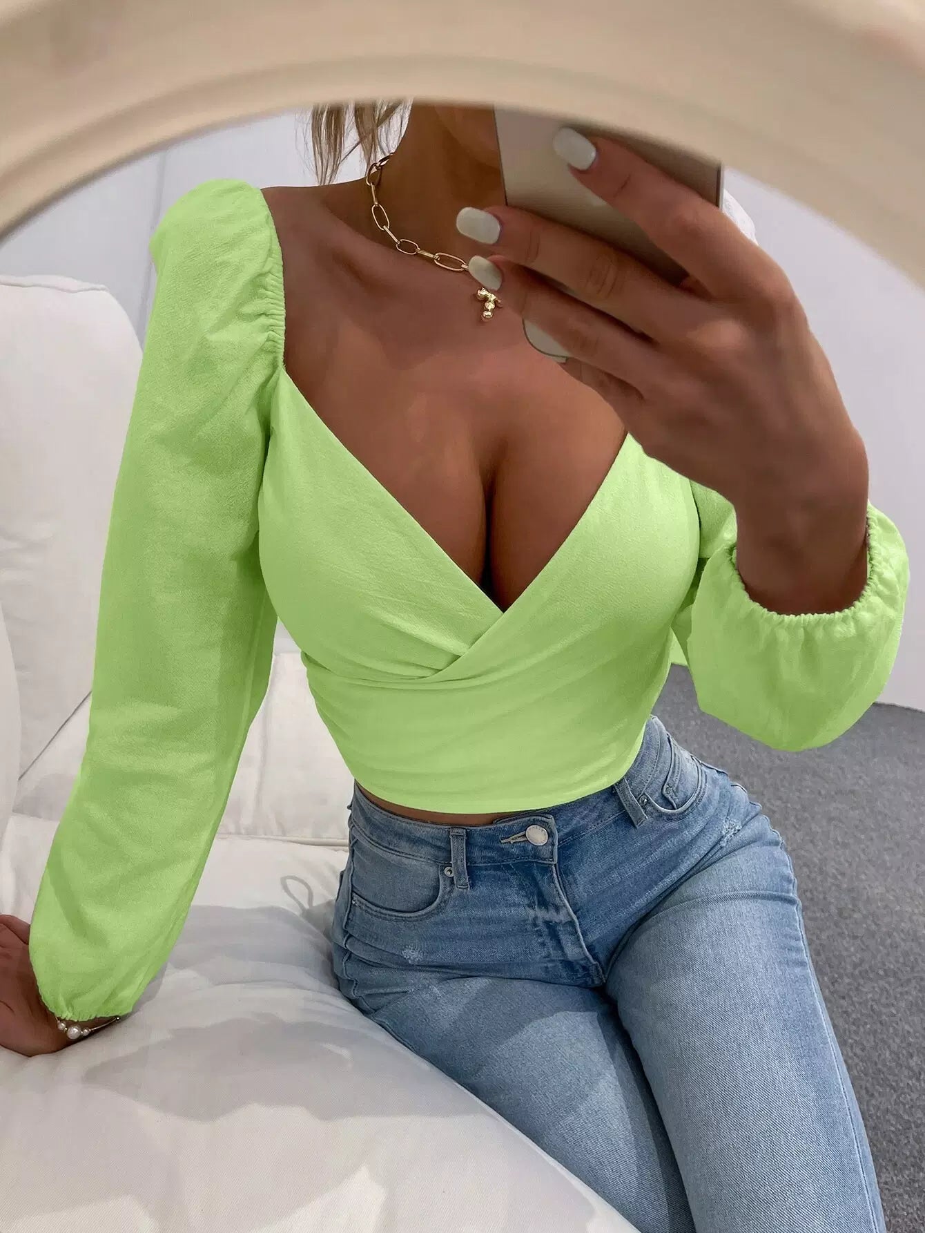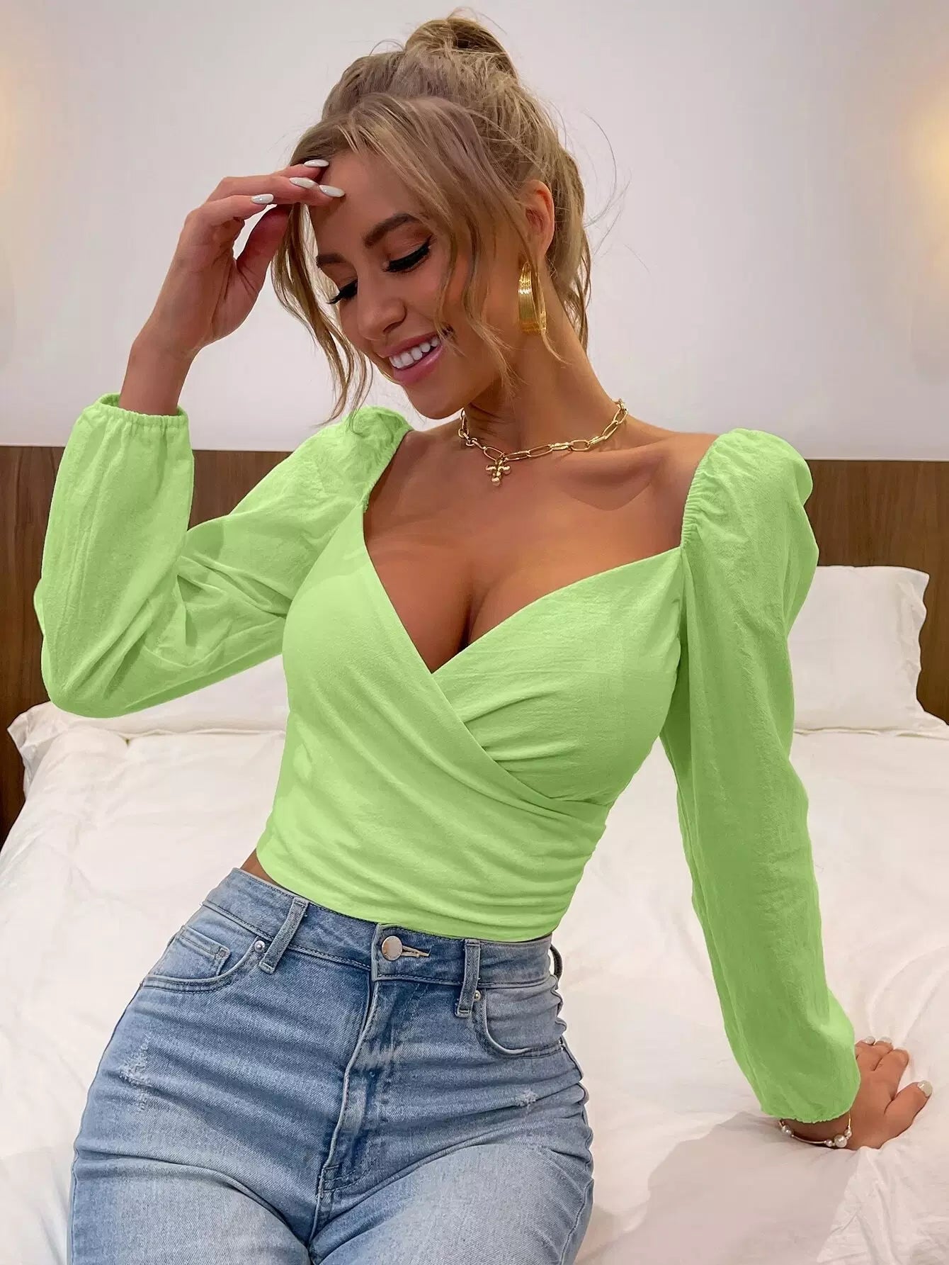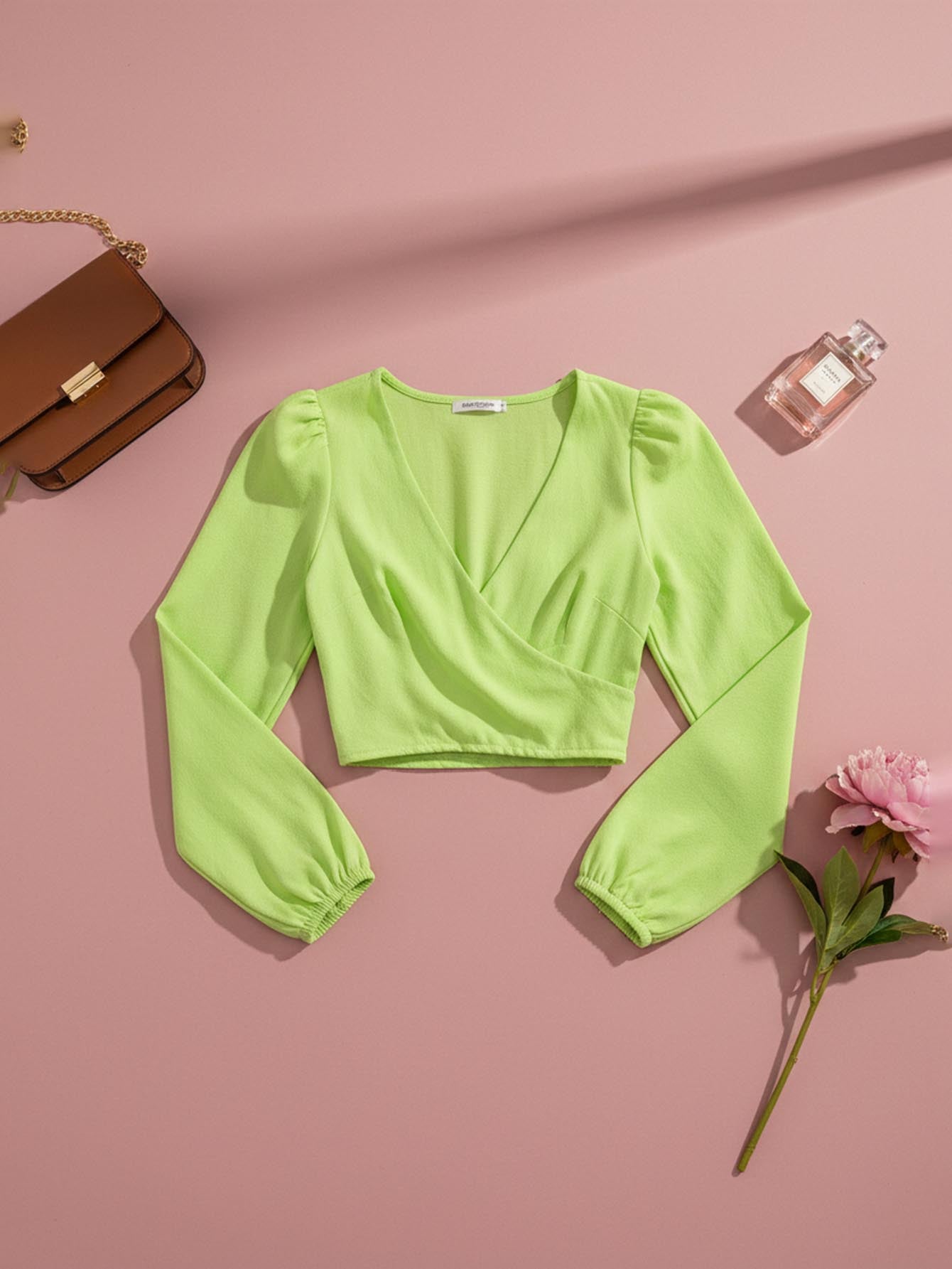 بلوزة قصيرة بأكمام منفوخة برقبة منفوشة بفتحة عنق على شكل قلب