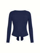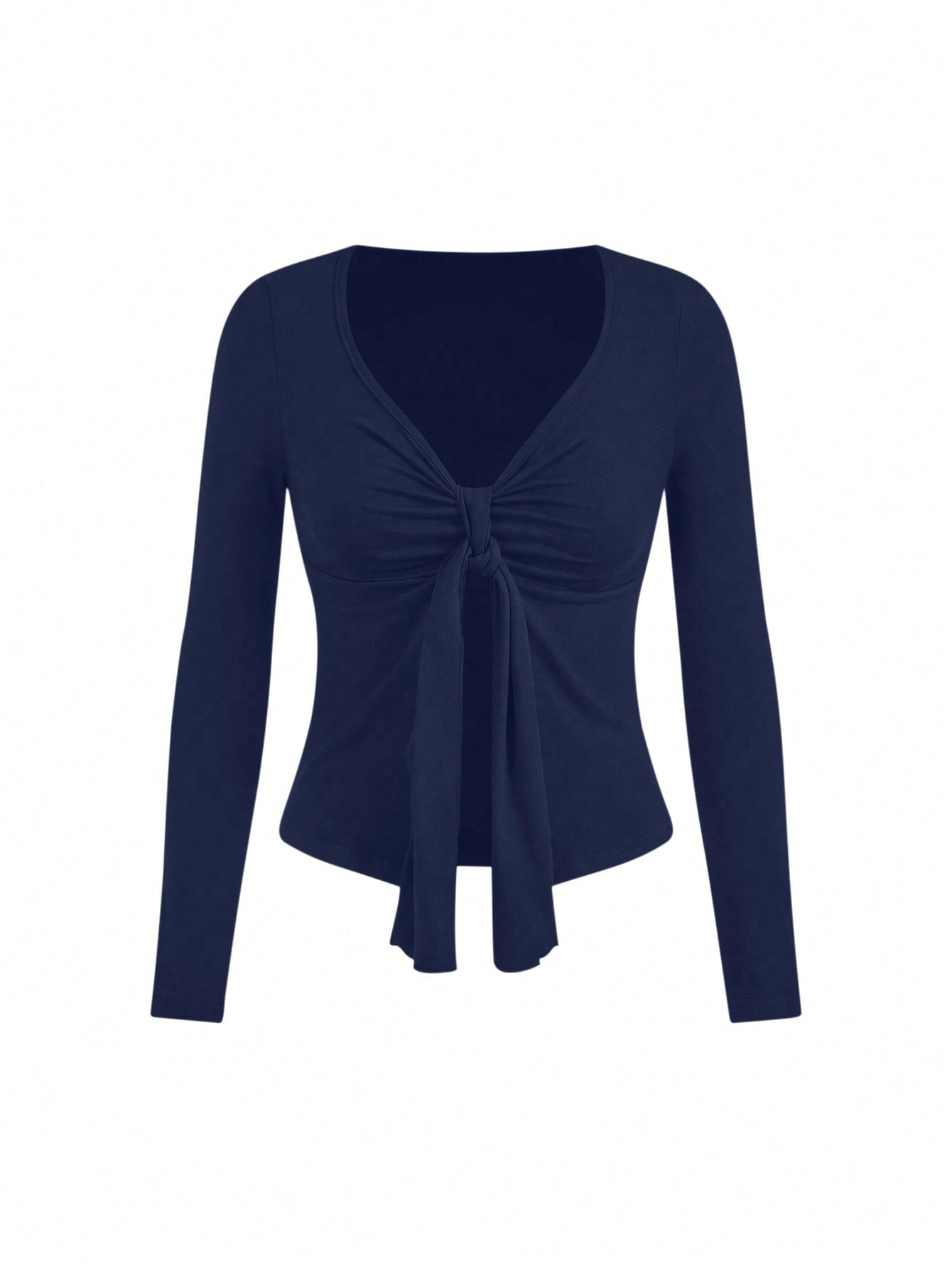 تيشيرت نسائي بأكمام طويلة بلون موحد من سويترا، بتصميم مكشكش من الأمام.