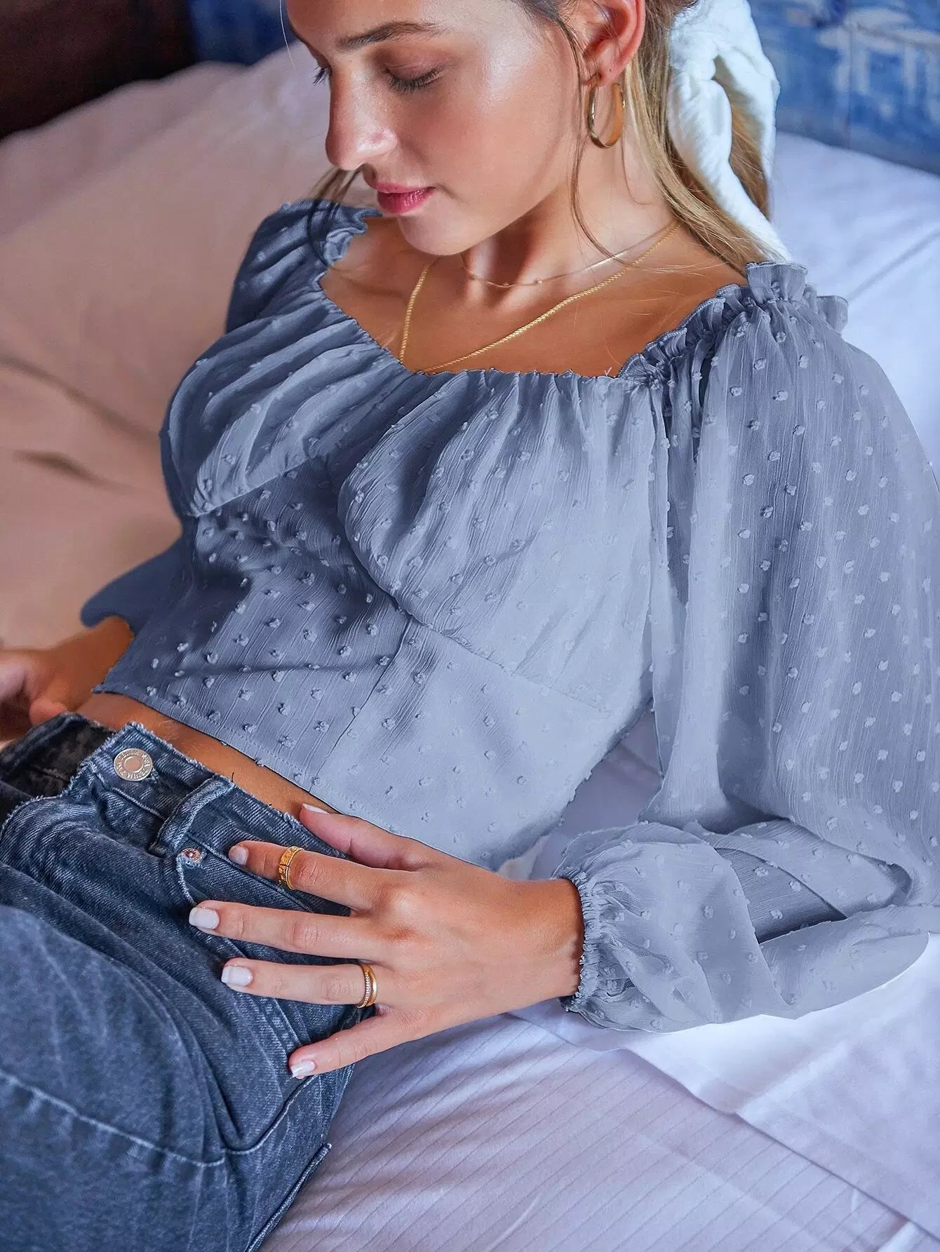 بلوزة سويسرية منقّطة بنقشة الخس بقصّة قصيرة بحواف منقّطة بالحليب