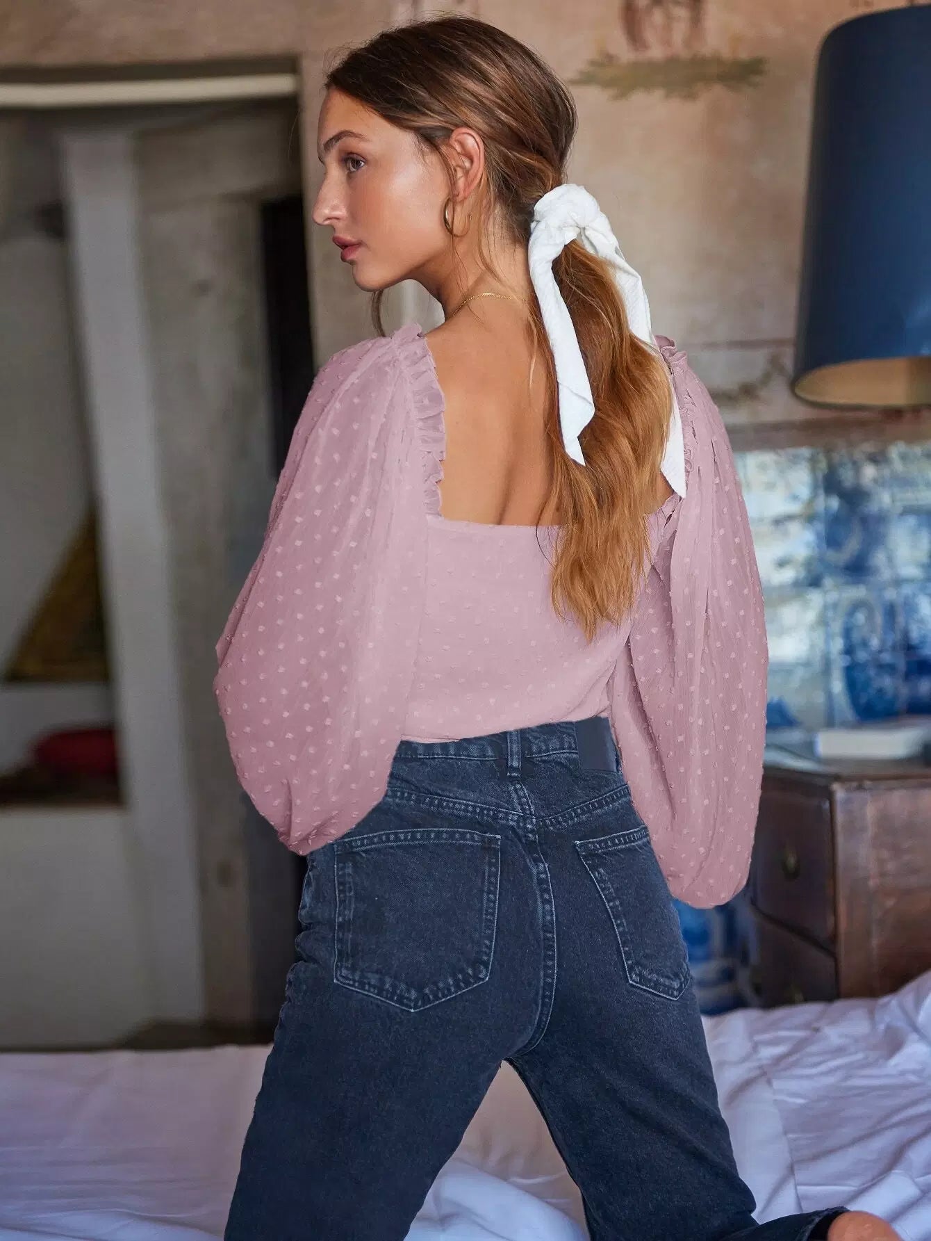 بلوزة سويسرية منقّطة بنقشة الخس بقصّة قصيرة بحواف منقّطة بالحليب