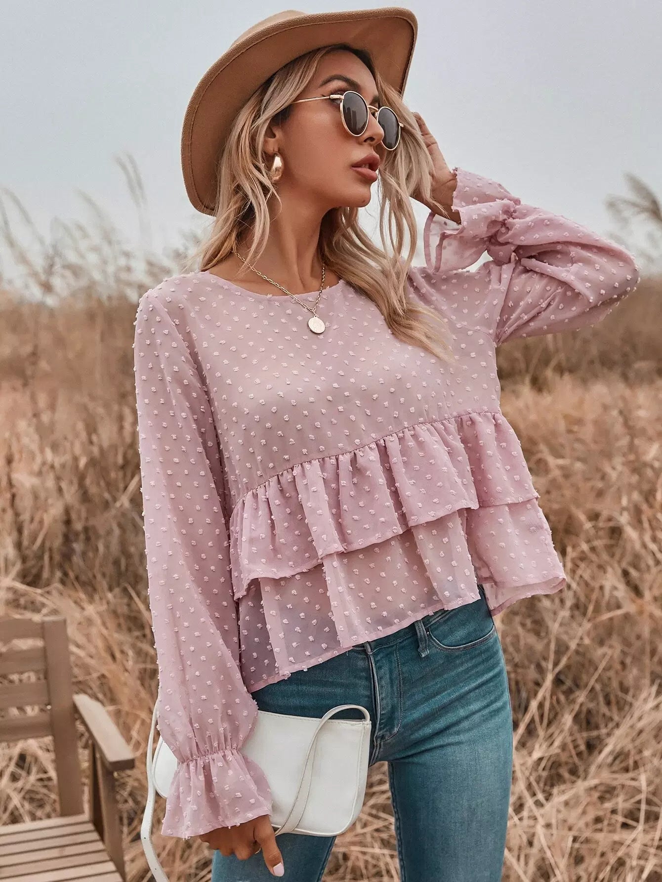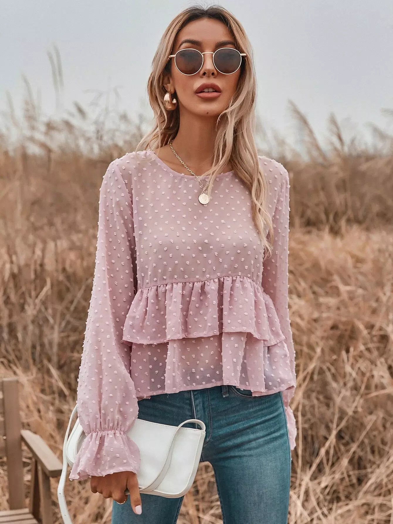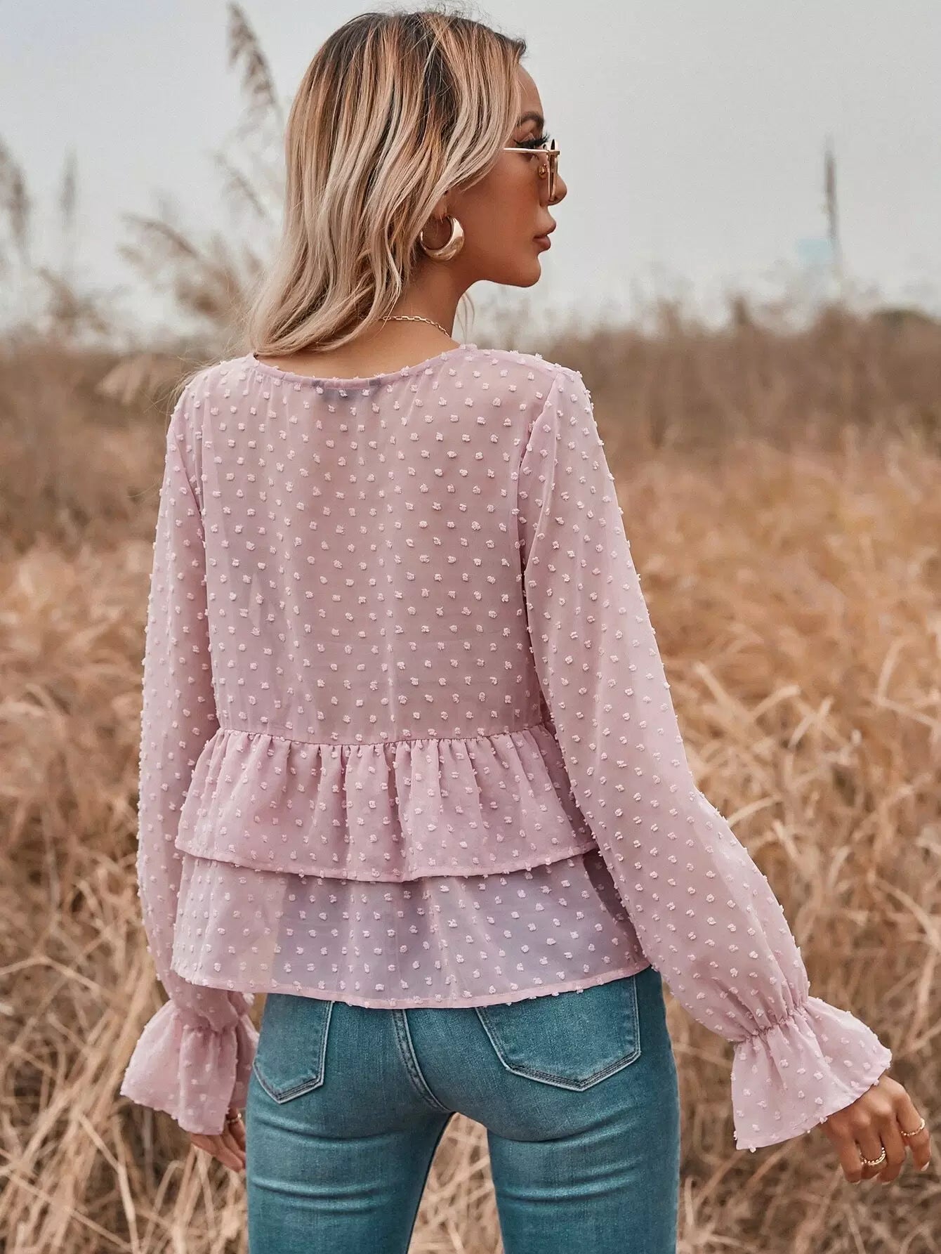 بلوزة شيفون منقّطة سويسرية شفافة ذات طبقات من الكشكش