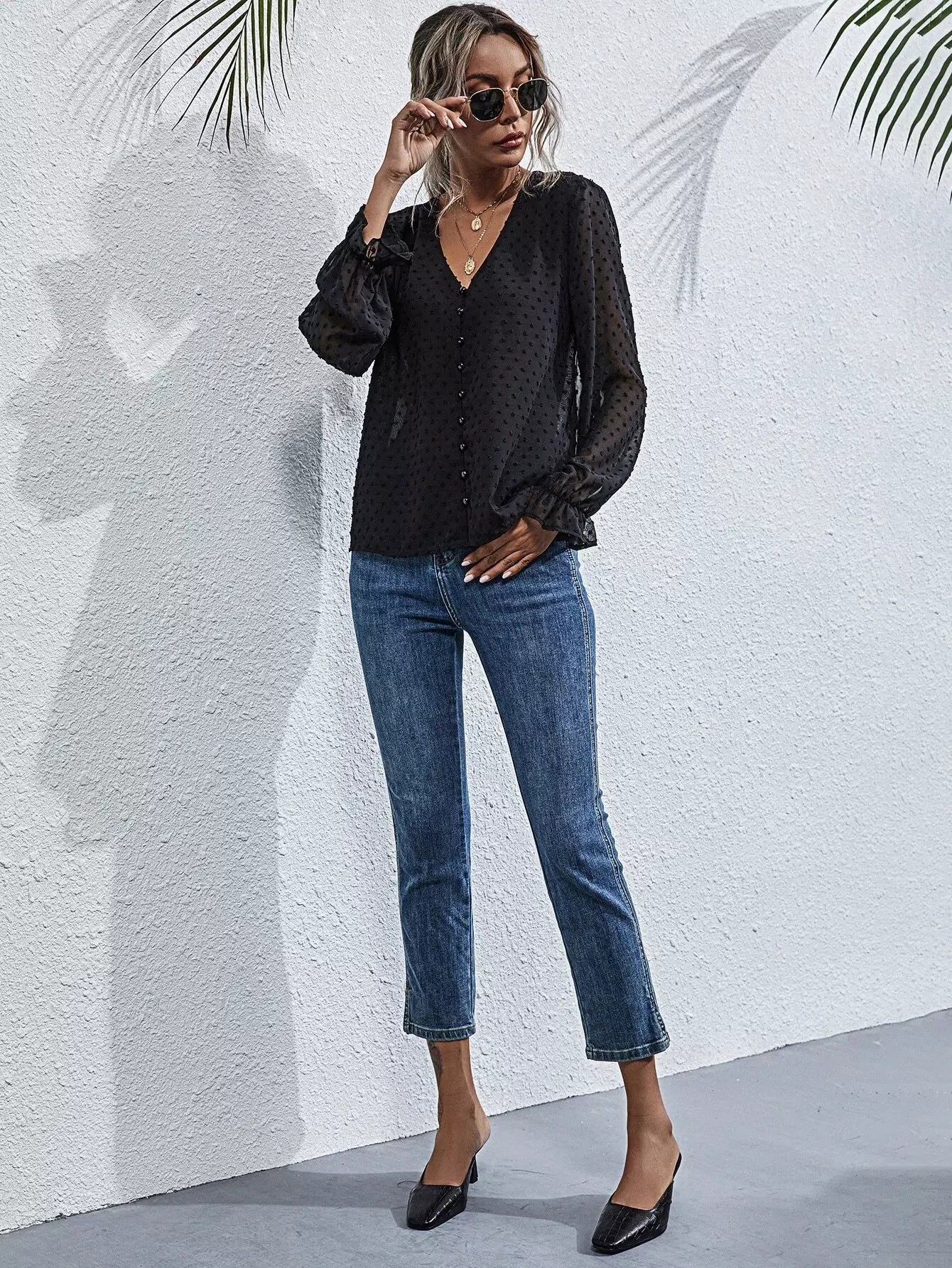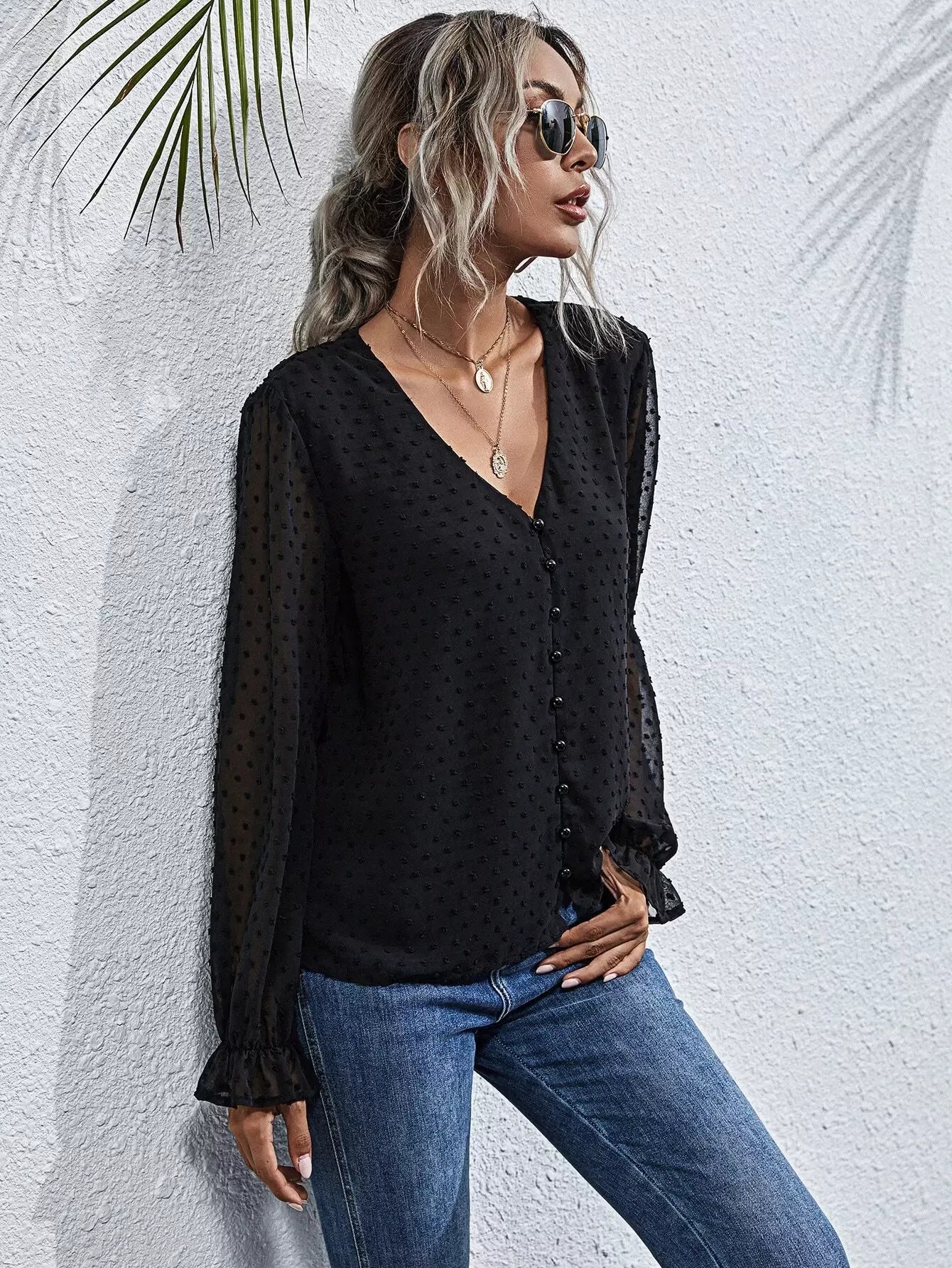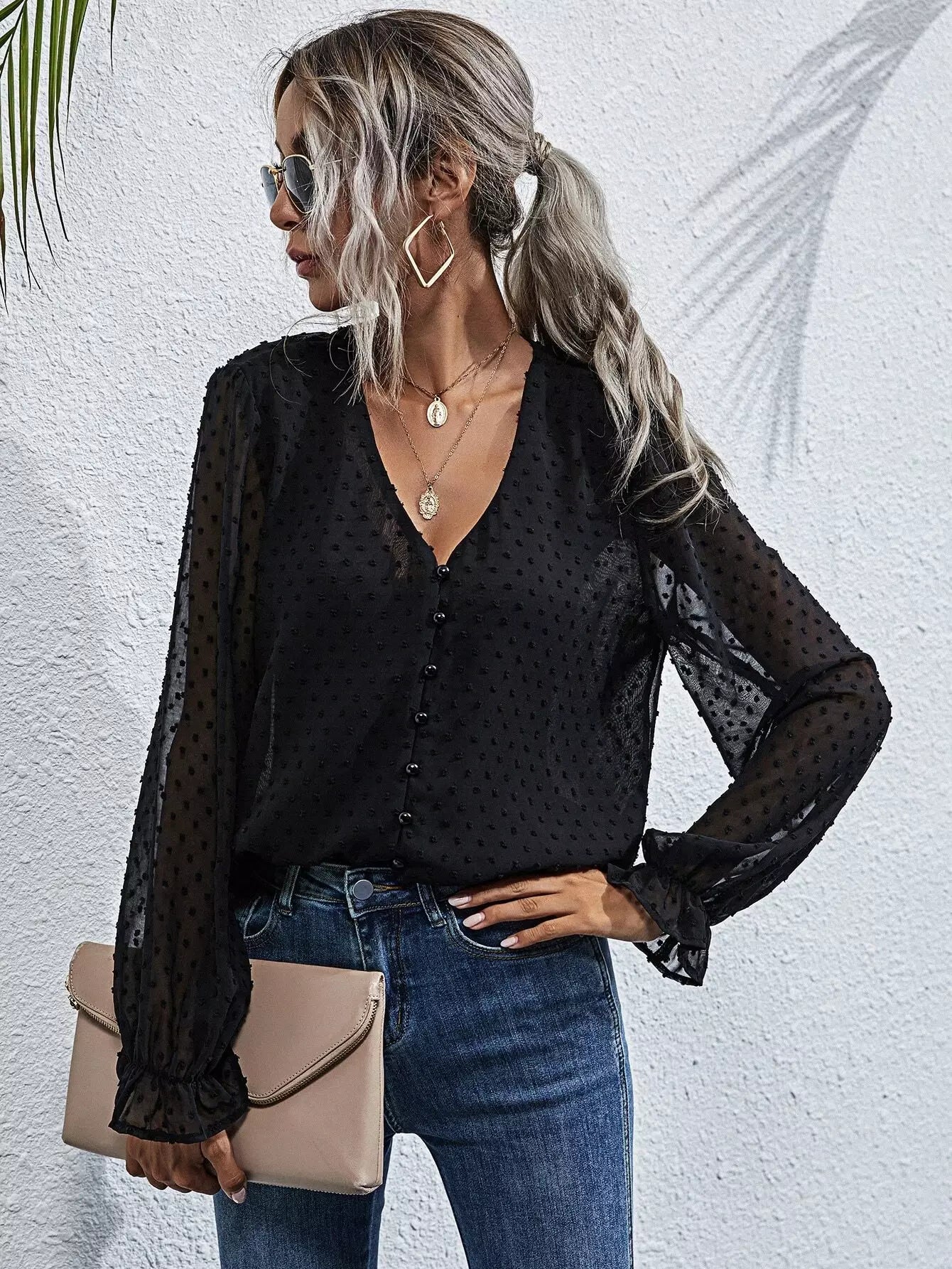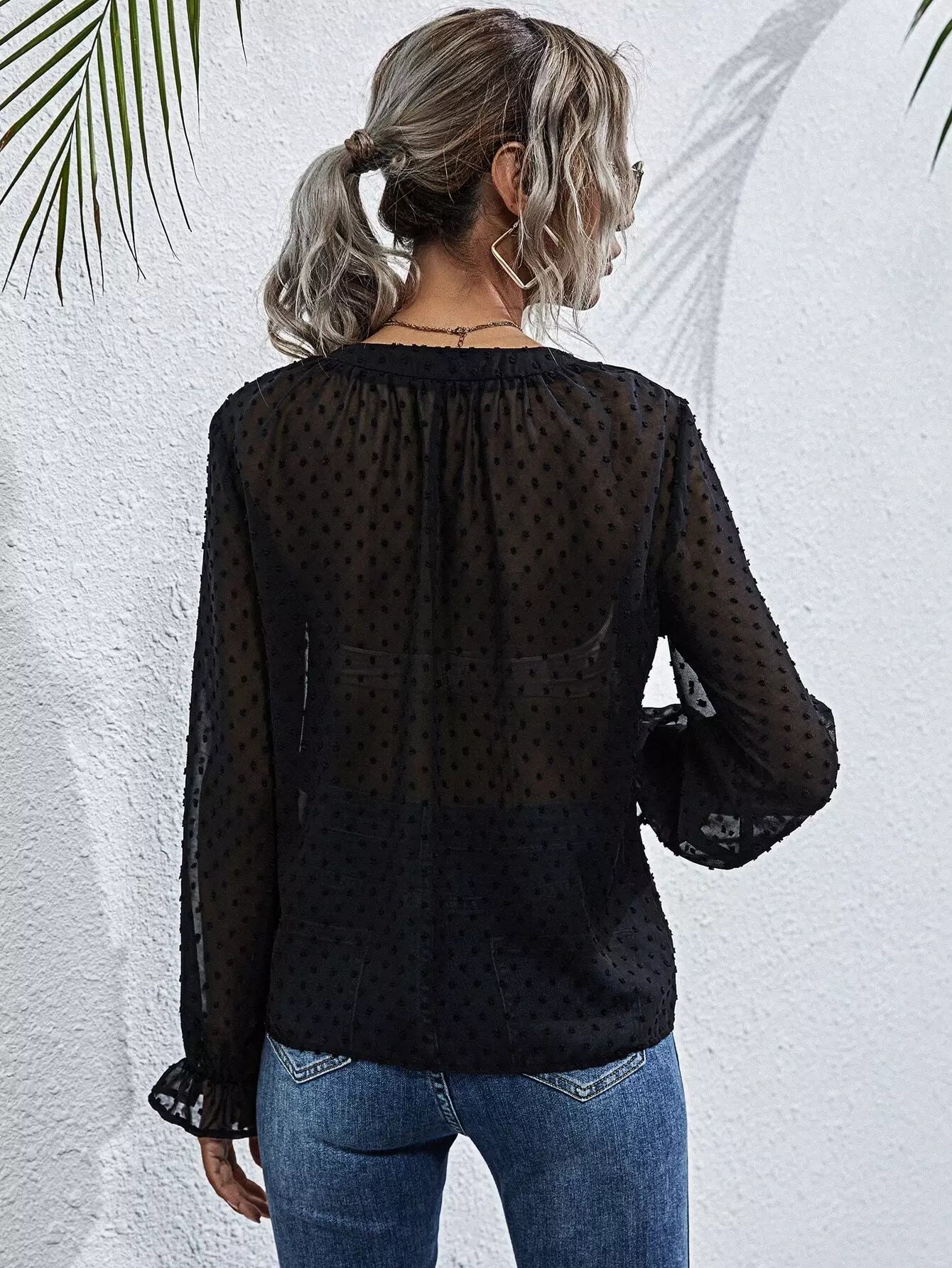 بلوزة شيفون بأكمام شيفون منفوشة على شكل V بياقة منقطة على شكل V