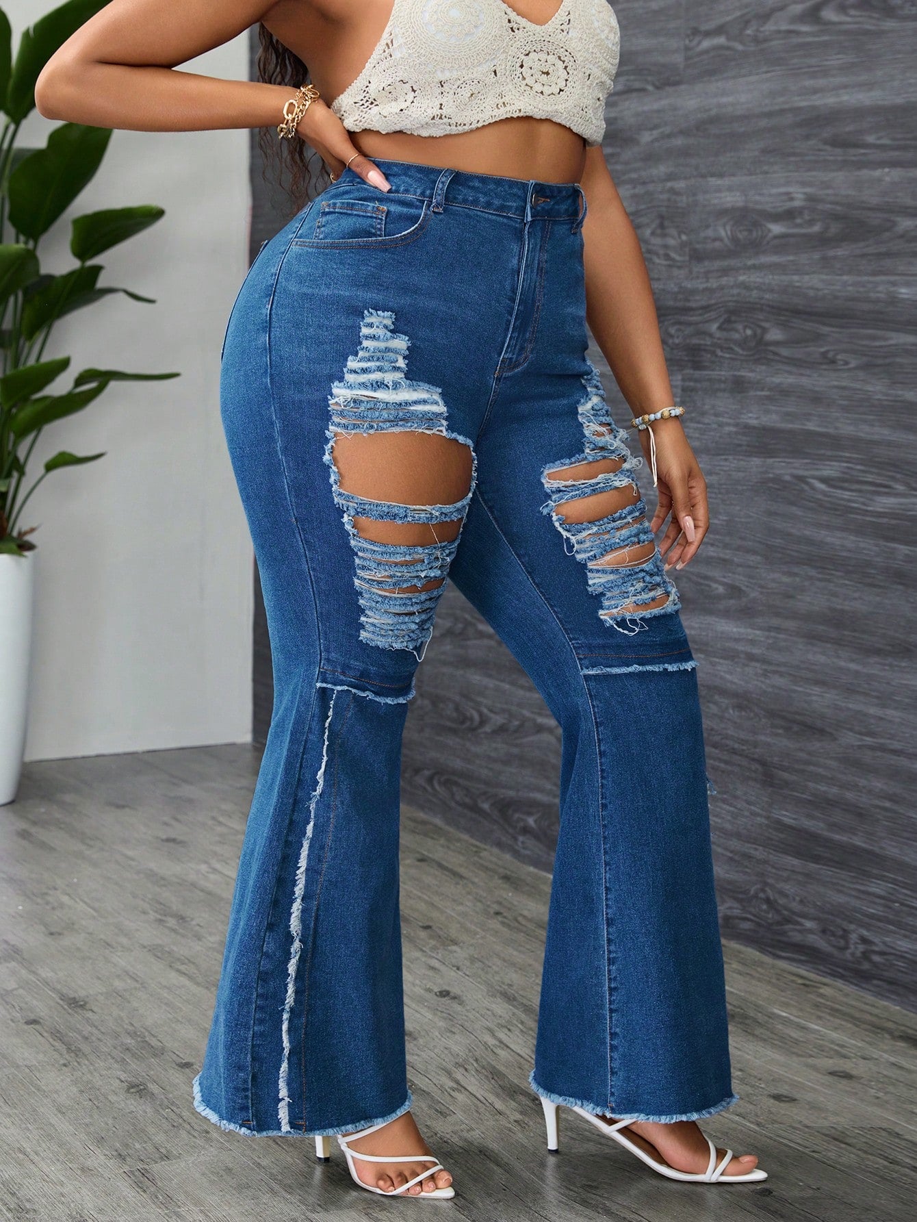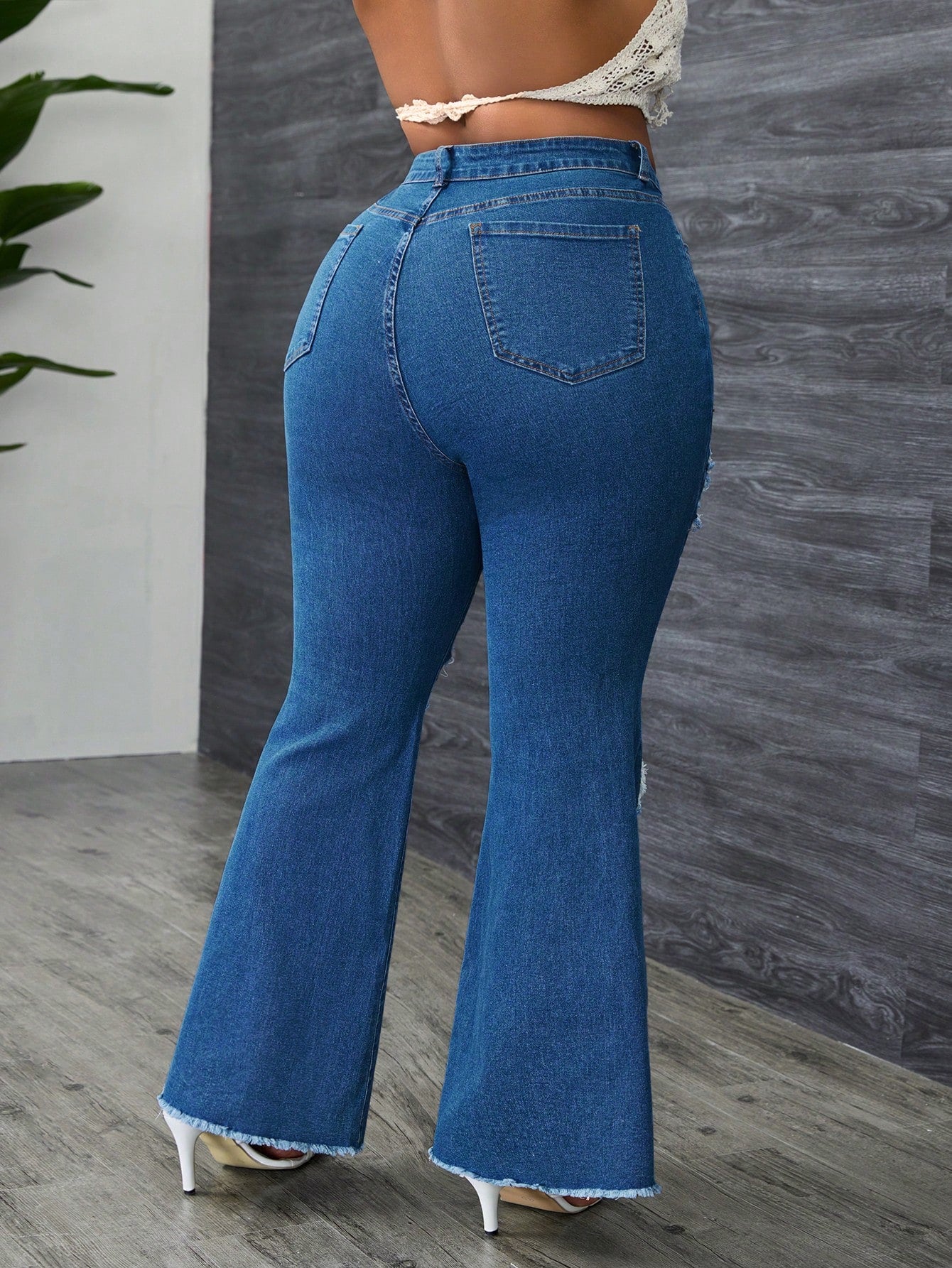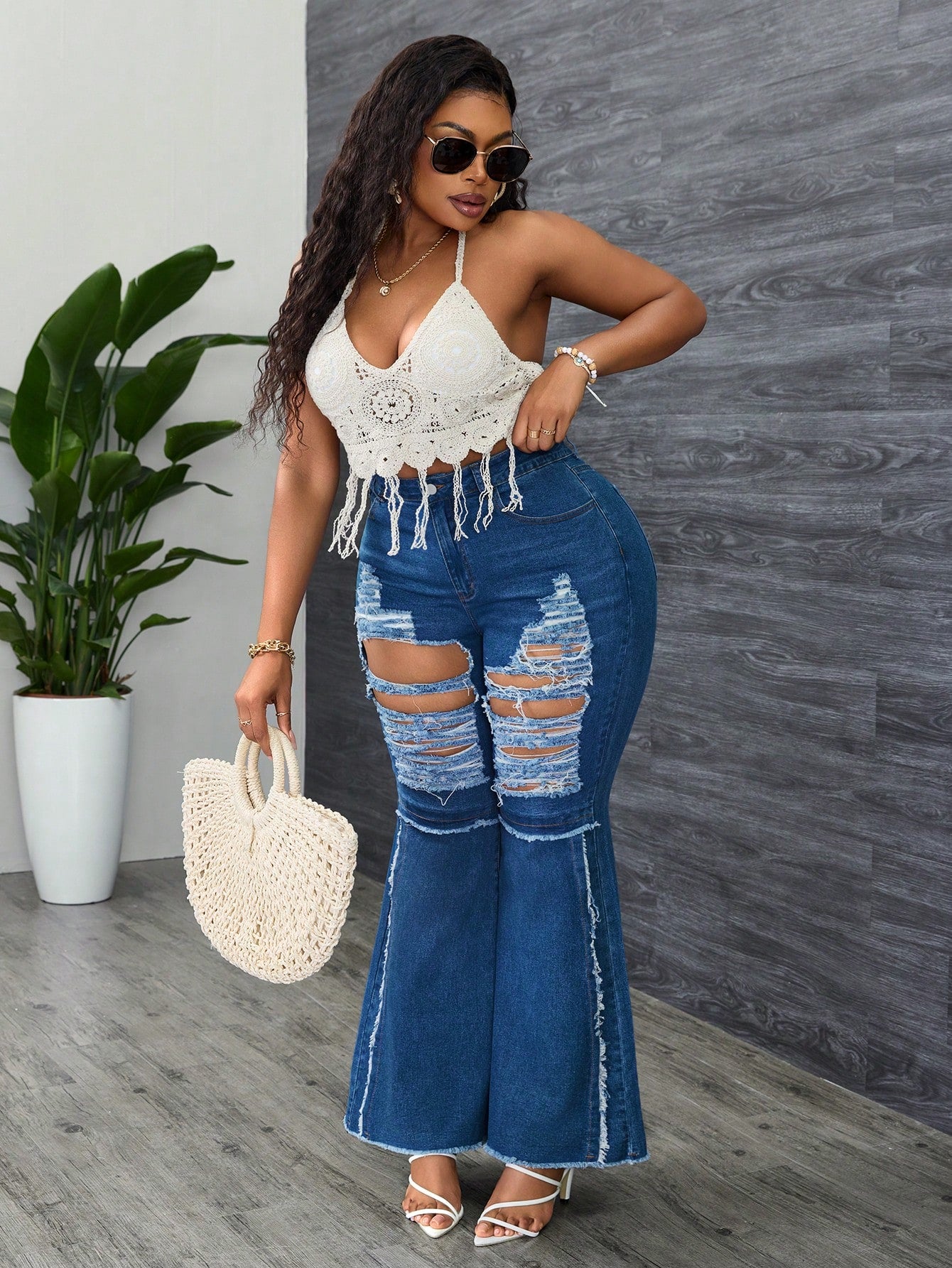 SXY Plus Size Women Distressed Fringe Hem Flare Jeans, Stretchy Sexy Denim Pants Boho Style Vacation