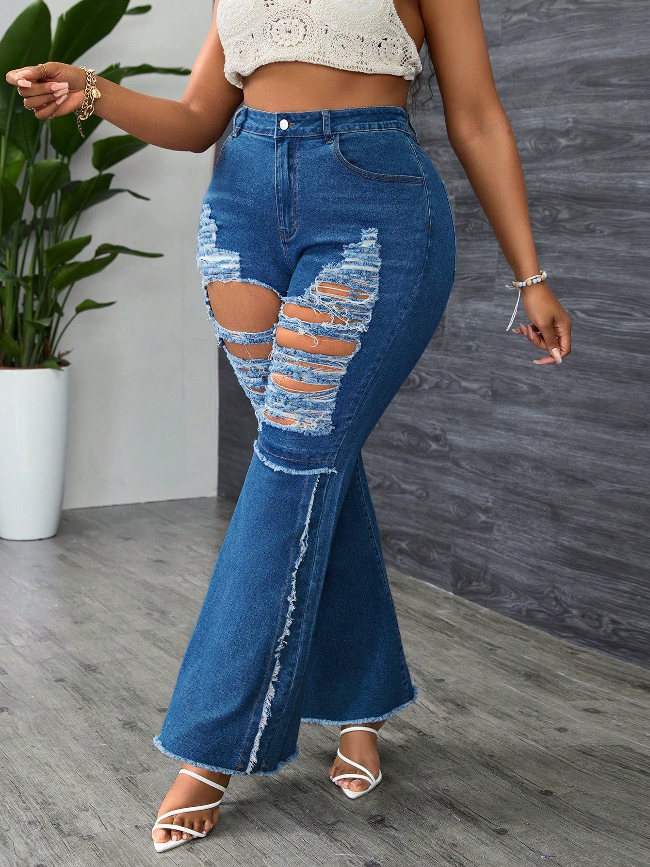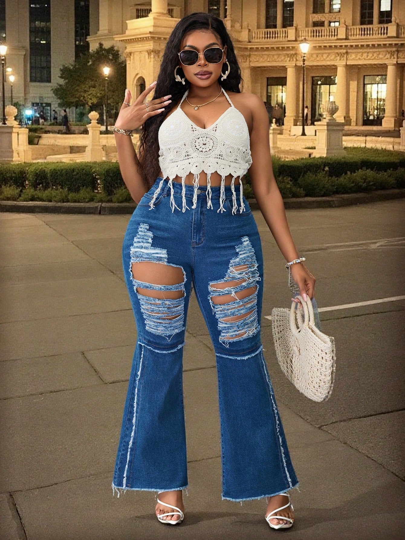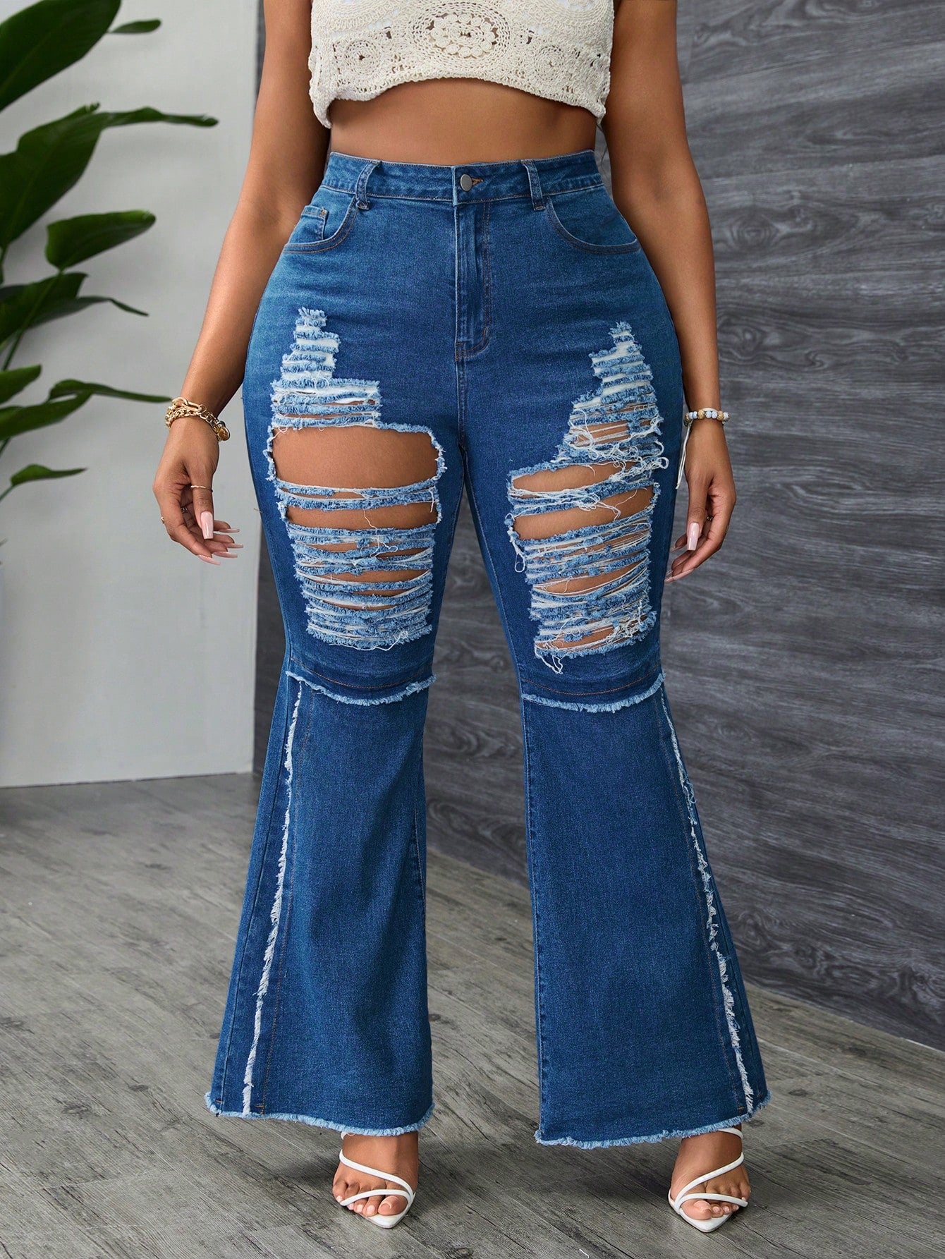 SXY Plus Size Women Distressed Fringe Hem Flare Jeans, Stretchy Sexy Denim Pants Boho Style Vacation
