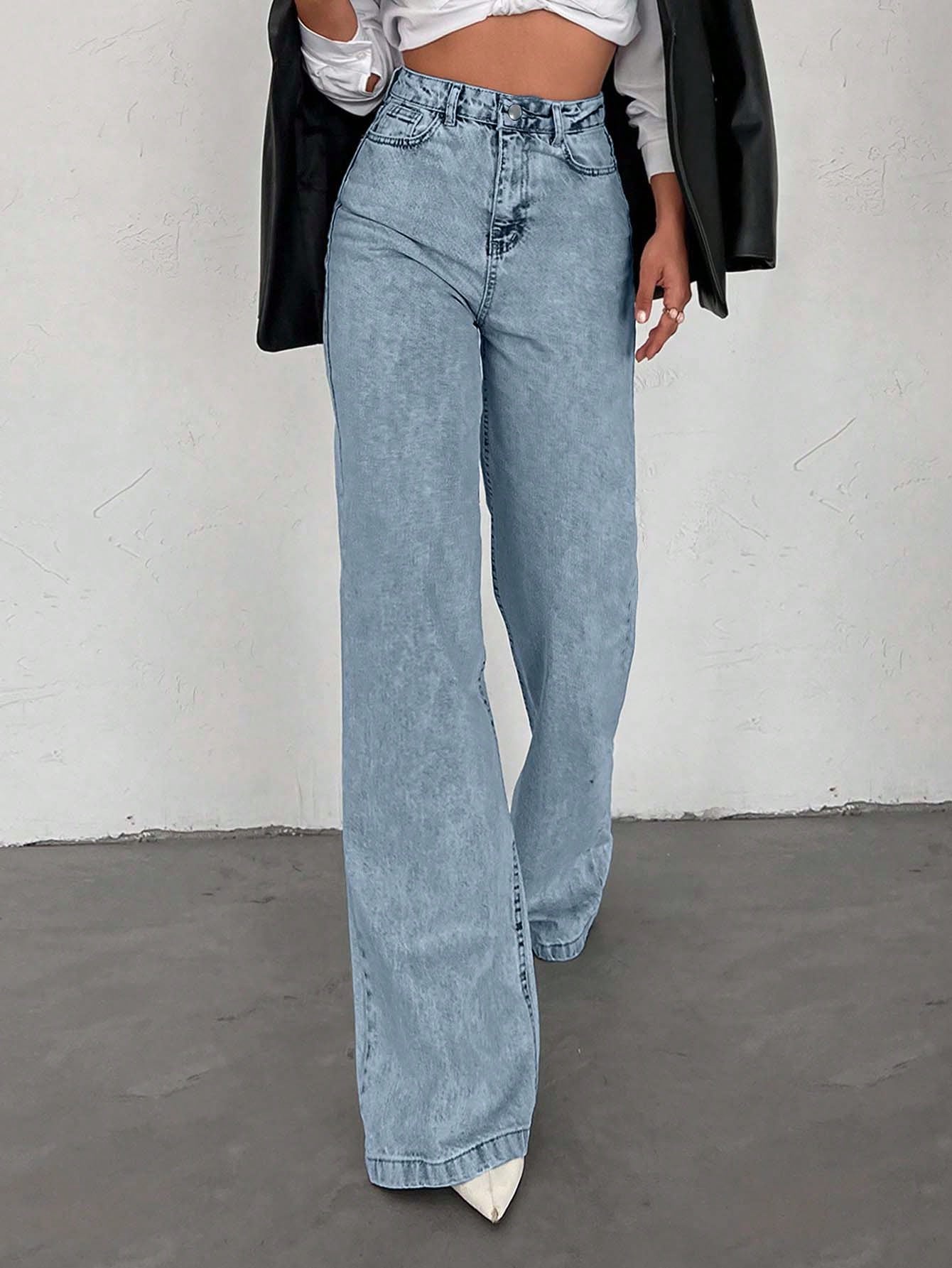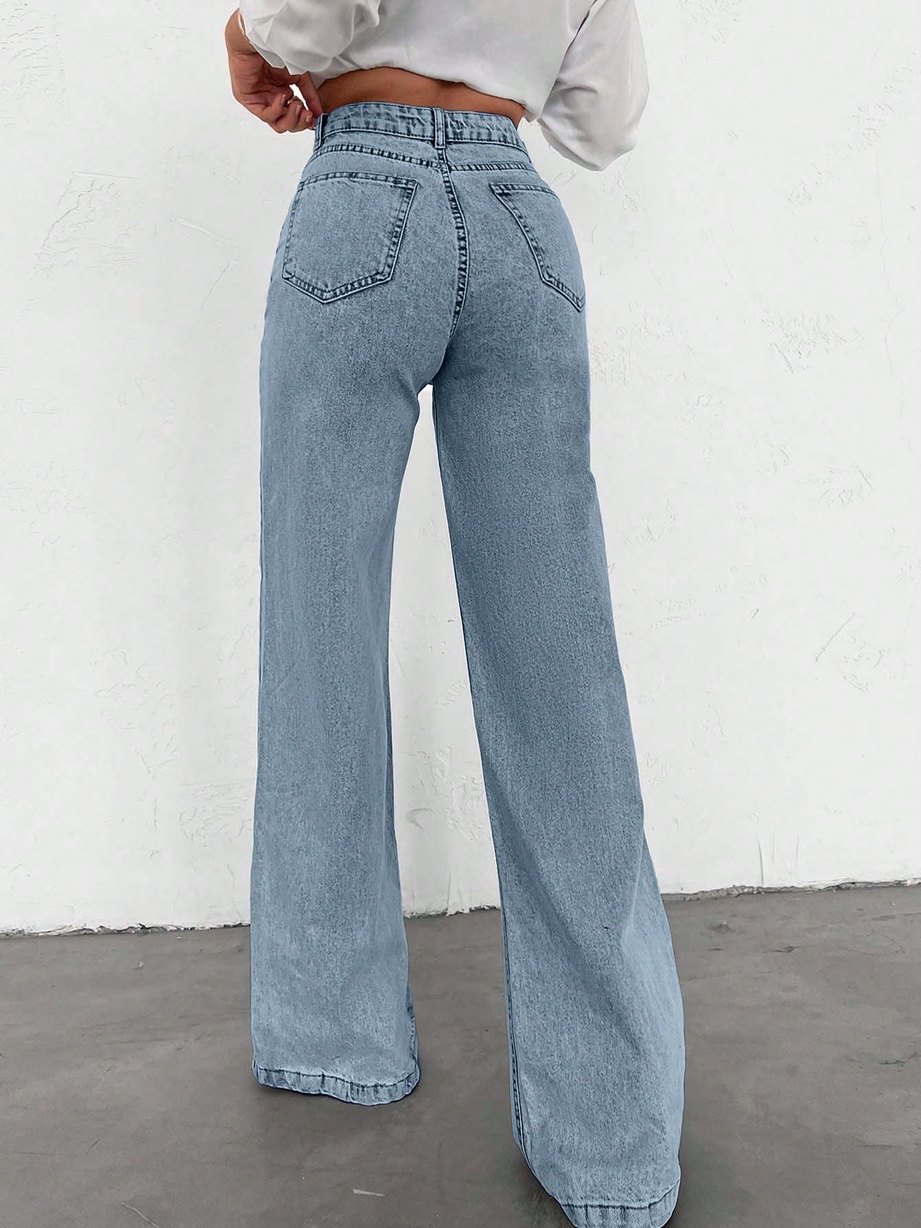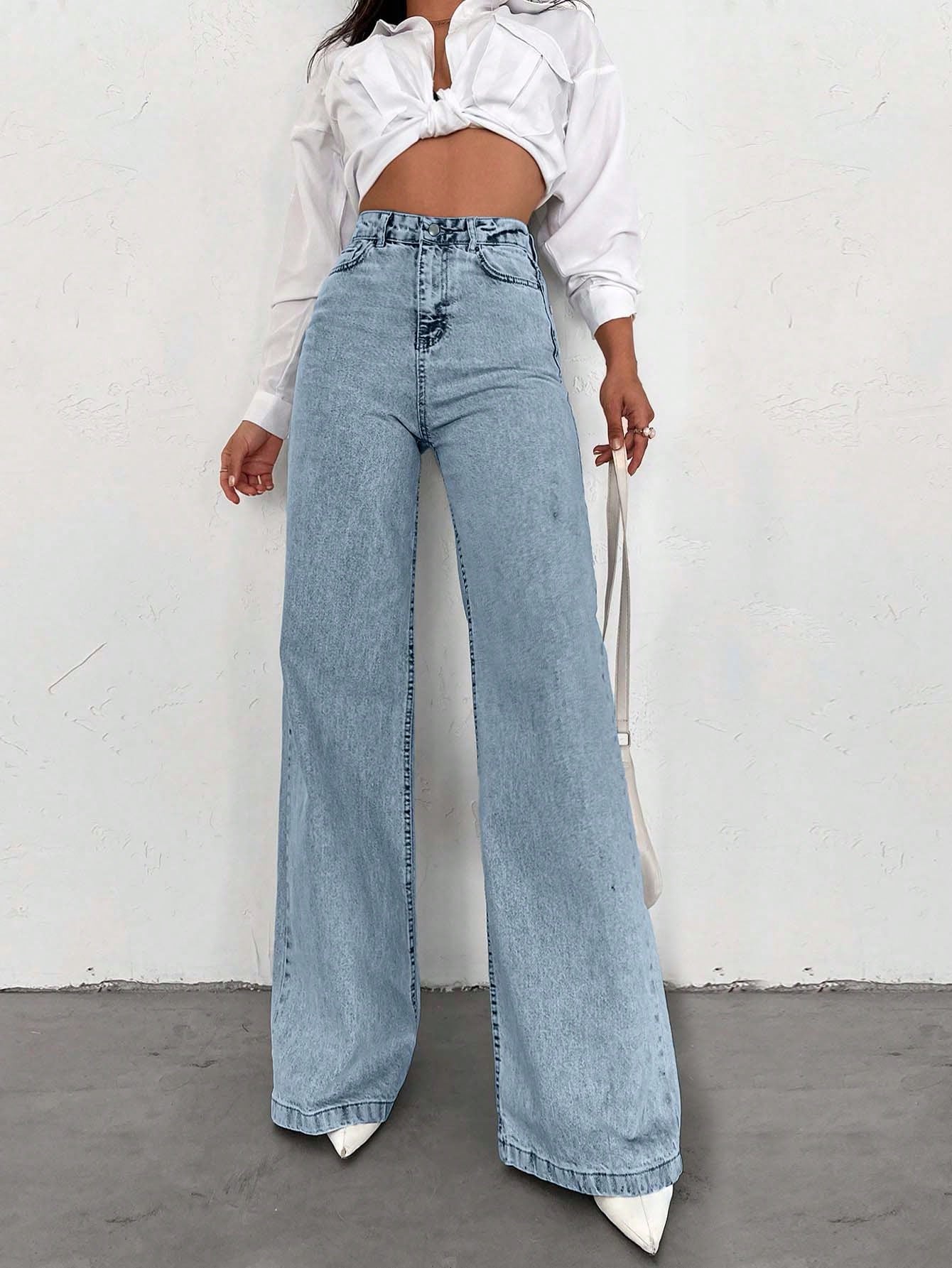 بنطال جينز طويل، مصنوع من القطن بنسبة 100%، بخصر عالٍ، وأرجل واسعة، وحافة طويلة.