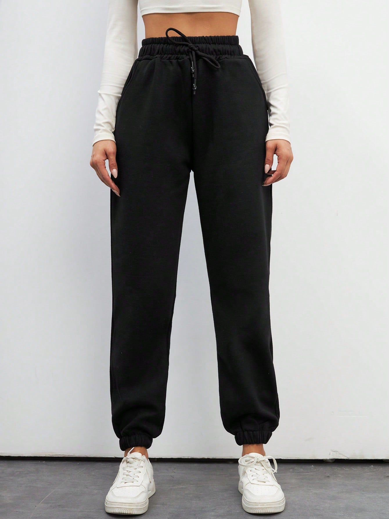 بنطال رياضي نسائي طويل من القطن بلون موحد، بخصر برباط.